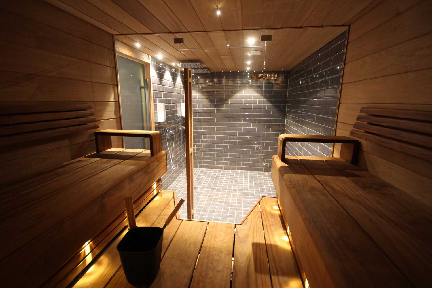 • Sauna (finská sauna) je suchovzdušná sauna, kde je vlhkost vzduchu cca 5-25 procent a teplota stoupá na 70-110 stupňů Celsia. Optimální teplota je 80-90 stupňů. Teplo v sauně se reguluje poléváním nahřátých kamenů vodou. Doporučuje se v něm 2-3x vyhřívat do maximálního vypocení. Před první procházkou se tělo navlhčí ve sprše a po opuštění sauny se omývá pod studenou sprchou nebo polije vodou. Sauna se doporučuje pro lidi trpící alergiemi, záněty dutin, artritidou, migrénami, bolestmi zad. Malým dětem, těhotným ženám a starším lidem se doporučuje, aby jej nezneužívali.