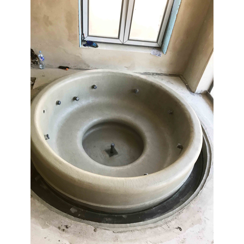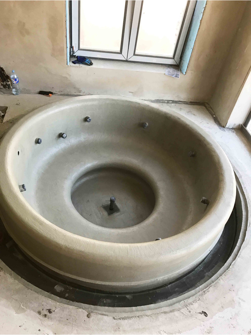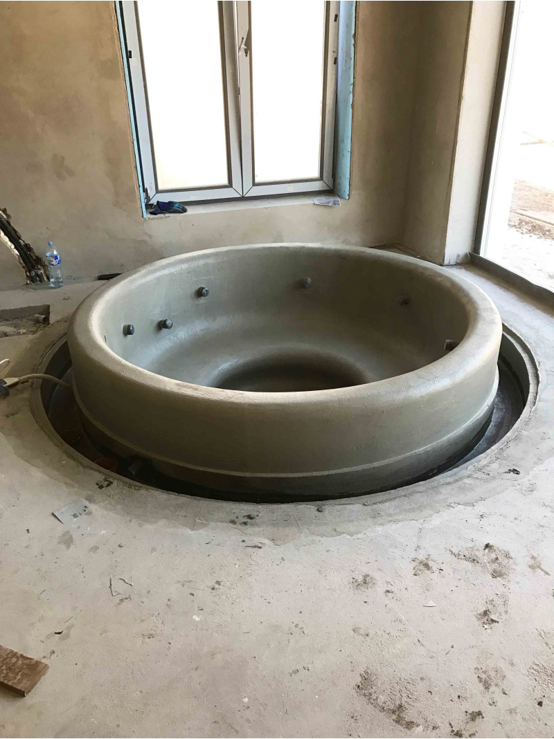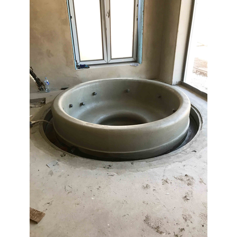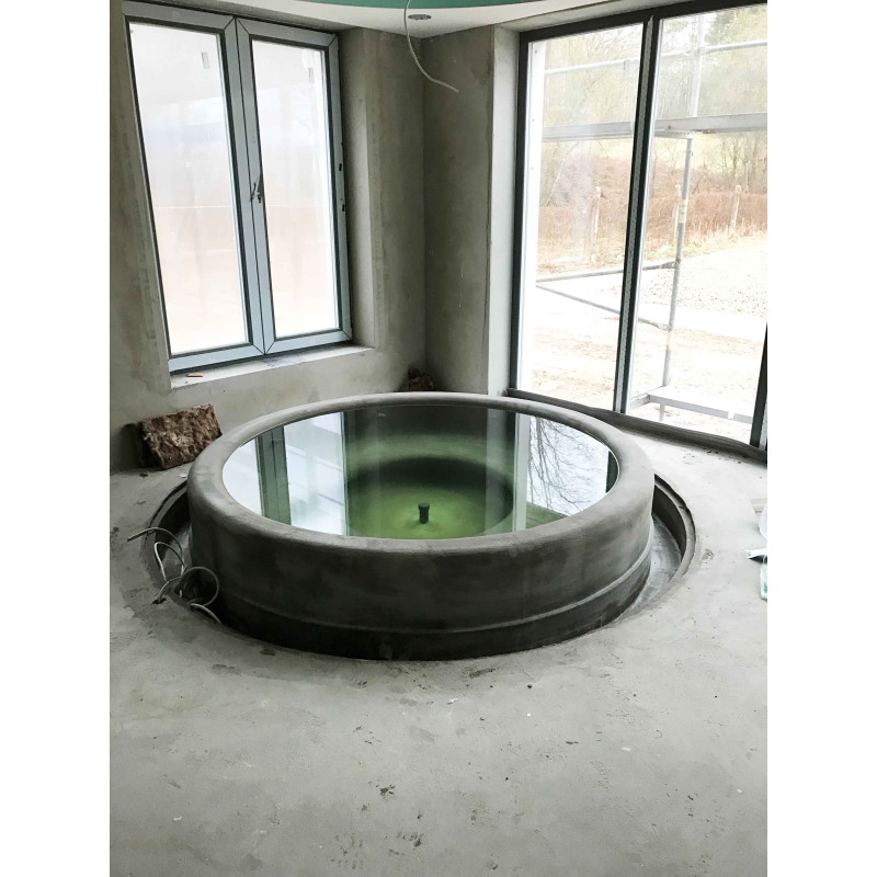 Bazén je kulatého tvaru, s posezením kolem celého bazénu. Vnitřní povrchy bazénu byly tvarovány kontinuálním řezáním polystyrenu XPS 300. Je to extrémně pevný a odolný proti vlhkosti a tlaku.