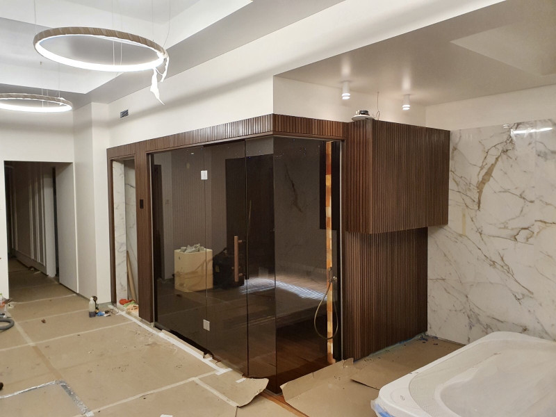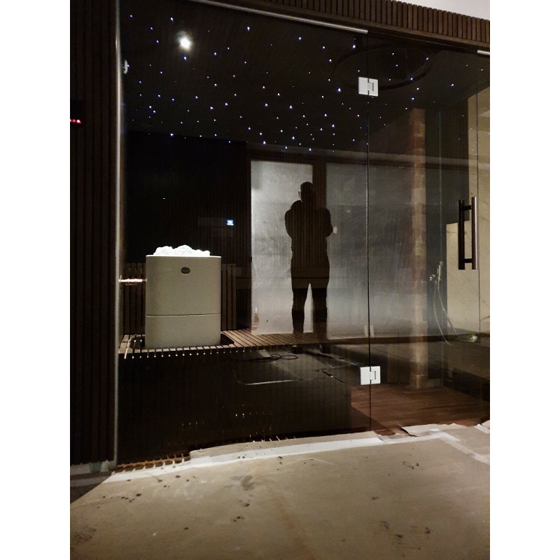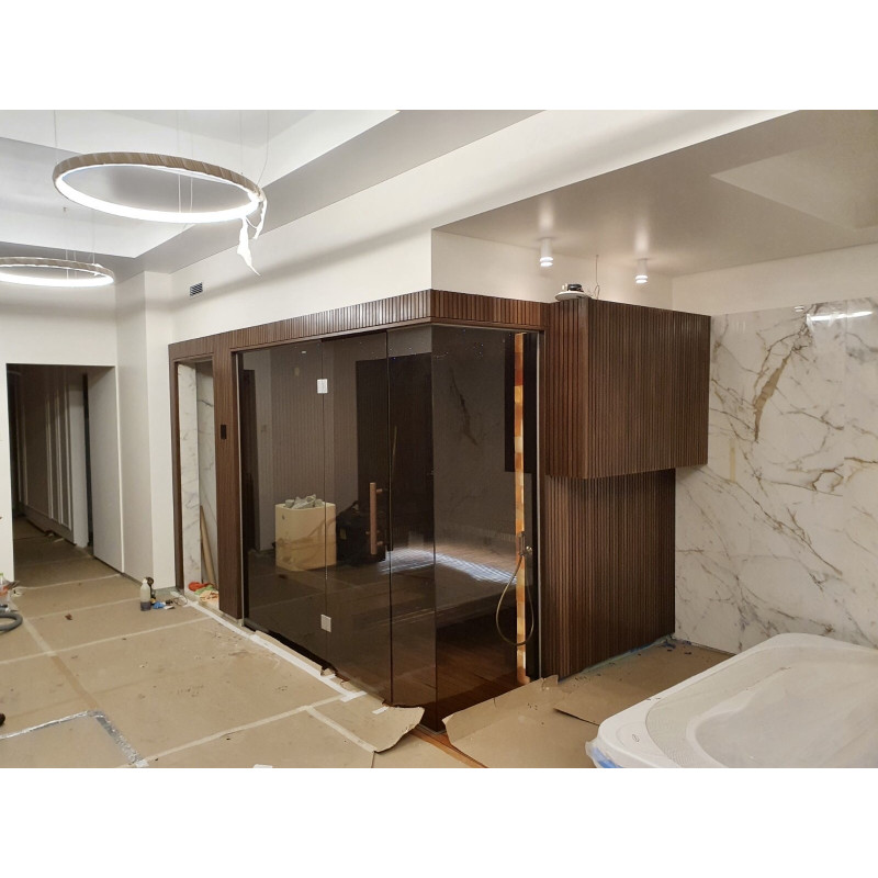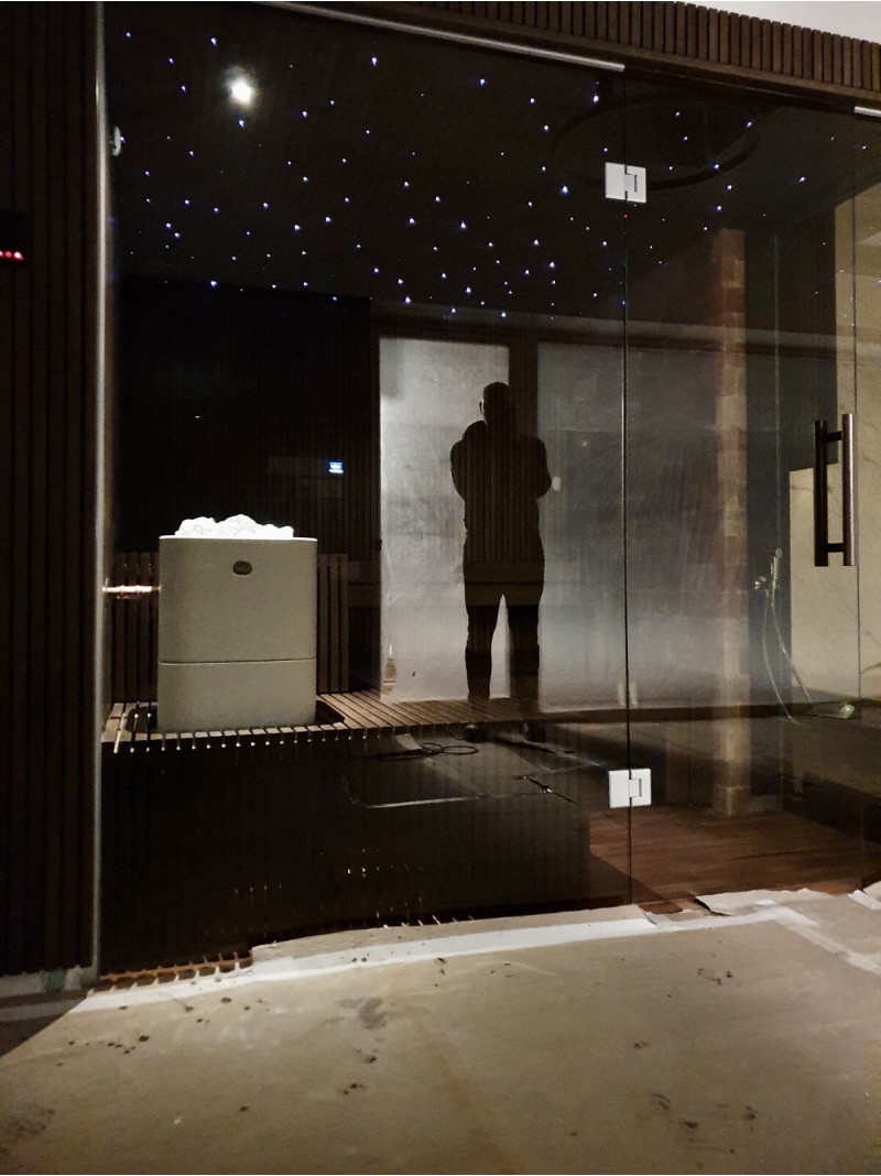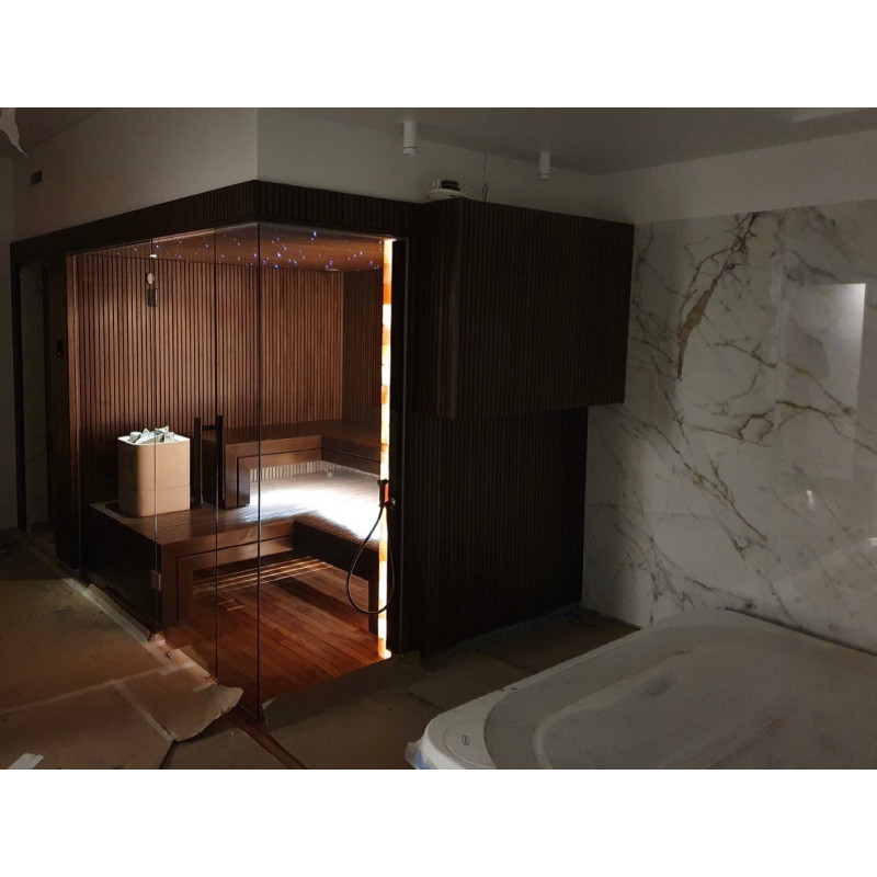 Ve Vilniusu byl realizován individuální projekt sauny. Vybrané lipové dřevo pokryté přírodním voskem s barvou. Bílé topidlo Tulikivi Kuura 2 se samostatným parním generátorem tureckých lázní (Harvia 4,5 kW) zavedeným do topidla. Tento systém produkuje velmi vysoké množství sekundární vlhkosti.