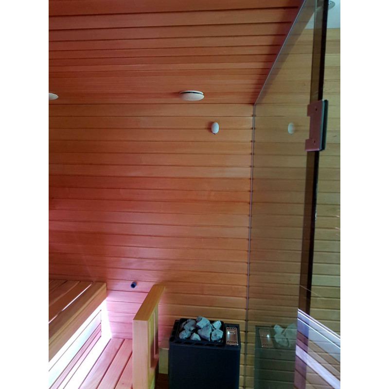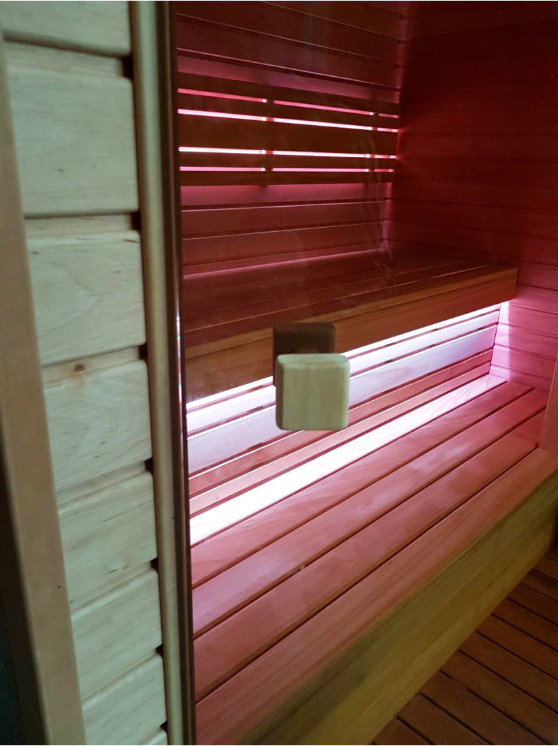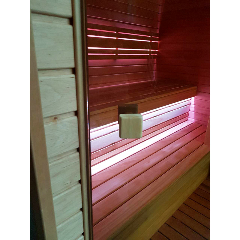 Osvětlení sauny je velmi důležitým detailem, který v sauně působí napůl relaxačně. Pod lavicemi a opěradly se nachází barevné LED RGB osvětlení, jehož barvu si můžete kdykoliv změnit. Sauna je také vybavena optickým systémem bílého osvětlení "Moon".