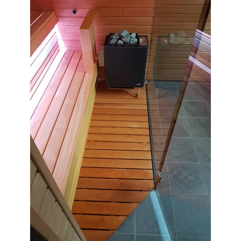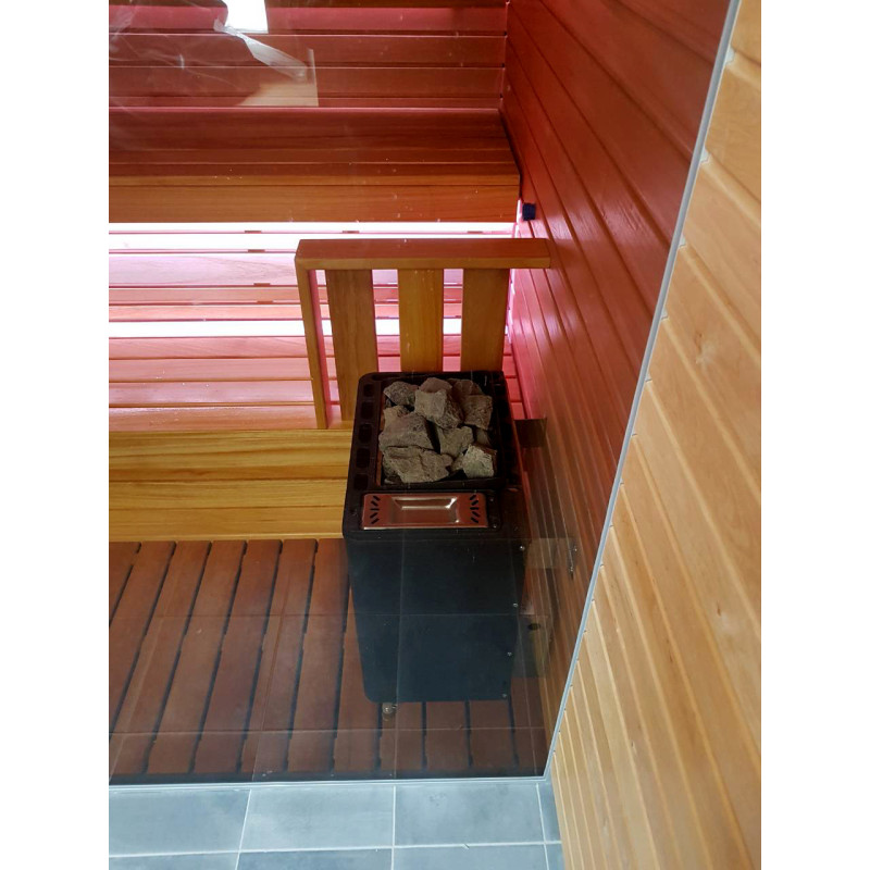 Namísto tradičních dveří a stěn má tato kombinovaná sauna moderně vypadající vitrínu z tvrzeného tónovaného skla. Taková vitrína je moderní a poskytuje pocit prostoru.