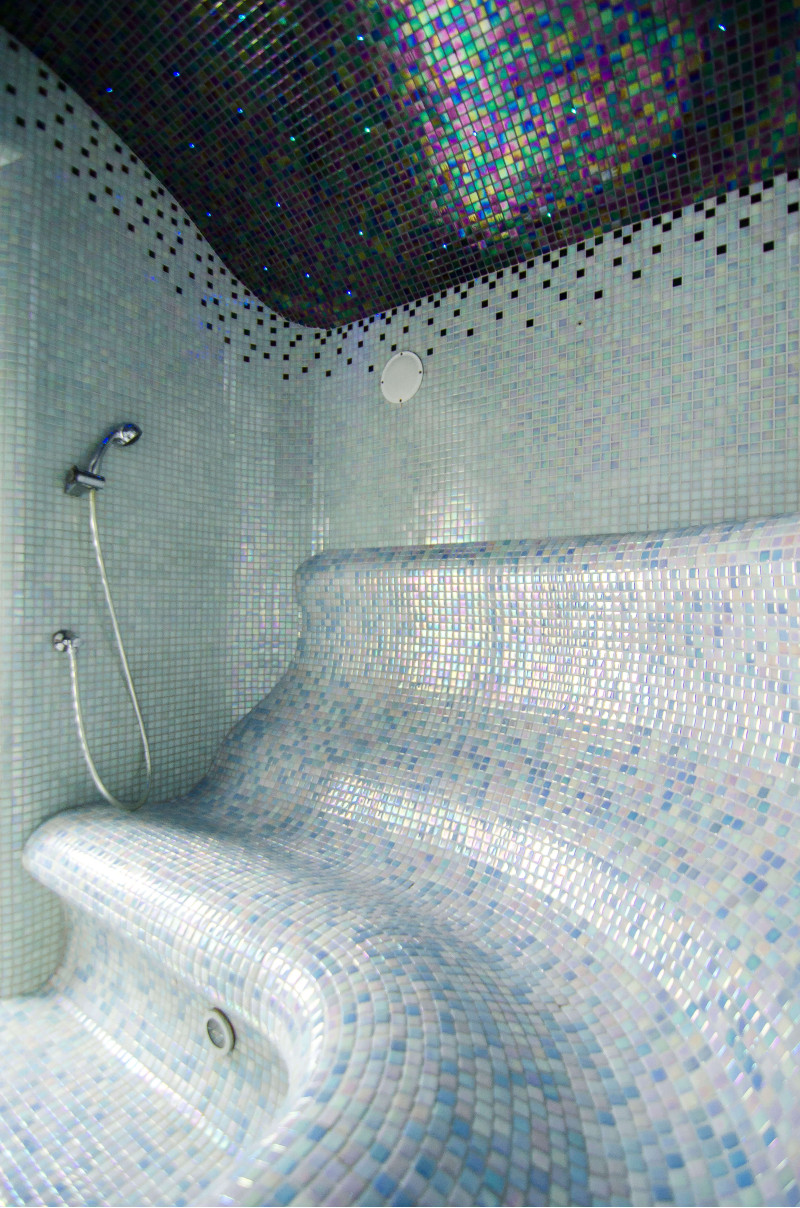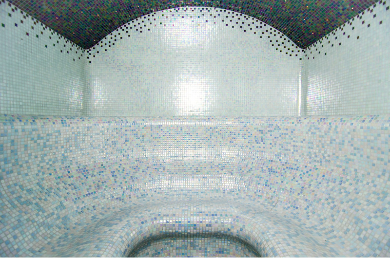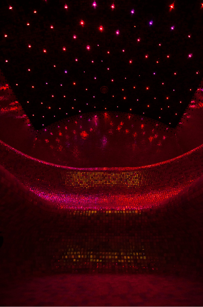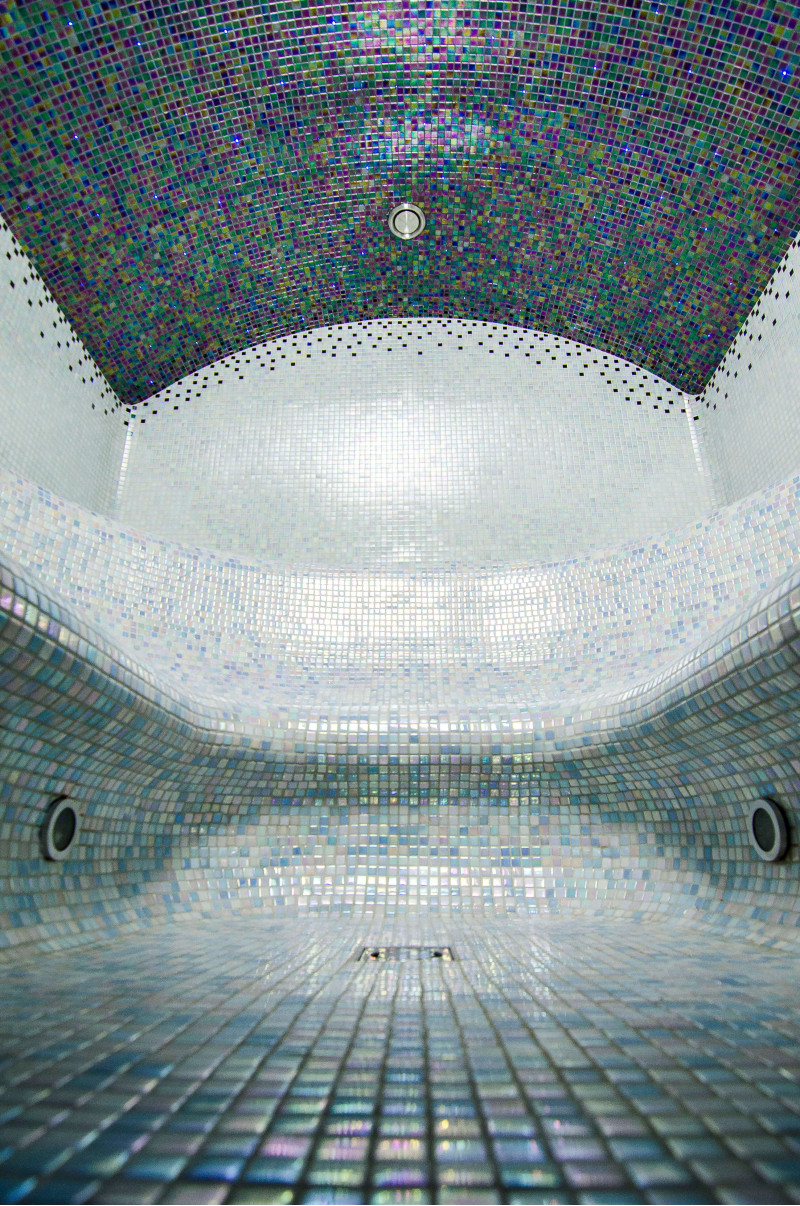 Lavičky, podlahy a stěny zdobí pastelové mozaikové dlaždice. Strop je pokryt barevnými dlaždicemi, které spolu se stropním osvětlením poskytují ještě působivější výhled.