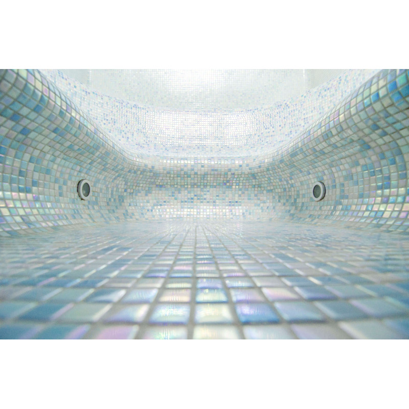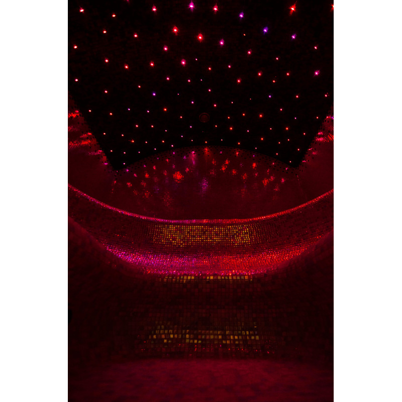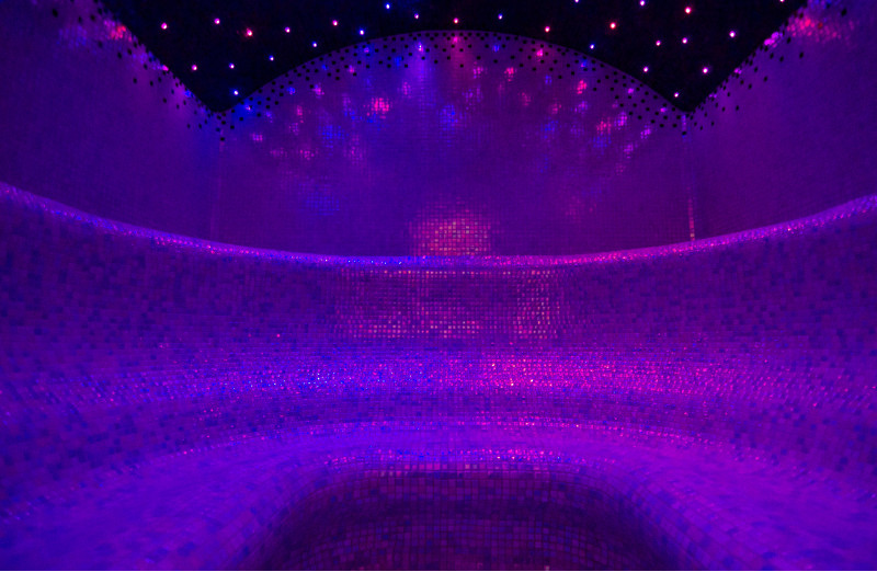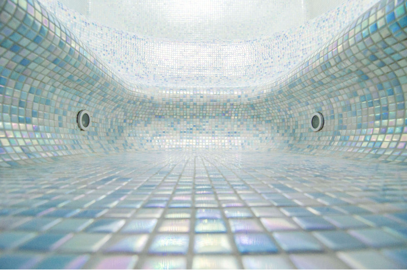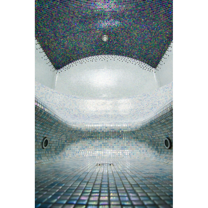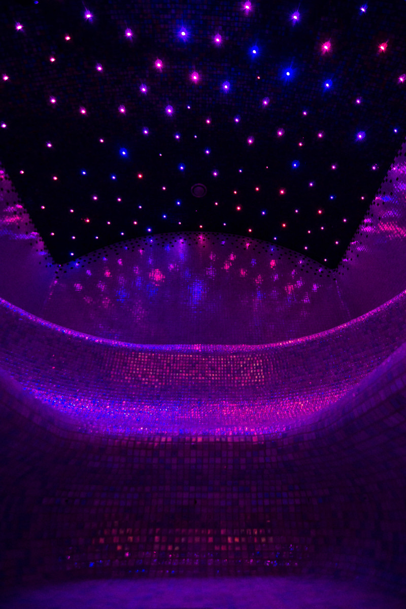 Lavičky, podlahy a stěny zdobí pastelové mozaikové dlaždice. Strop je pokryt barevnými dlaždicemi, které spolu se stropním osvětlením poskytují ještě působivější výhled.