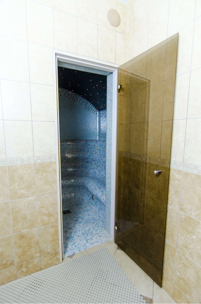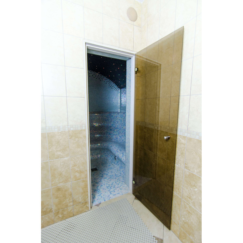 Skleněné dveře jsou vyráběny na individuální objednávku. Dveře jsou odolné proti vlhkosti a teplotním výkyvům. Rám dveří - mramor.
