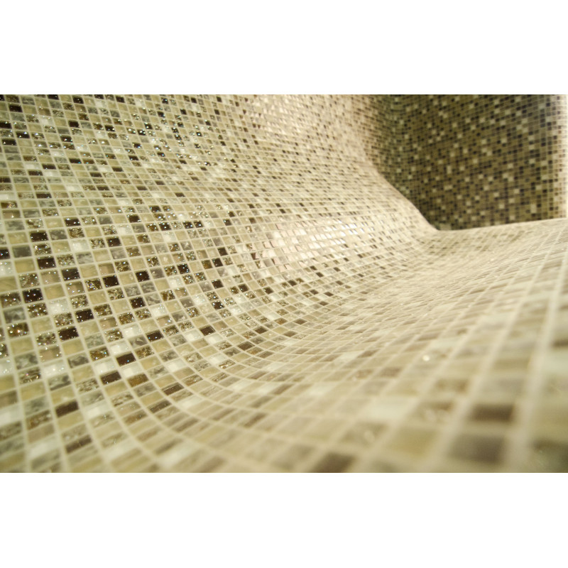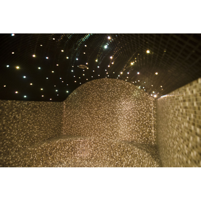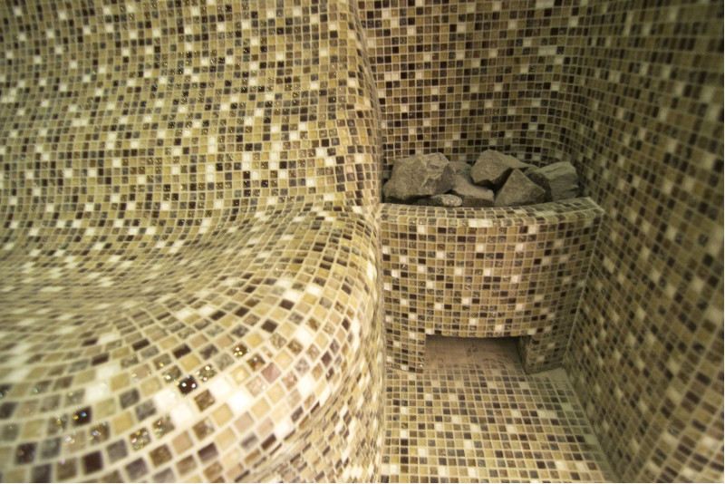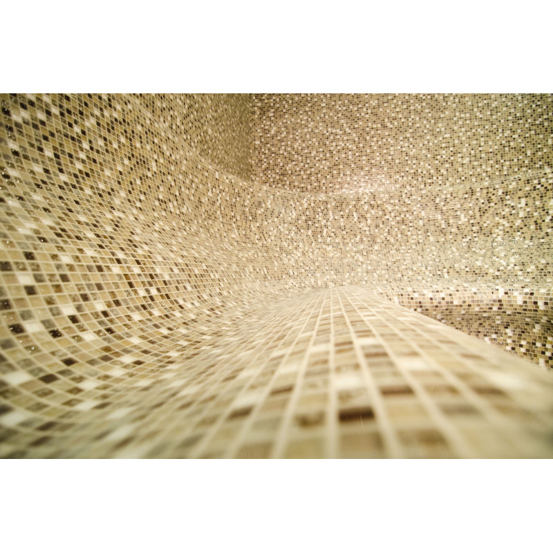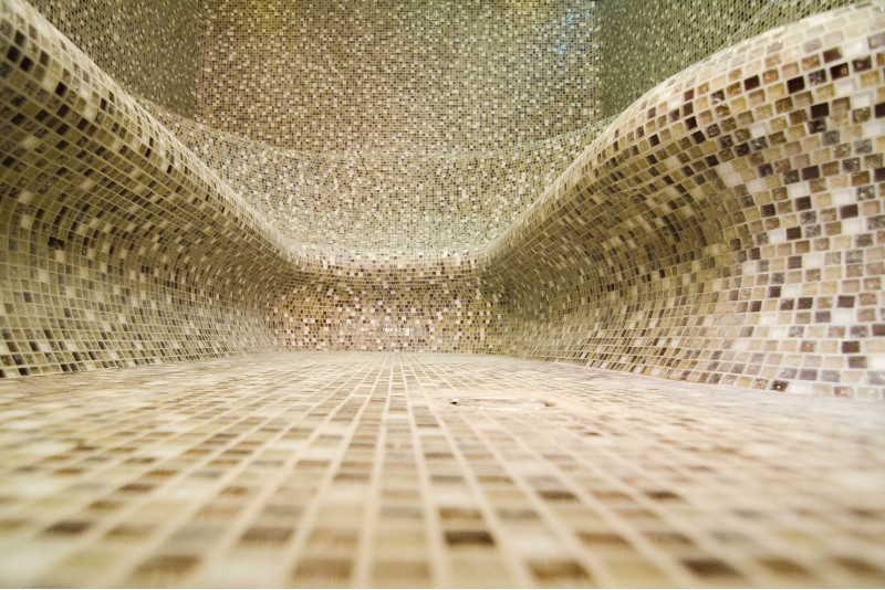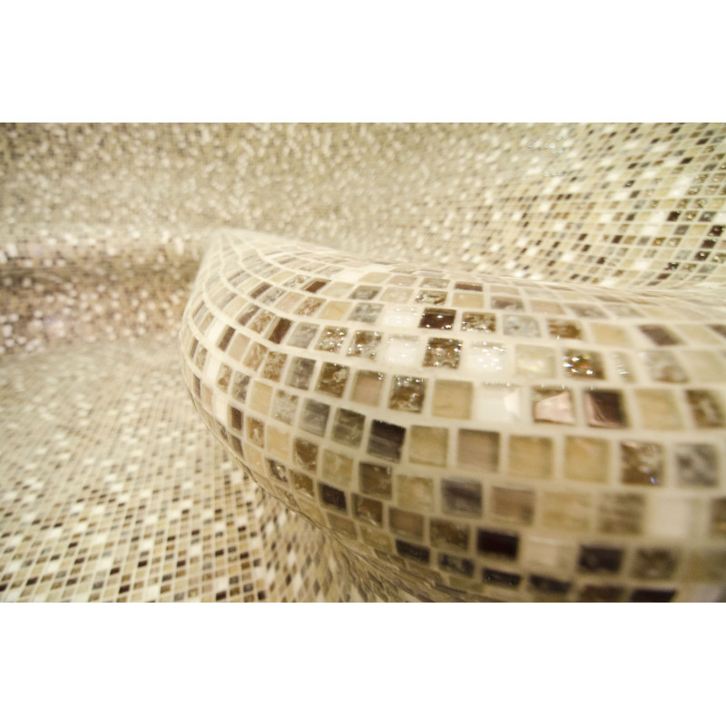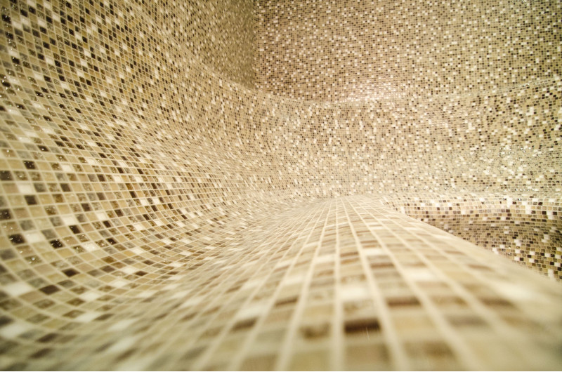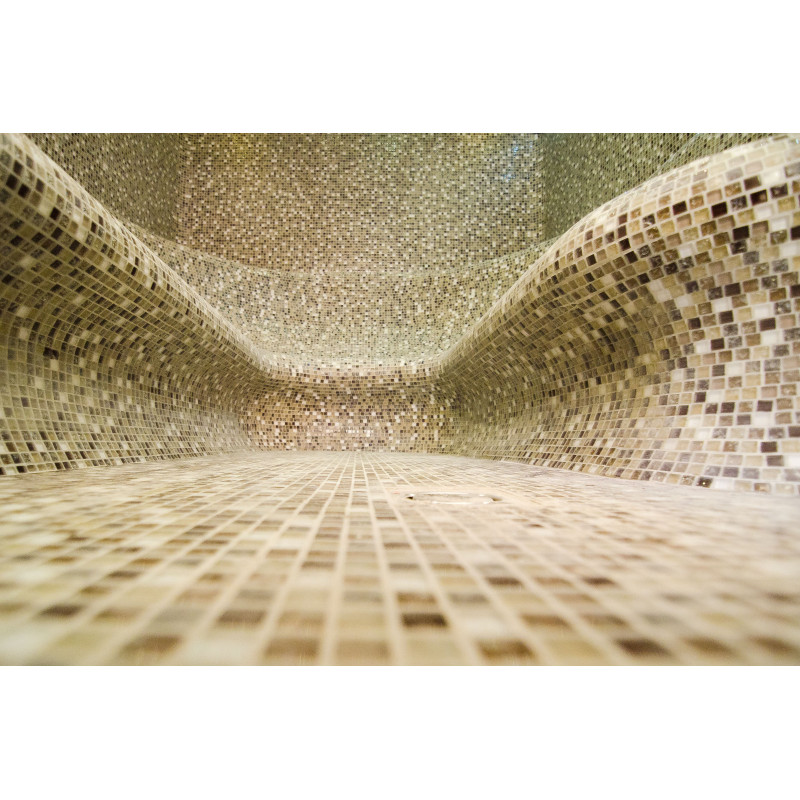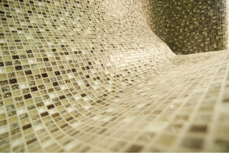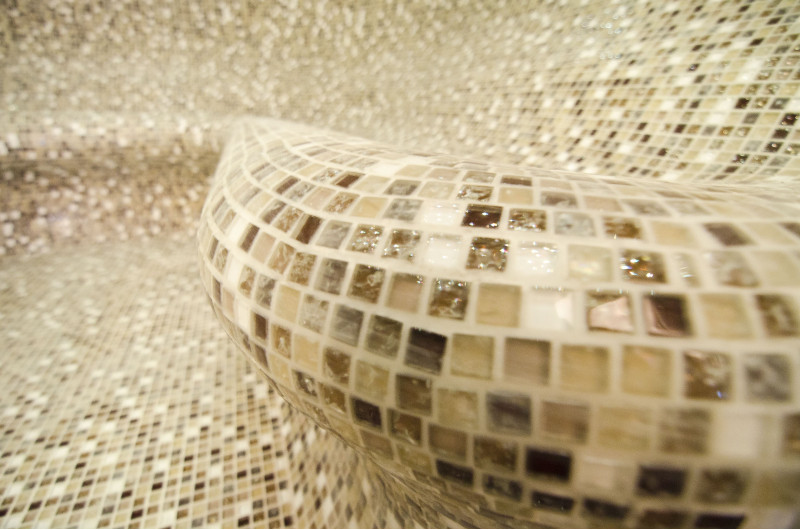 Dokončovací práce - stěny, lavice, podlahy zdobené drobnou mozaikou, přírodní barevné obklady.