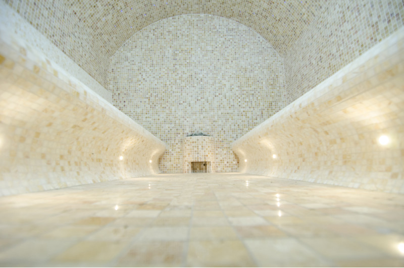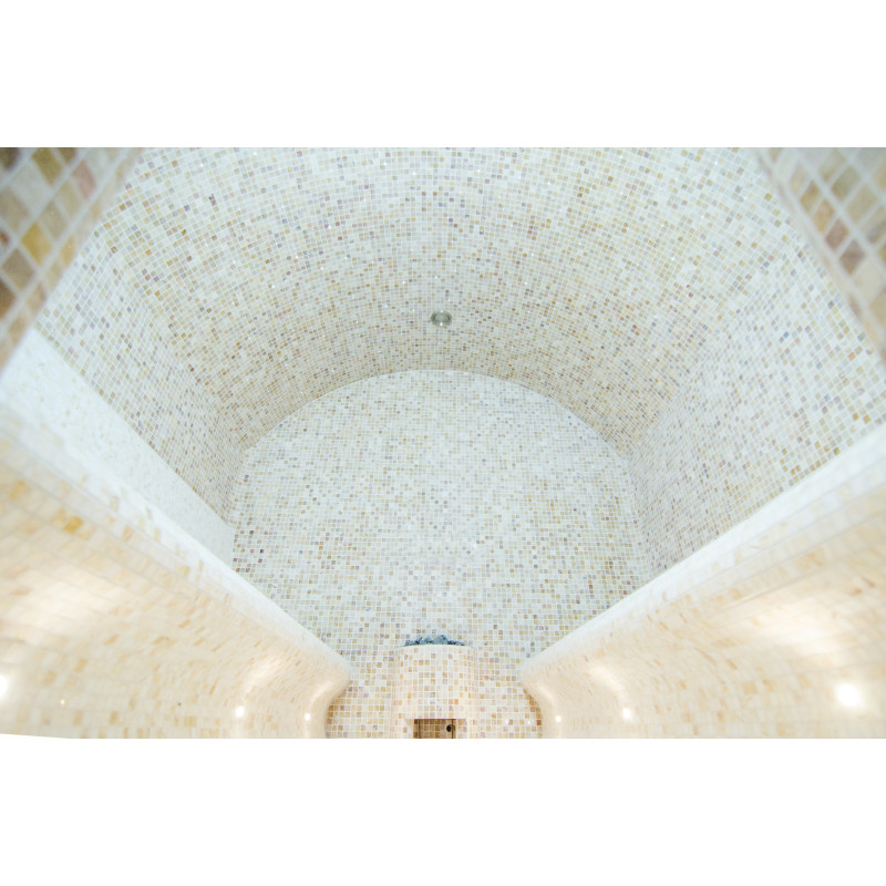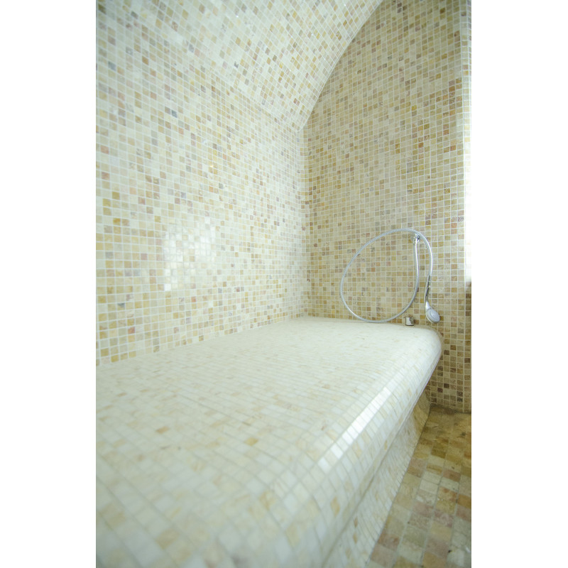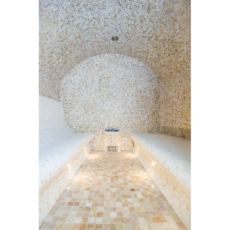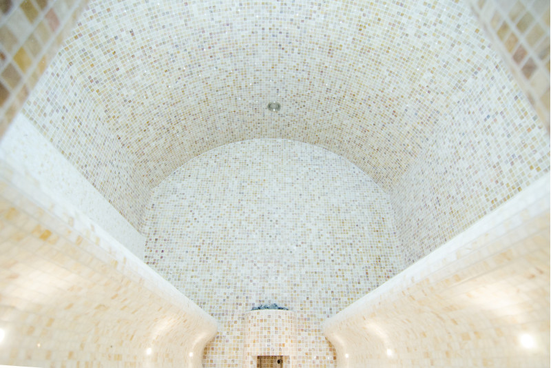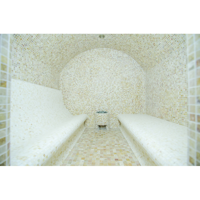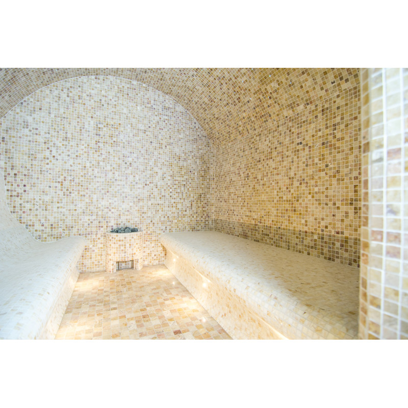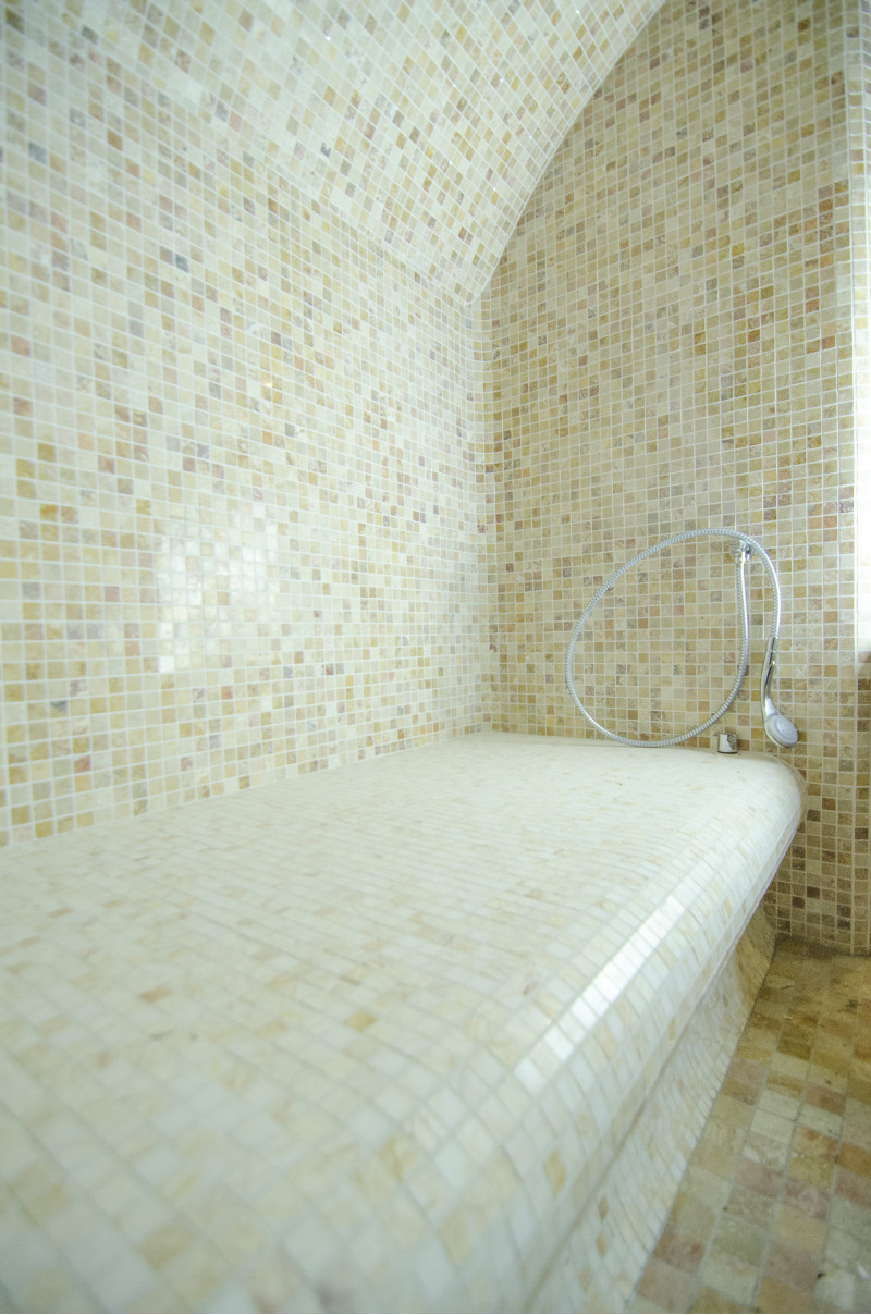 Dokončení - celá saunová místnost a lavice jsou zdobeny mozaikovými dlaždicemi.