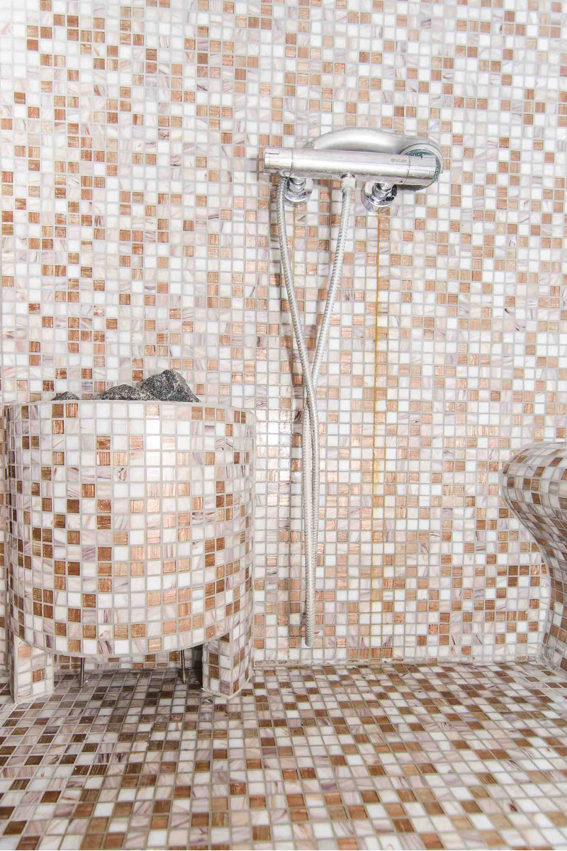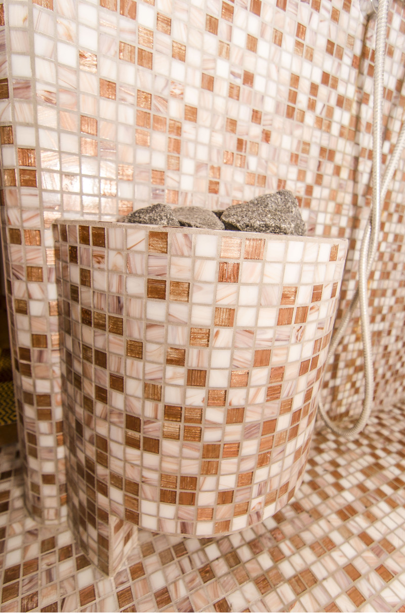 Parní váza plní funkci parní ochranné trubice, kterou se pára dostává do sauny zdobené olivínovými diabasovými kameny.