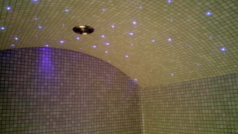Systém osvětlení je "hvězdné nebe". Toto osvětlení vytváří v parní sauně působivý a útulný výhled. Pod lehátky je osvětlení pro osvětlení podlahy.