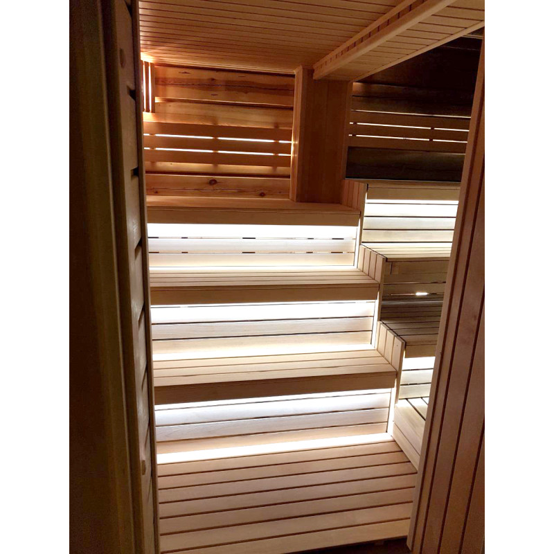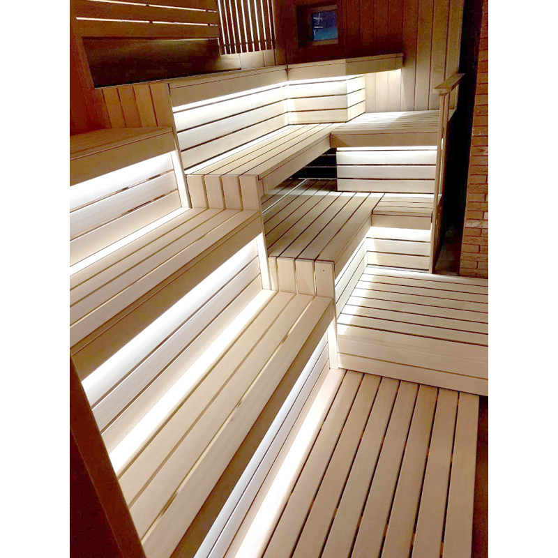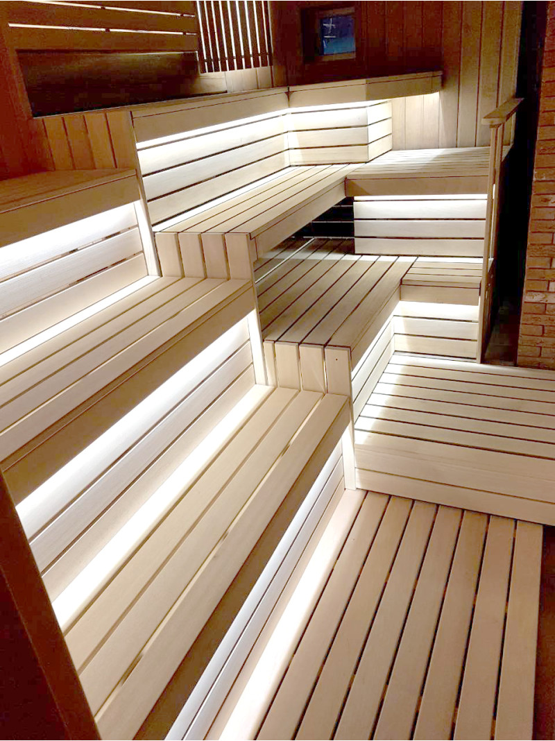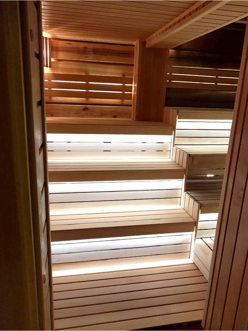 Pod lehátky je instalováno teplé bílé LED osvětlení, které dodává sauně pocit prostoru a útulnosti. Pro nástěnné osvětlení bylo zvoleno svítidlo s odpovídajícím dřevěným krytem.