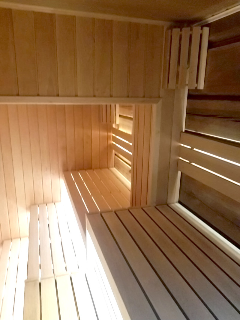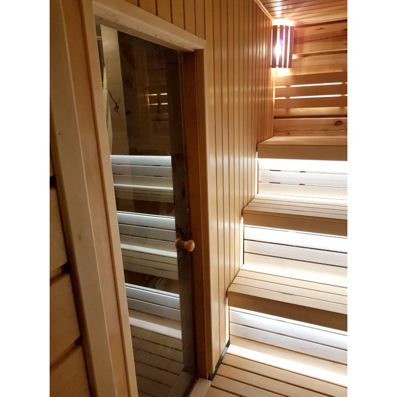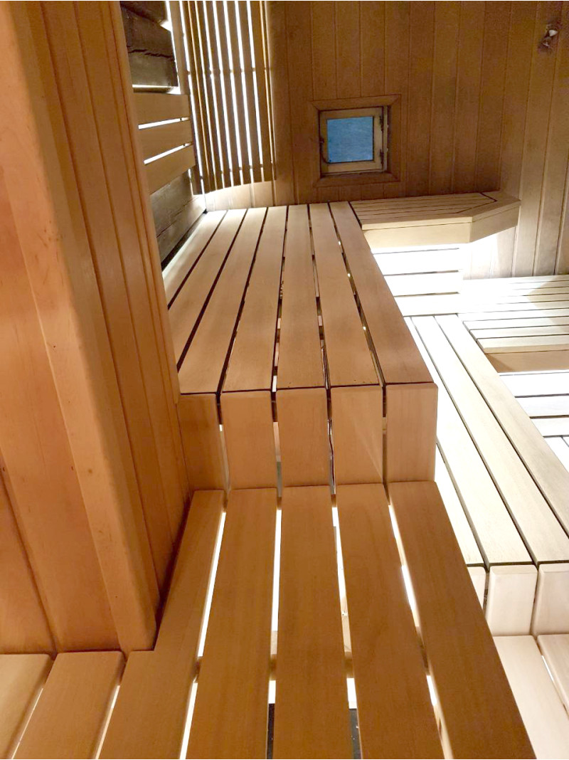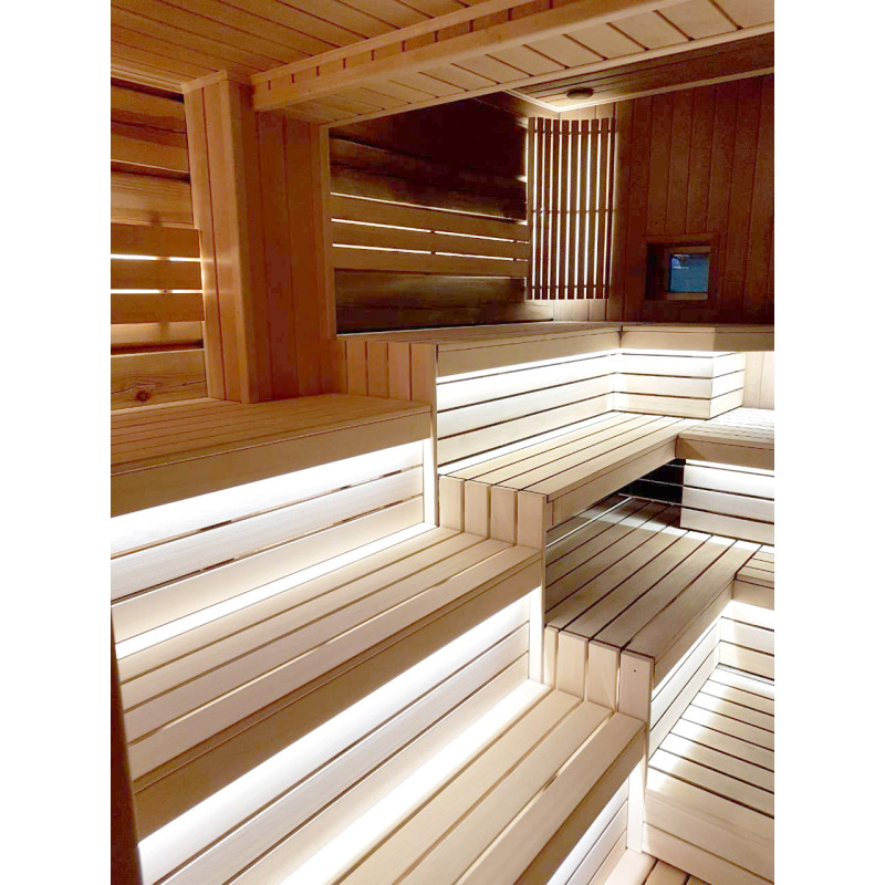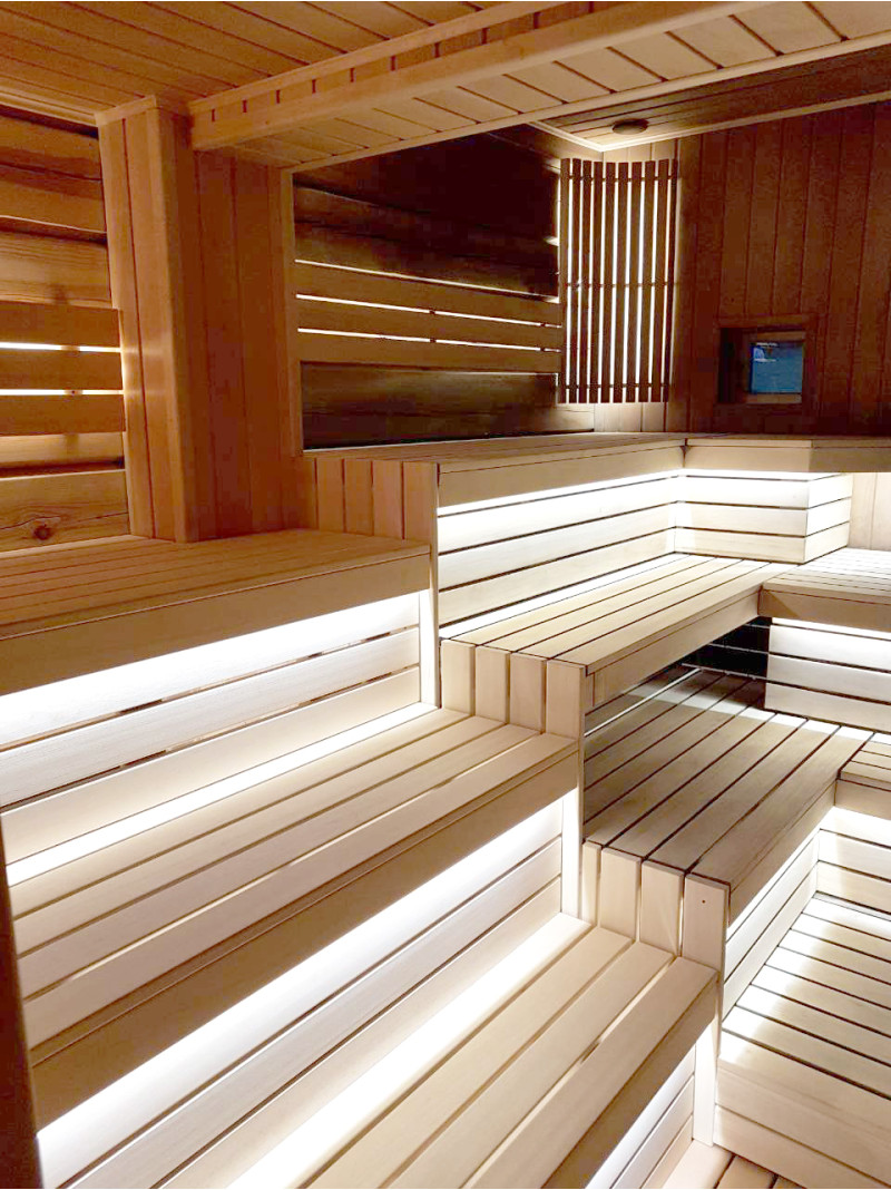 Pod lehátky je instalováno teplé bílé LED osvětlení, které dodává sauně pocit prostoru a útulnosti. Pro nástěnné osvětlení bylo zvoleno svítidlo s odpovídajícím dřevěným krytem.