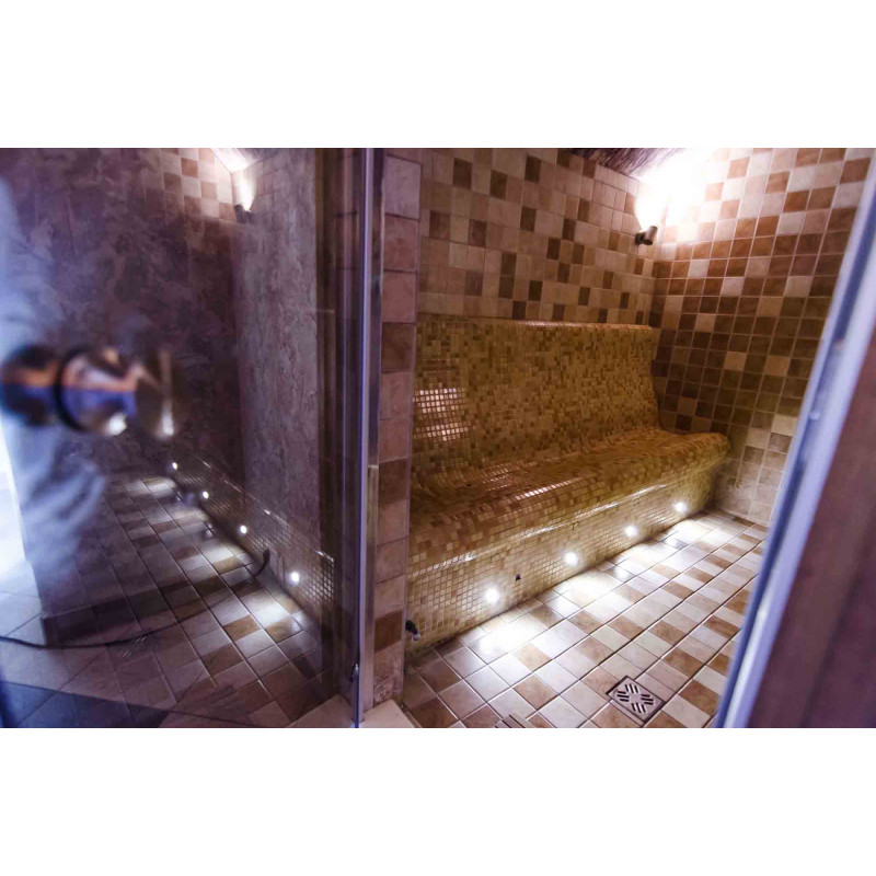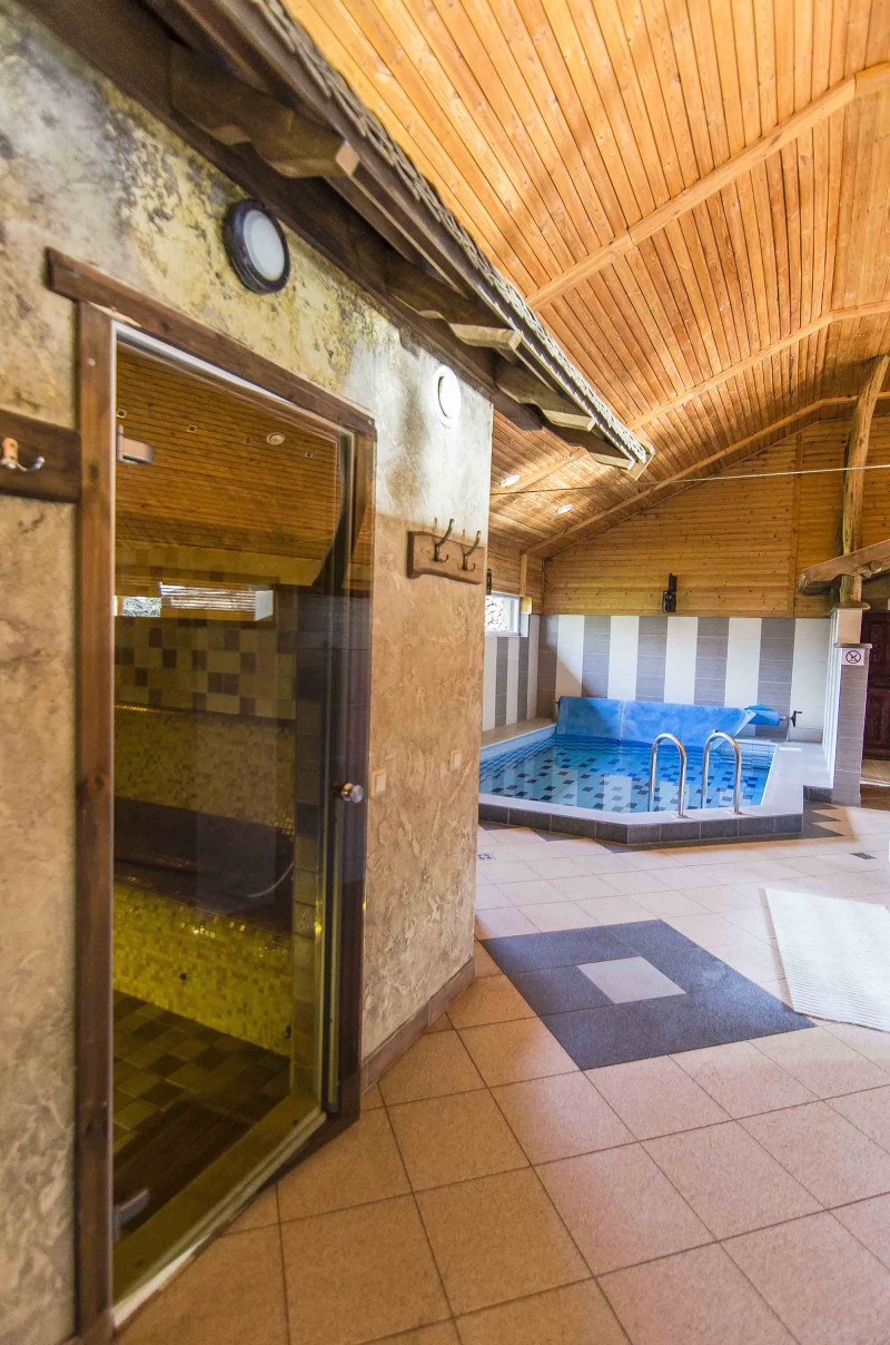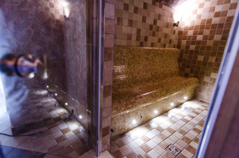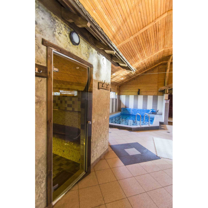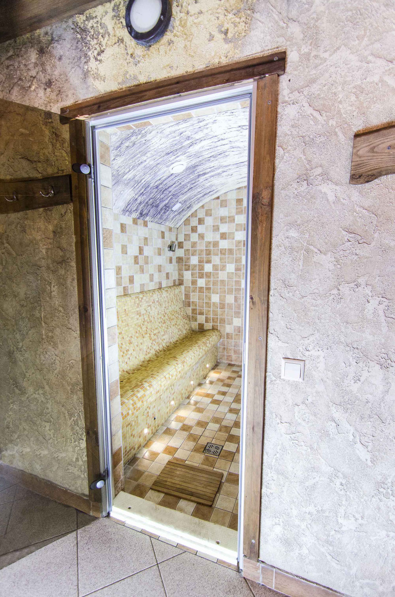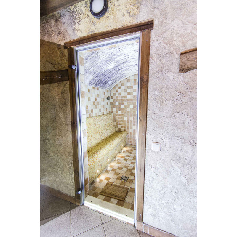 Dveře se starou dřevěnou zárubní byly vyměněny za vhodné do parní sauny - s hliníkovým rámem, tónované, tvrzené sklo. Tento typ dveří a zárubní je odolný vůči teplu a vlhkosti, teplotním výkyvům, nedeformuje se.