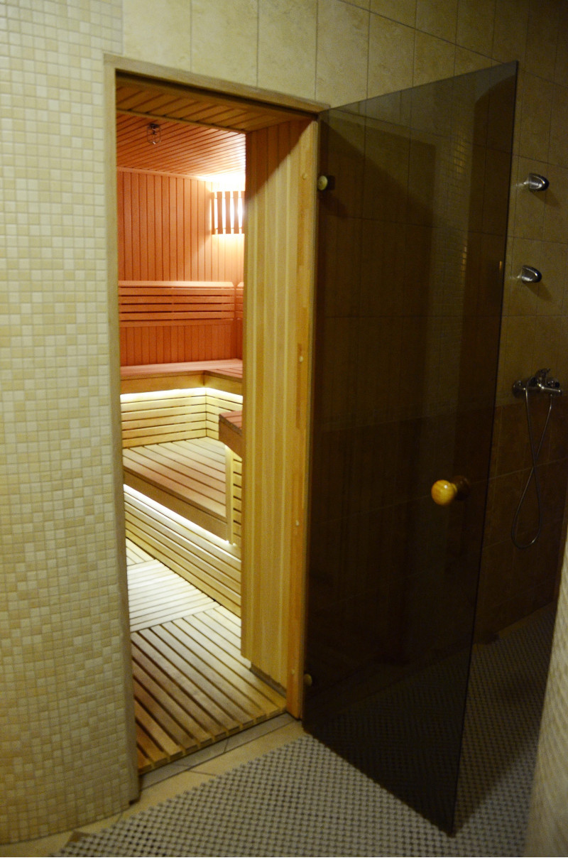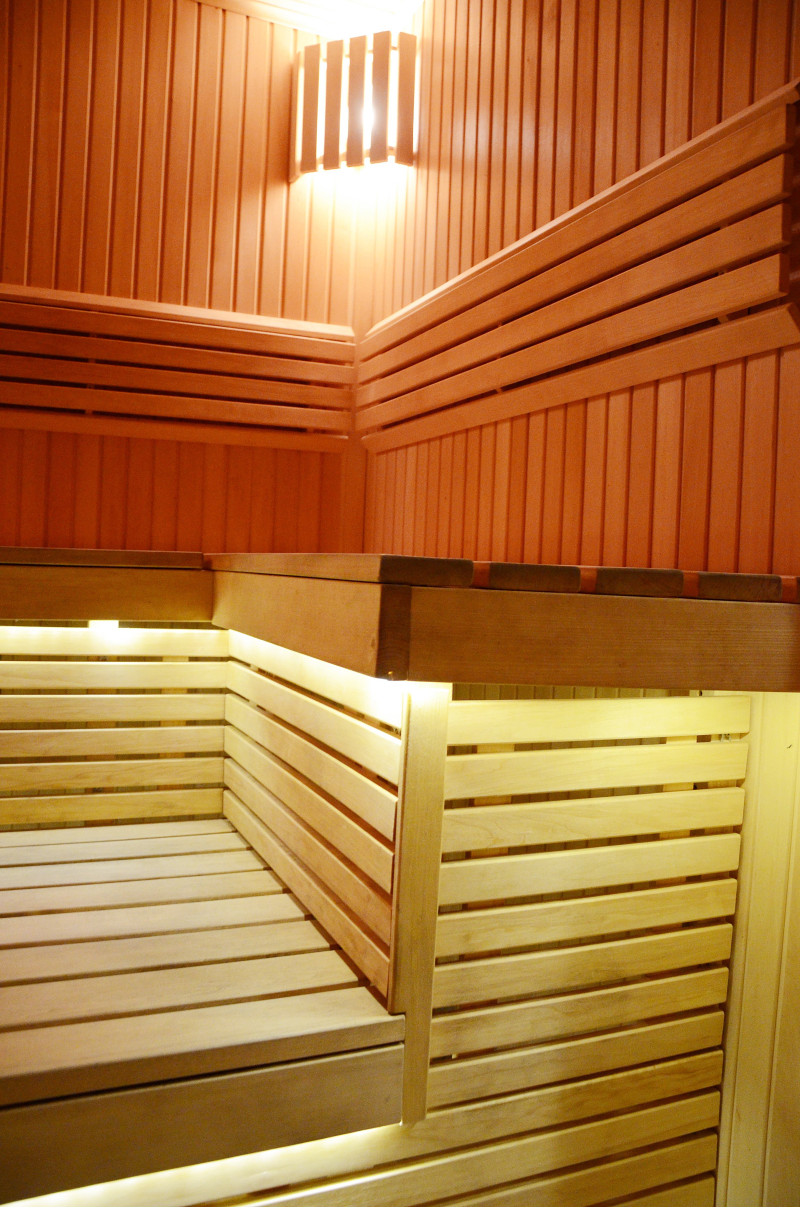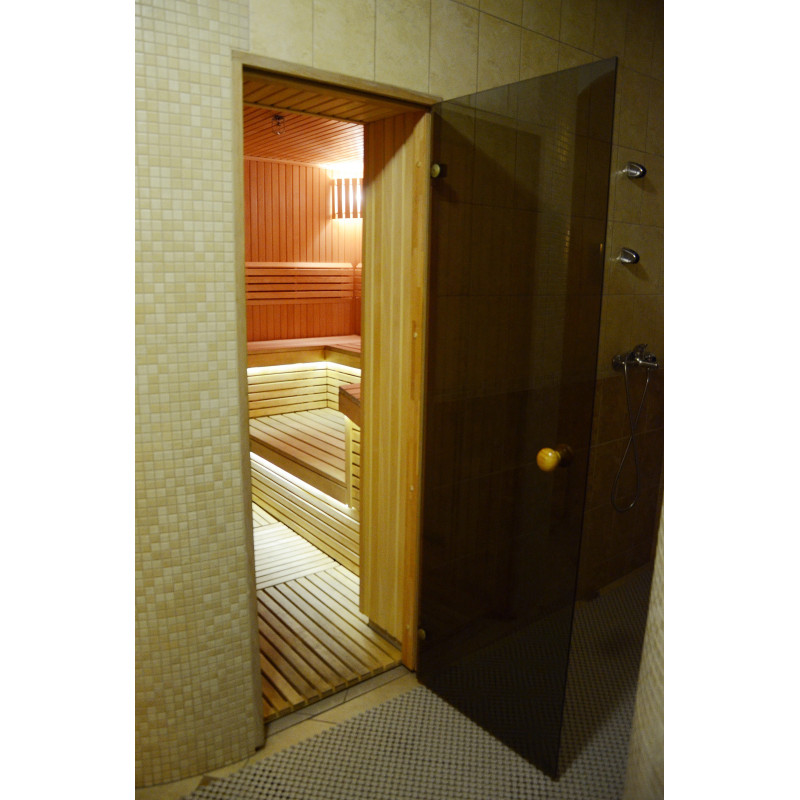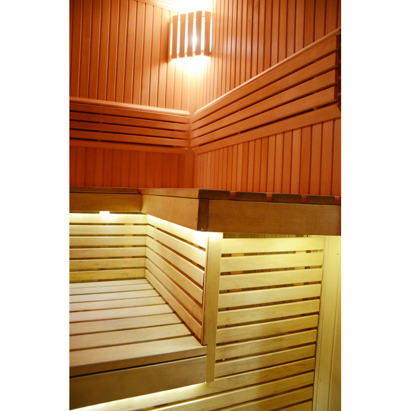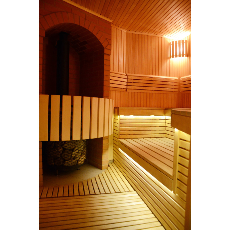 Stěny a lavice sauny jsou vyrobeny z nejkvalitnějšího obkladu z lipového dřeva, které se vyznačuje svou jasnou, krásnou barvou a vyzařuje příjemné přírodní aroma. Dřevěné jsou také kryty svítidel, opěradla a originální ochranný plot kolem topidla.