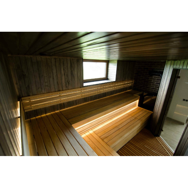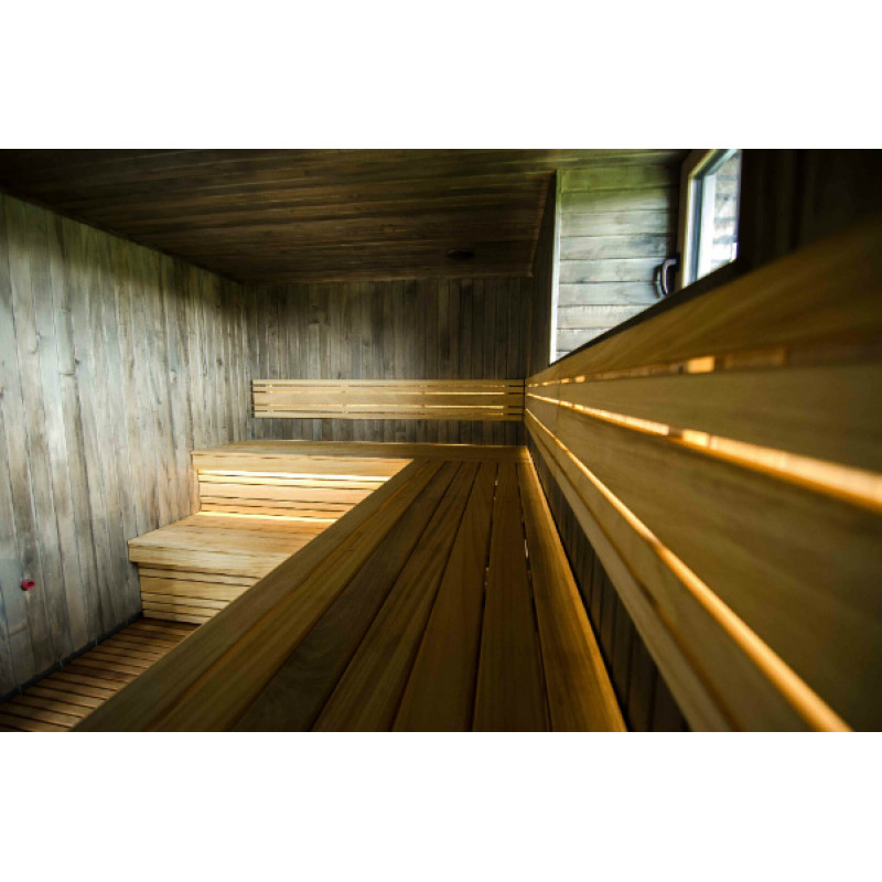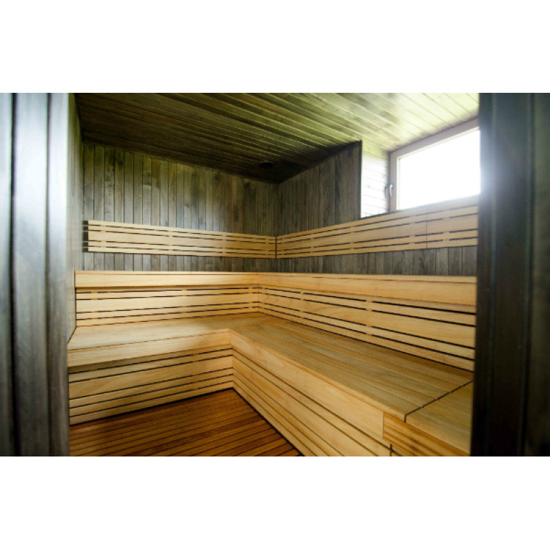 Pro saunová lehátka, opěradla a podlahové rošty je zvoleno vysoce kvalitní africké dřevo Abachi. Toto dřevo nejen skvěle vypadá, ale také se nezahřívá, takže při dotyku není možné spálit. Je obzvláště pohodlné a příjemné užívat si saunu na takových lavičkách.