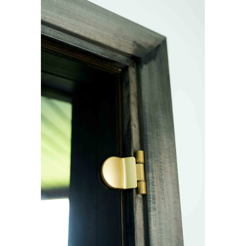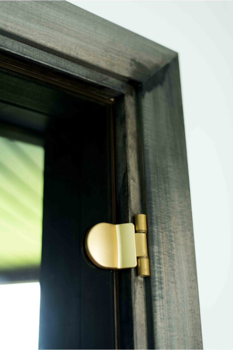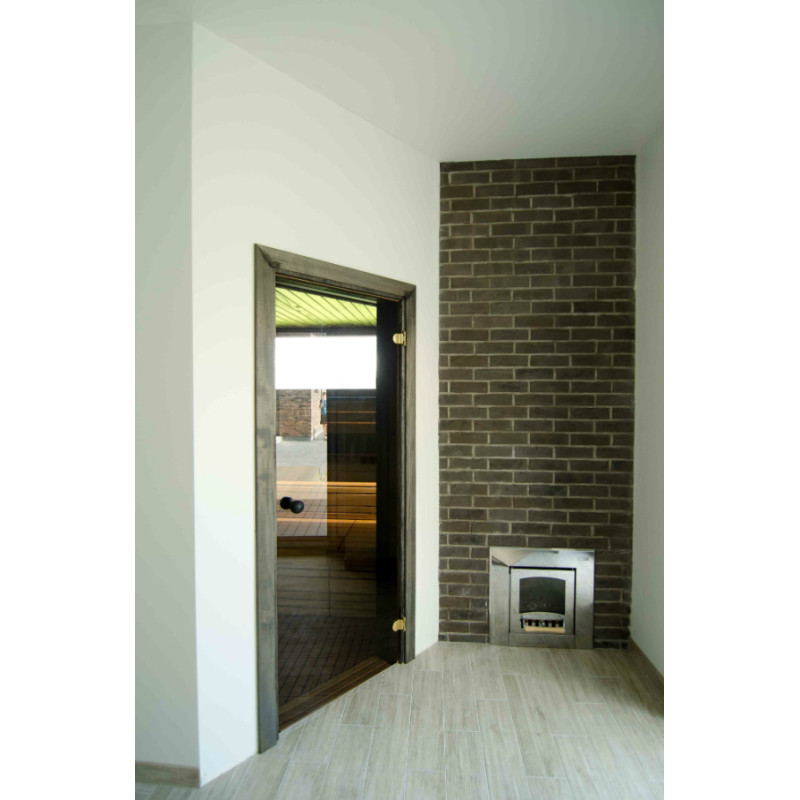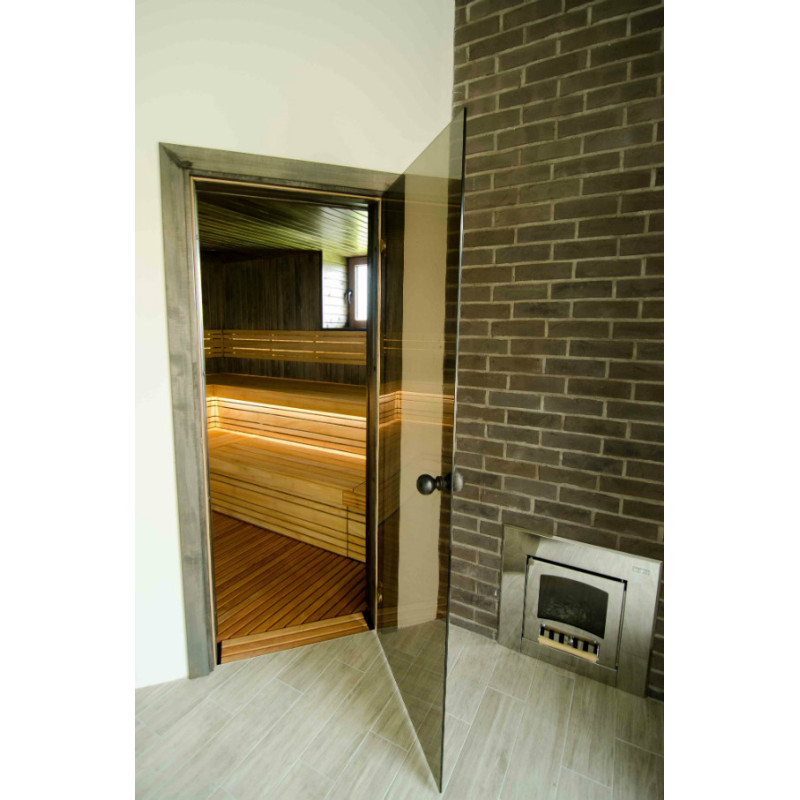 Dveře s tónovaným tvrzeným bronzovým sklem, rámem z lipového dřeva a kulatou klikou.