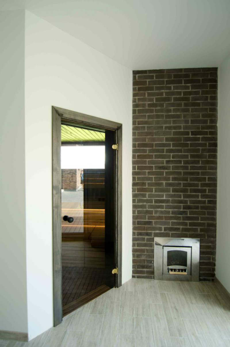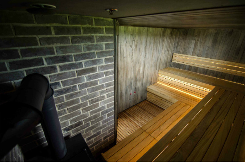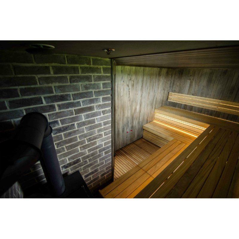 Stěny a strop navoskované speciálním černým voskem kontrastují se světlými saunovými lavicemi, místnost působí jedinečně a vytváří útulnou a moderní atmosféru. Tento kontrast lavic a stěn je ještě zvýrazněn vestavěným teplotně a vlhkostně odolným bílým LED osvětlením pod lavicemi a opěradly.