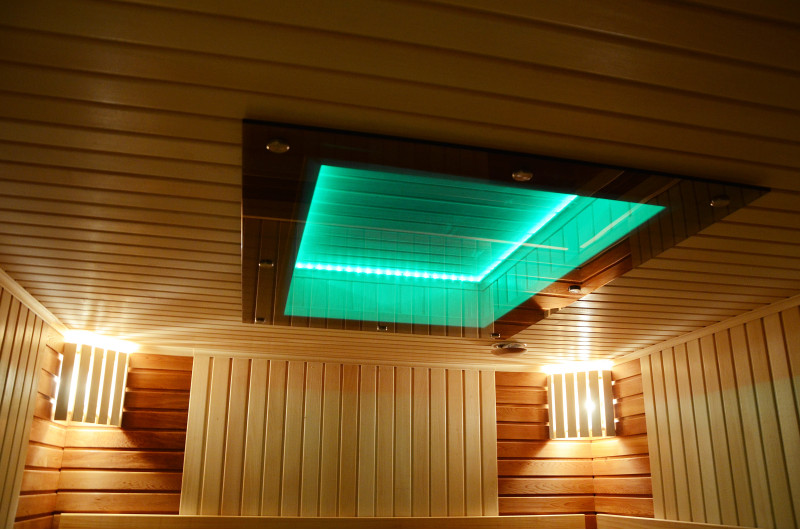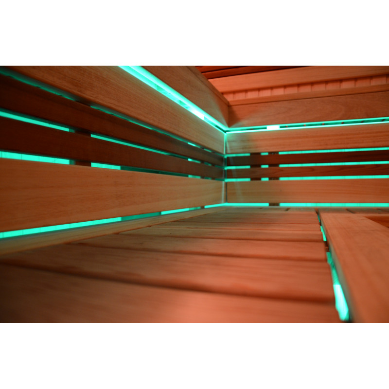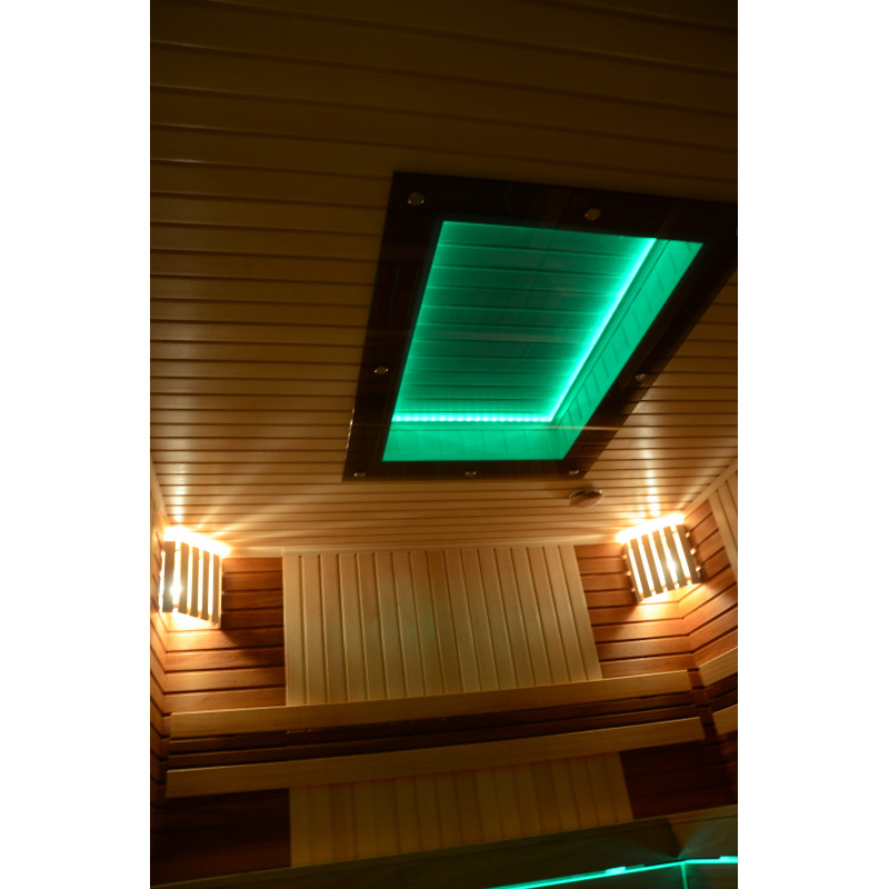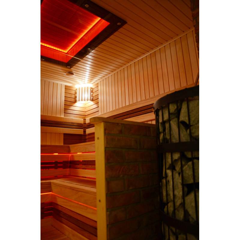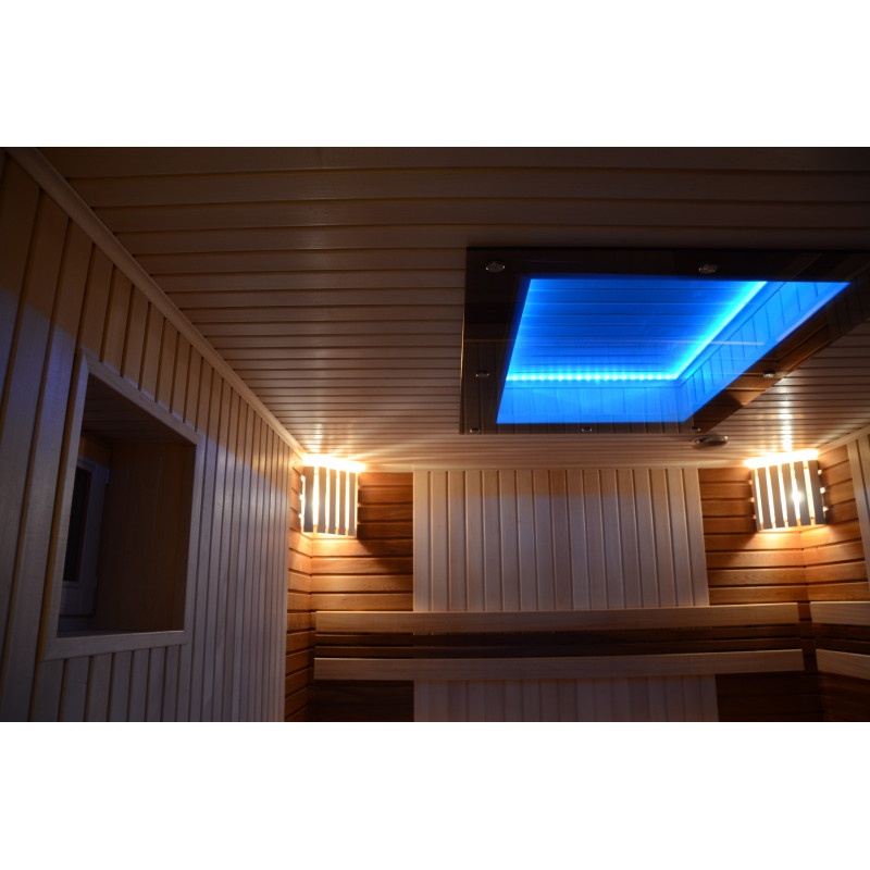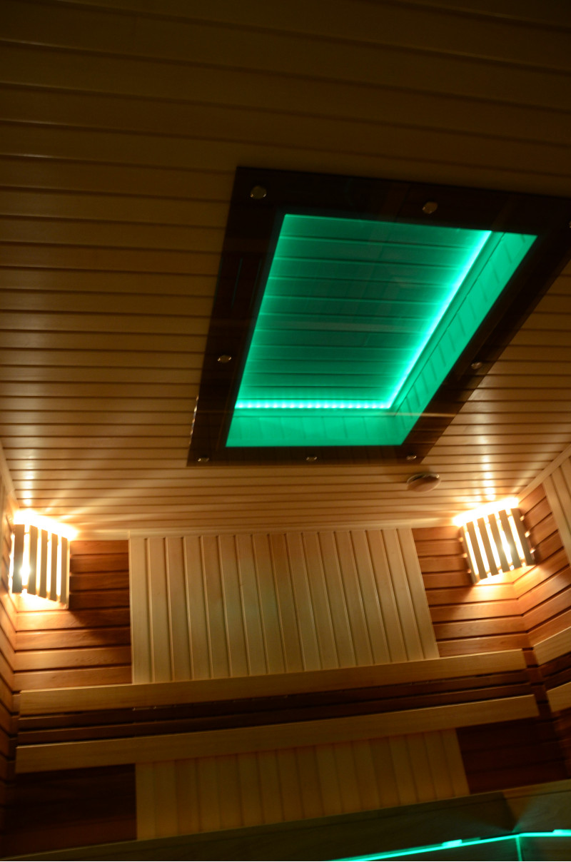 Na stropě a pod lavicemi - LED RGB barevné osvětlení, jehož barvy lze měnit pro navození té správné atmosféry a nálady. Nástěnné osvětlení - LED bílá svítidla teplé barvy s dřevěnými kryty. Kryty pomáhají ztlumit světlo, dodávají sauně více útulnosti. Také chrání svítidla před vodou, párou a teplem.