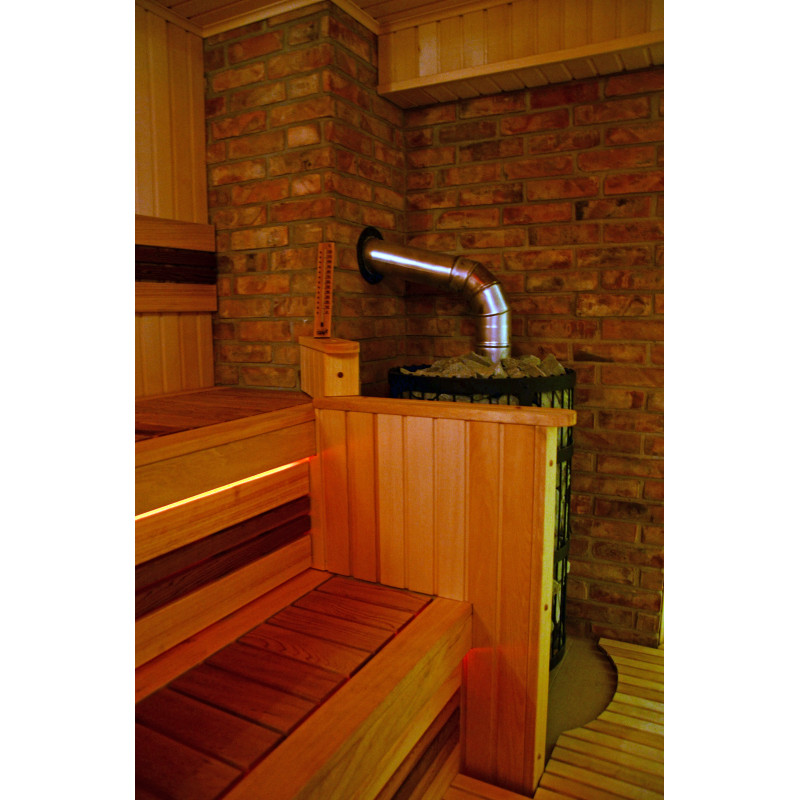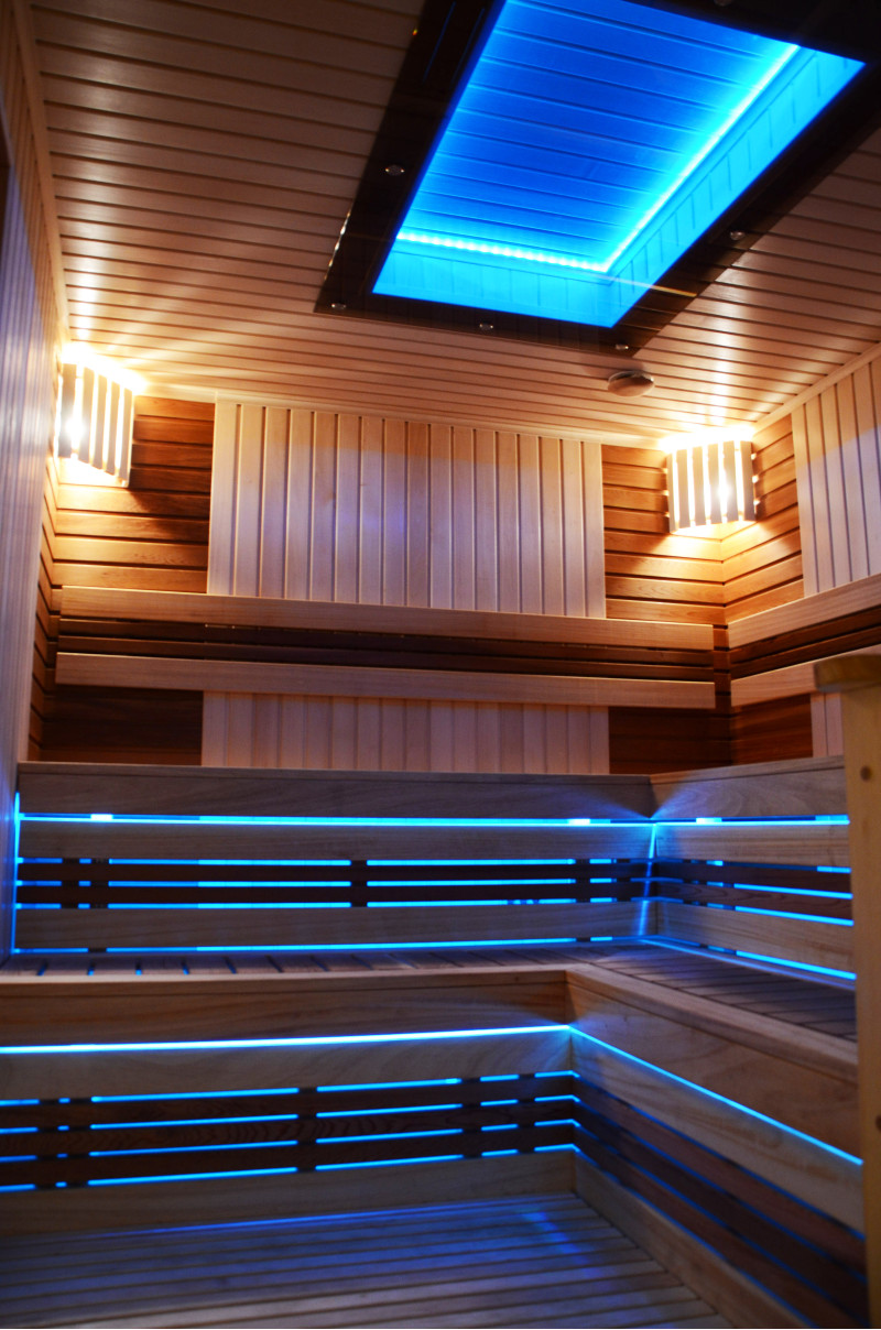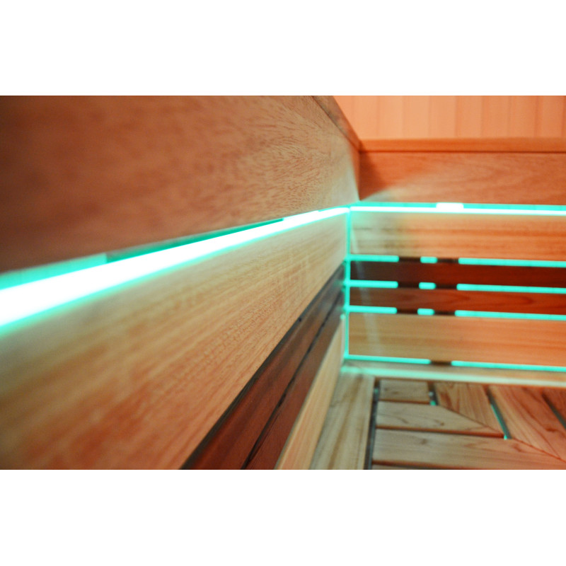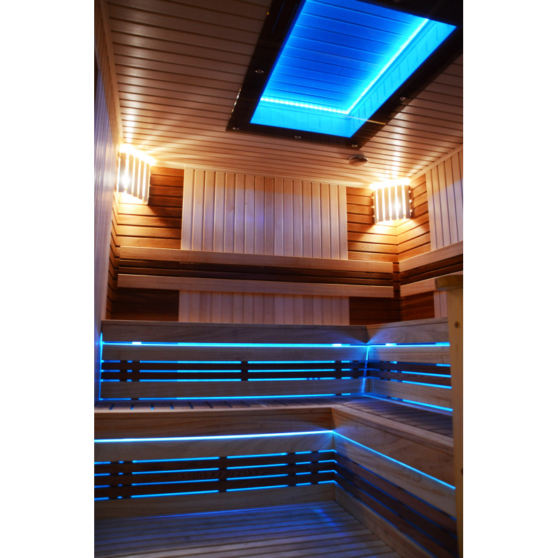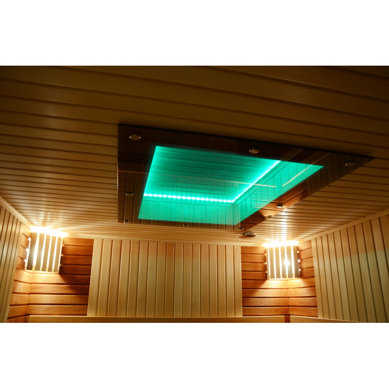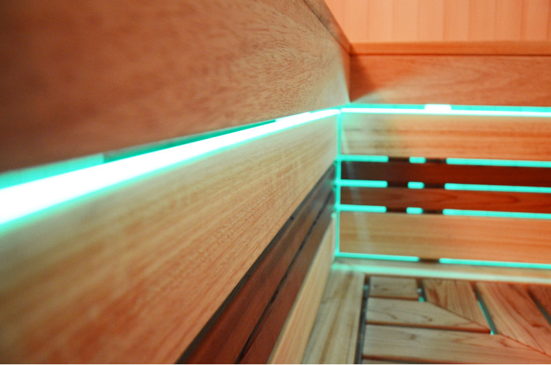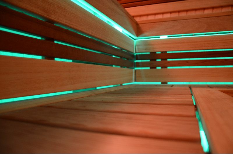 Na stropě a pod lavicemi - LED RGB barevné osvětlení, jehož barvy lze měnit pro navození té správné atmosféry a nálady. Nástěnné osvětlení - LED bílá svítidla teplé barvy s dřevěnými kryty. Kryty pomáhají ztlumit světlo, dodávají sauně více útulnosti. Také chrání svítidla před vodou, párou a teplem.