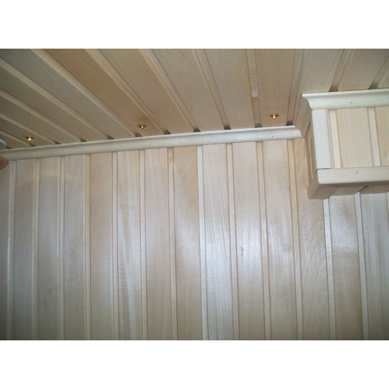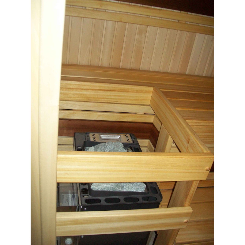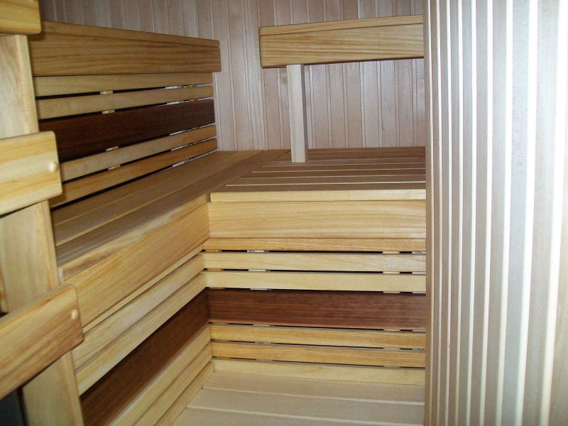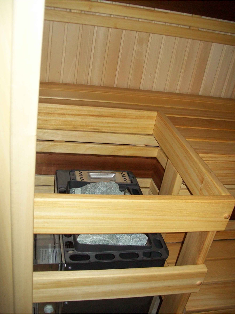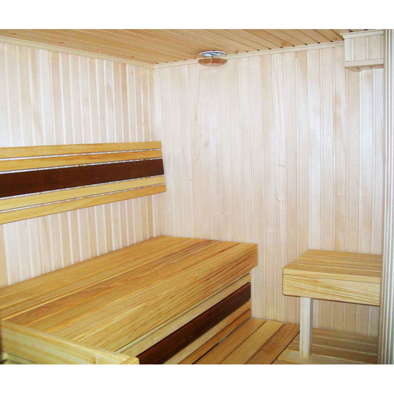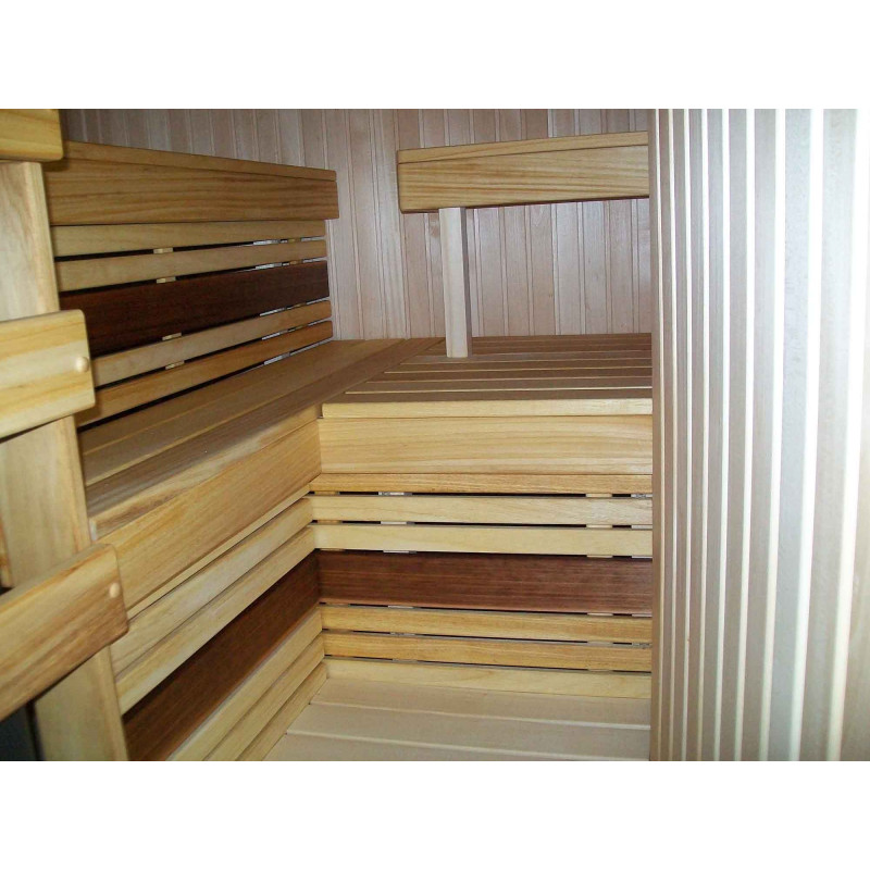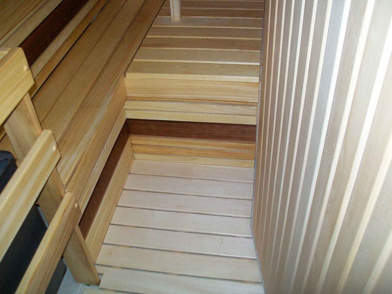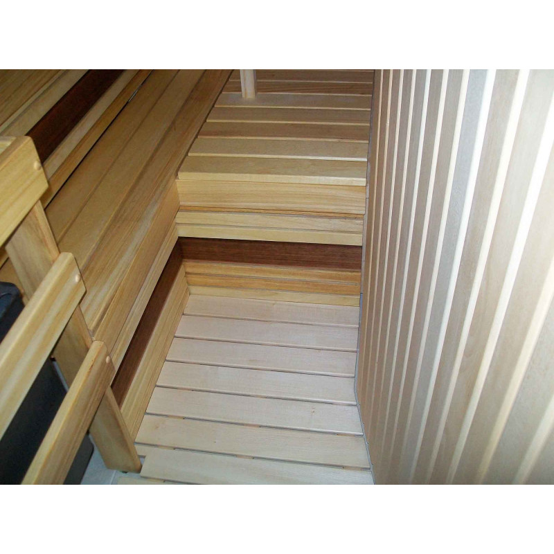 Pro instalaci stropů a stěn sauny se používá lipový obklad 15 mm - stylový, lehký a vyzařující příjemnou vůni dřeva. Na lavice a opěráky bylo zvoleno nejkvalitnější cedrové a abachi dřevo Toto dřevo je kvalitní, nejen že krásně vypadá, ale ve srovnání s jinými druhy dřeva se nejméně zahřívá, proto je příjemné a bezpečné se takových lavic dotýkat. Podlahový rošt - dřevo olše černá.