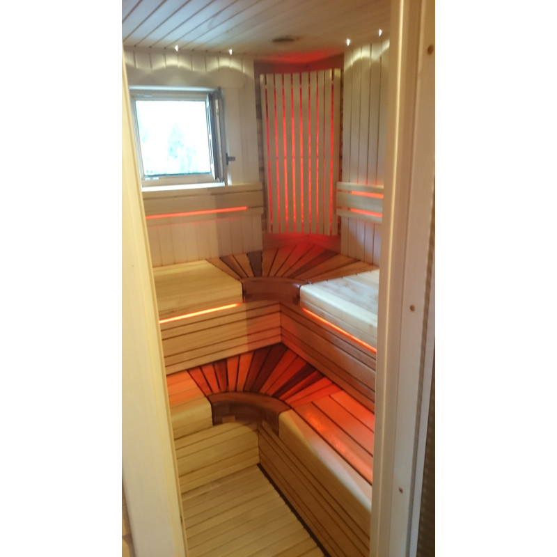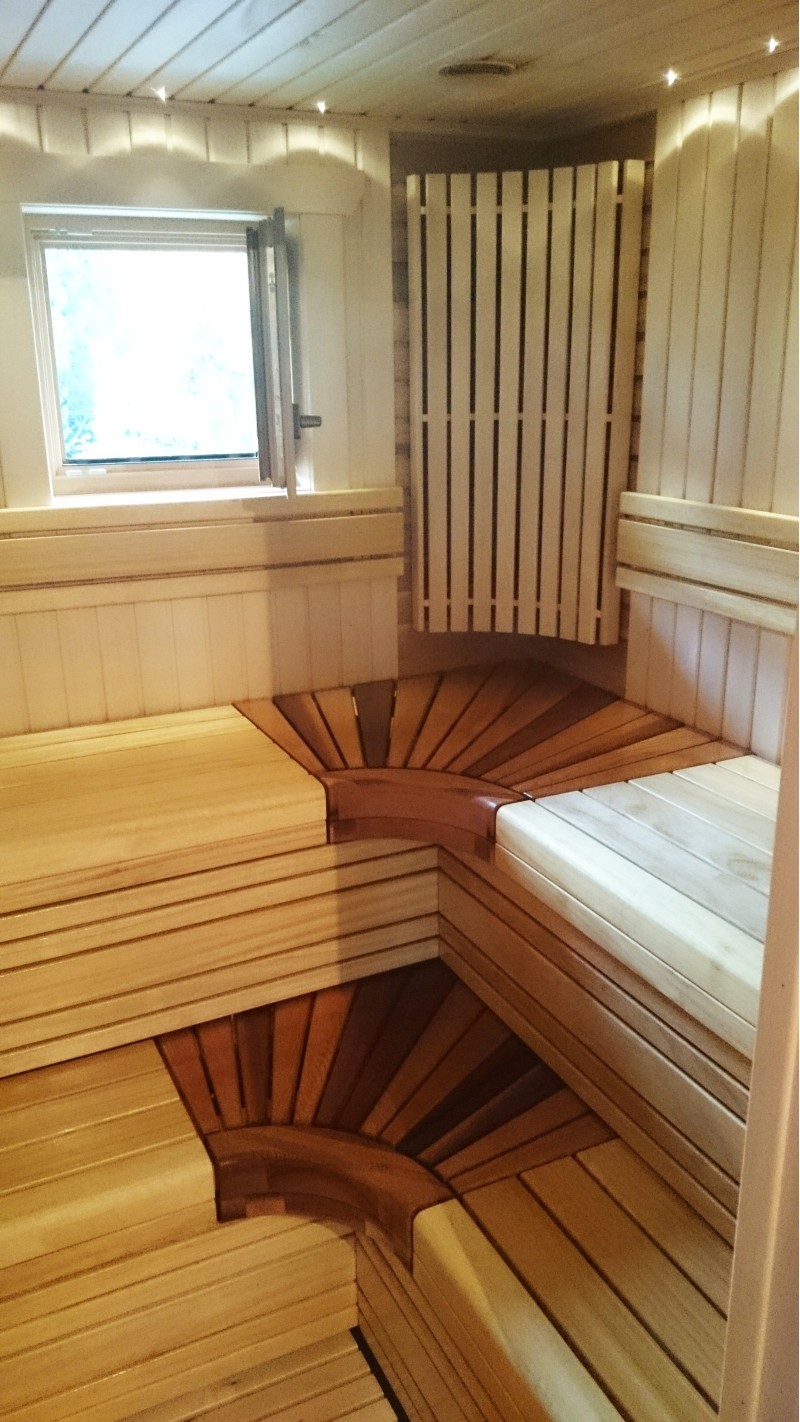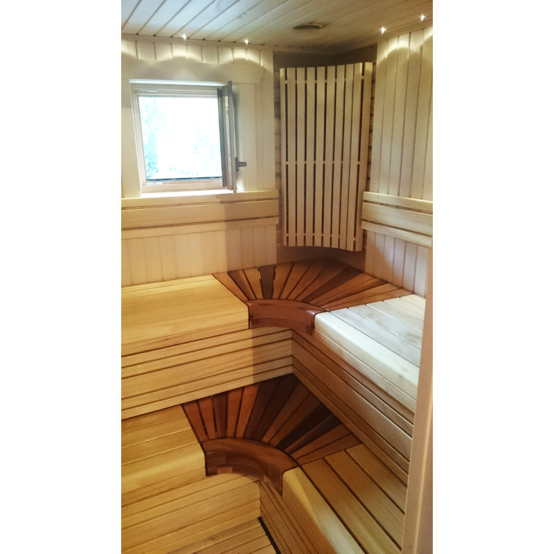 Interiér sauny je vyroben z nejkvalitnějšího lipového a cedrového dřeva, lavice jsou vyrobeny z abachi a cedrového dřeva. Toto dřevo je na lavice nejvhodnější, jelikož se málo zahřívá, je bezpečné a příjemné na dotek takového dřeva.