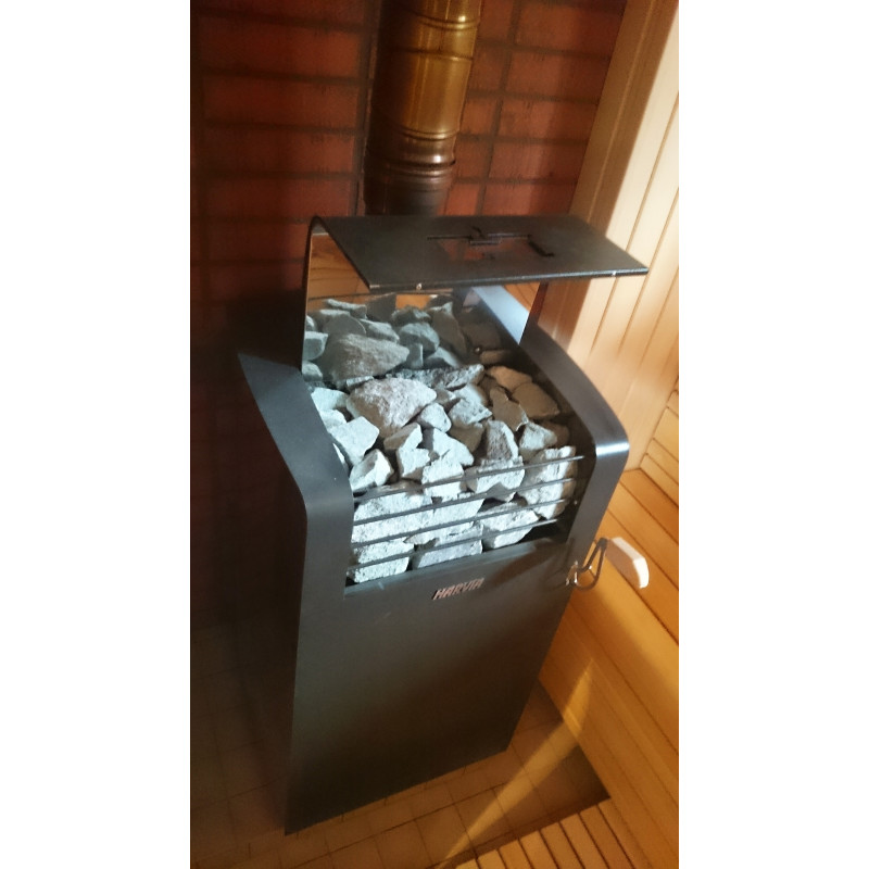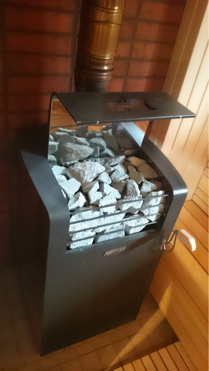 Pro správnou cirkulaci vzduchu v sauně je zajištěna ventilace a je instalován komín s topidly. Model ohřívače je uzavřeného typu, který akumuluje teplo a vydává hodně páry. Během ohřevu je víko zavřené, nalévání vody na kameny - je otevřeno.