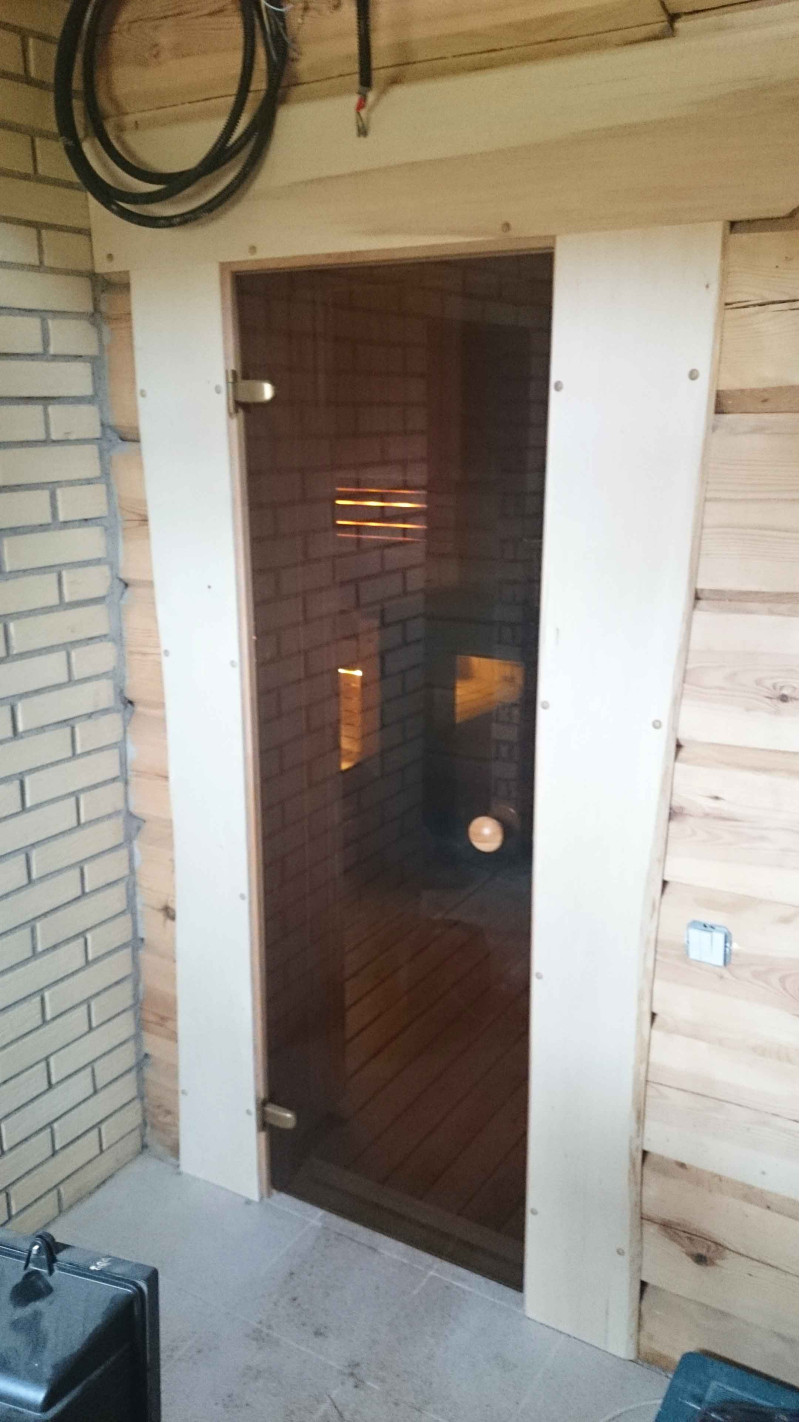 Dveře - tónované tvrzené sklo s kulatou dřevěnou rukojetí.
