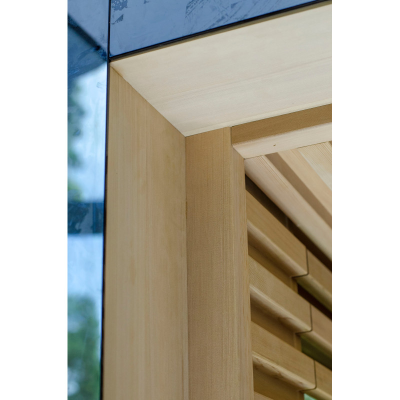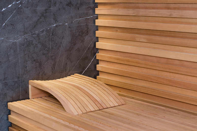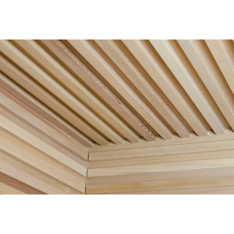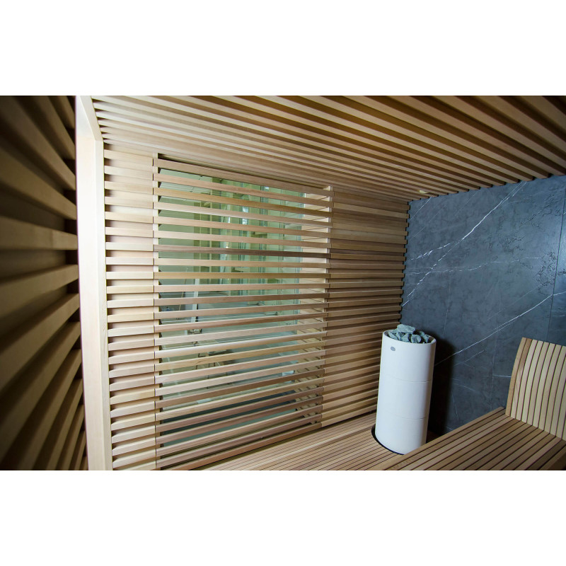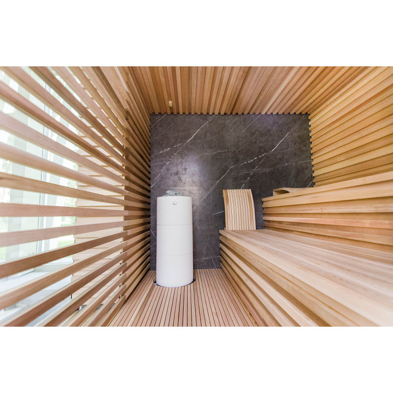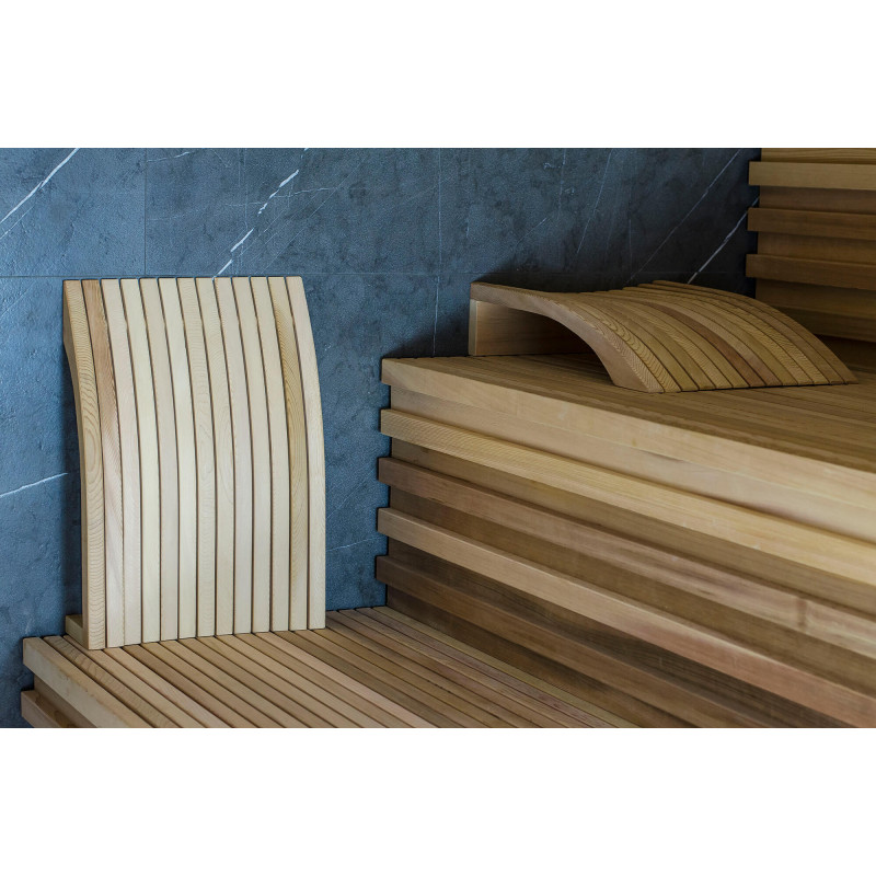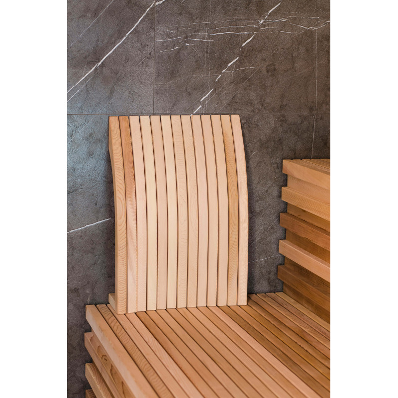 Stěny a lavice sauny jsou vyrobeny z nejkvalitnějšího cedrového dřeva, vyrobeného podle individuálního profilu. Opěradla-polštáře - ručně vyráběné cedrové dřevo. Toto dřevo je vysoce kvalitní, nezahřívá se, takže je bezpečné a příjemné na dotek při saunování.