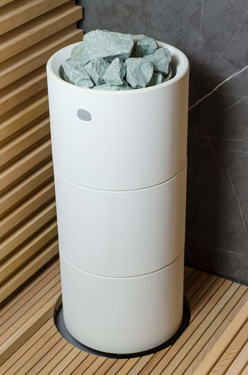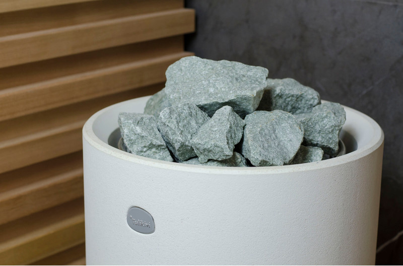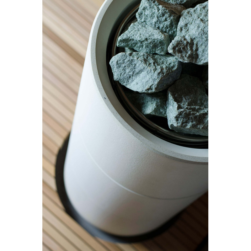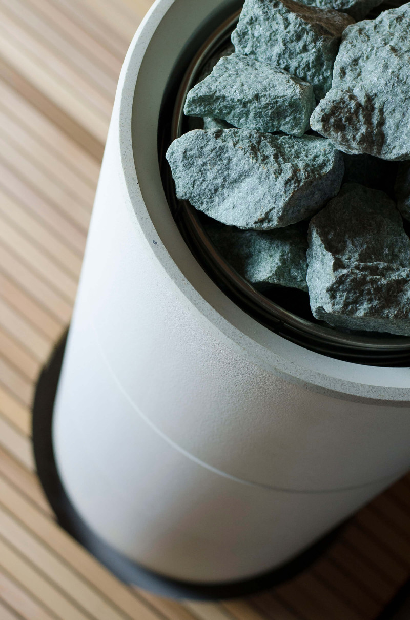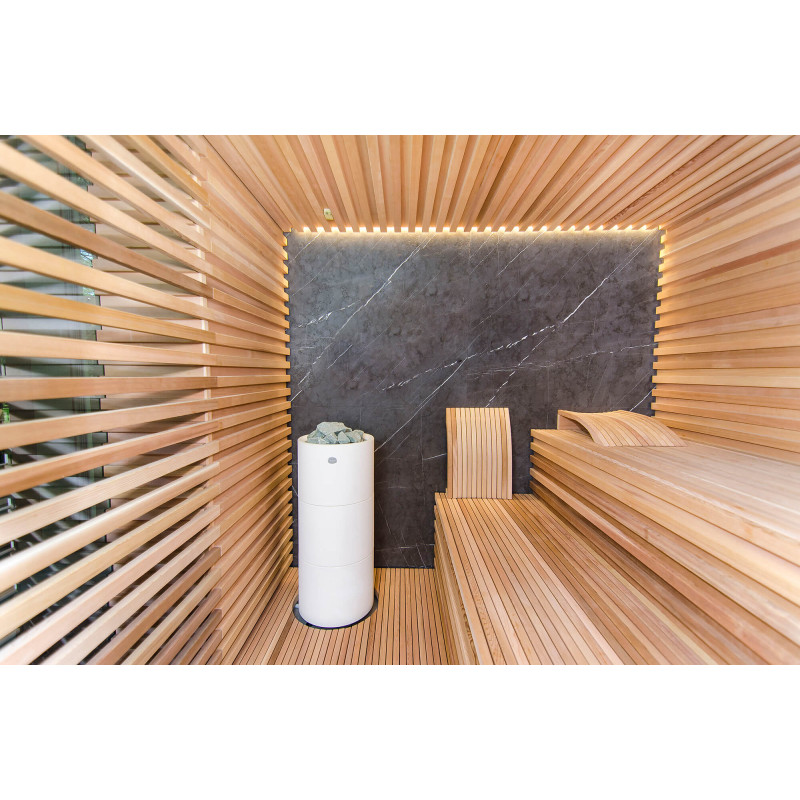 Zdrojem tepla je topidlo Tulikivi Kuura White, naplněné kameny jadeitu. Když se jadeitové kameny zahřejí, zvýší se jeho léčivé vlastnosti. Polévání kamenů vodou v sauně šíří příjemnou vůni čistého prostředí a usnadňuje dýchání. Z parního generátoru parní sauny je do topidla zavedena parní trubka, která umožňuje dosáhnout mnohem vyšší vlhkosti v sauně. To je skvělá volba, pokud nemáte podmínky pro instalaci parní lázně a sauny. Jedním z běžných řídicích systémů je velký stacionární LED monitor. Veškeré vybavení je také ovládáno chytrým zařízením odkudkoli na světě.