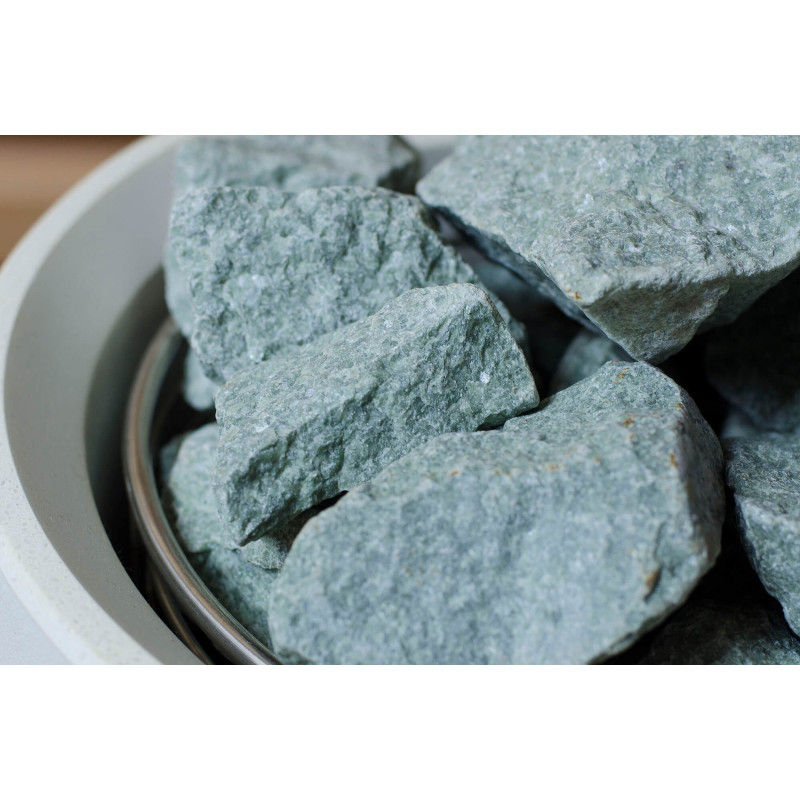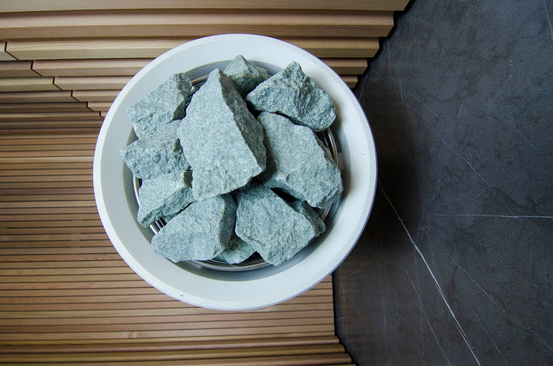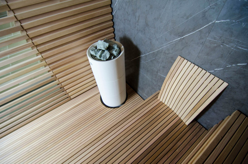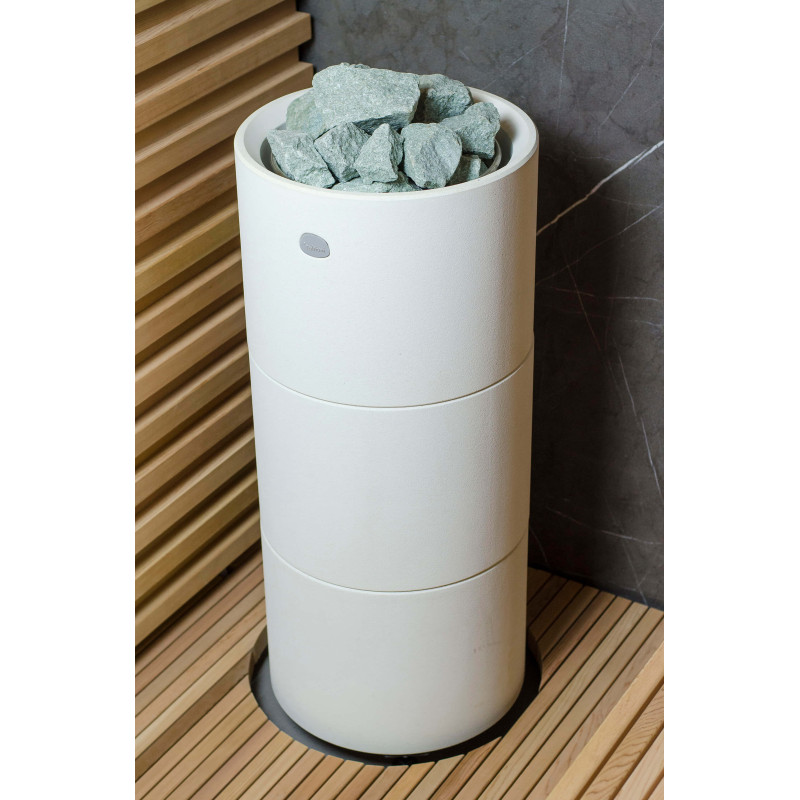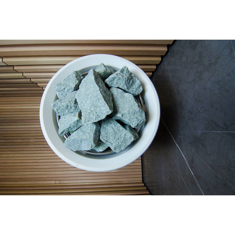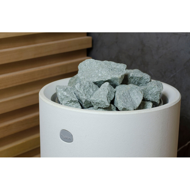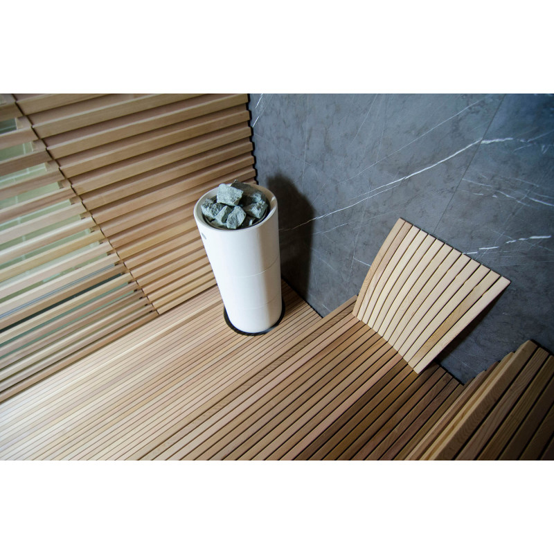 Zdrojem tepla je topidlo Tulikivi Kuura White, naplněné kameny jadeitu. Když se jadeitové kameny zahřejí, zvýší se jeho léčivé vlastnosti. Polévání kamenů vodou v sauně šíří příjemnou vůni čistého prostředí a usnadňuje dýchání. Z parního generátoru parní sauny je do topidla zavedena parní trubka, která umožňuje dosáhnout mnohem vyšší vlhkosti v sauně. To je skvělá volba, pokud nemáte podmínky pro instalaci parní lázně a sauny. Jedním z běžných řídicích systémů je velký stacionární LED monitor. Veškeré vybavení je také ovládáno chytrým zařízením odkudkoli na světě.