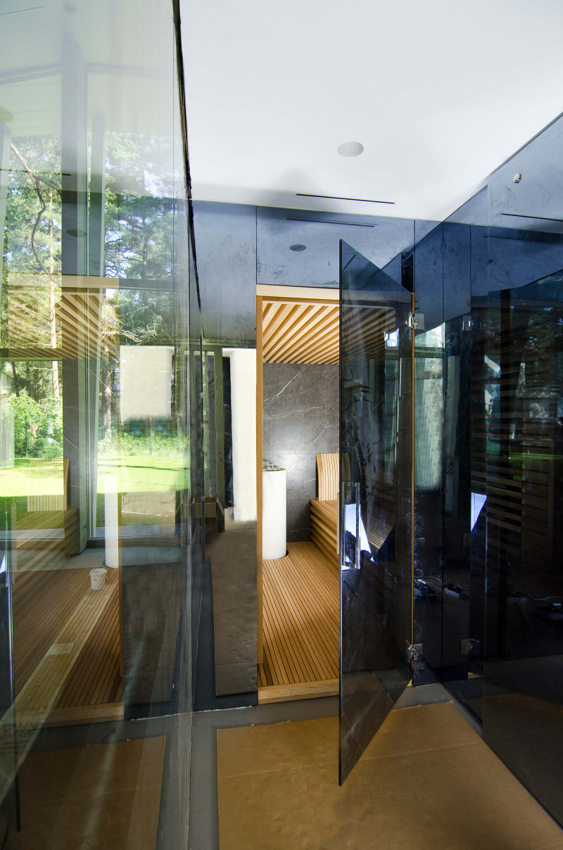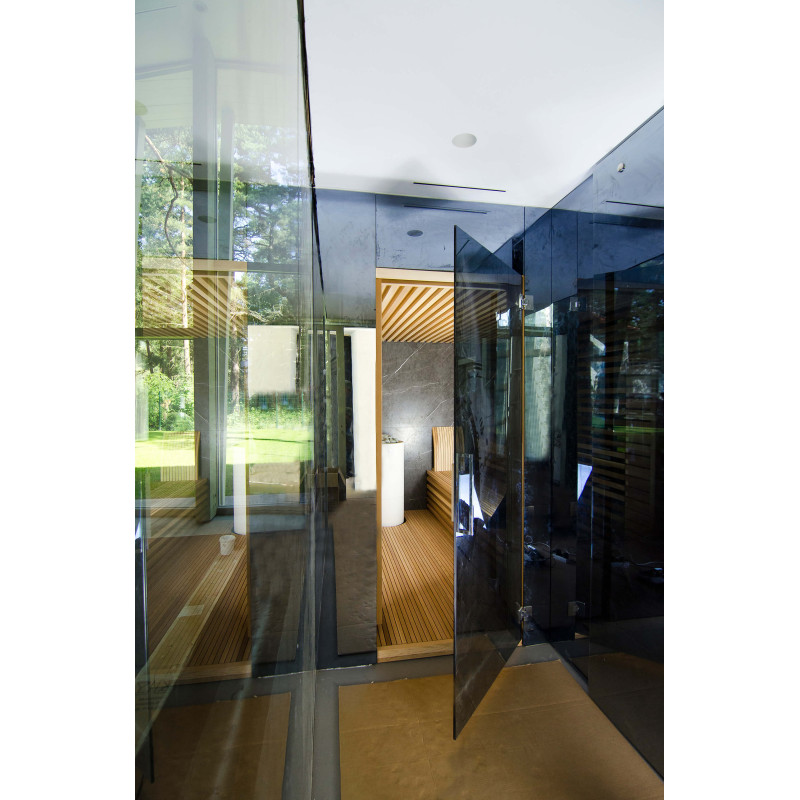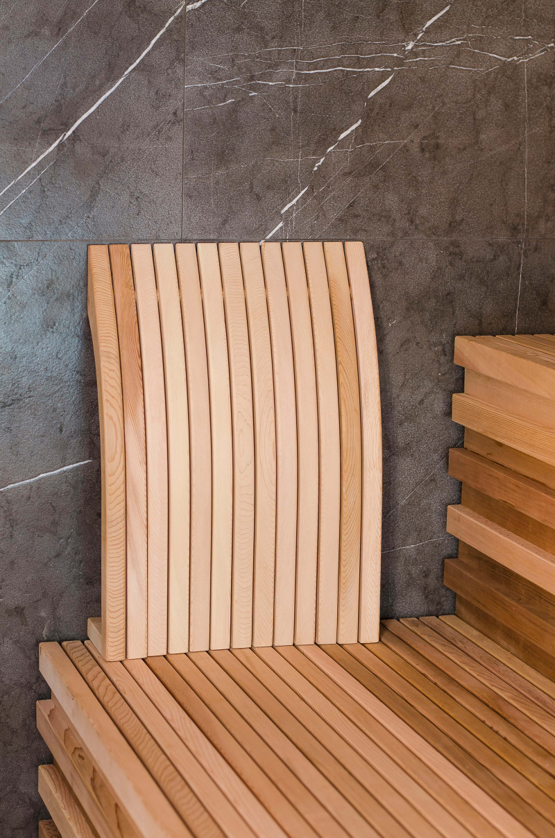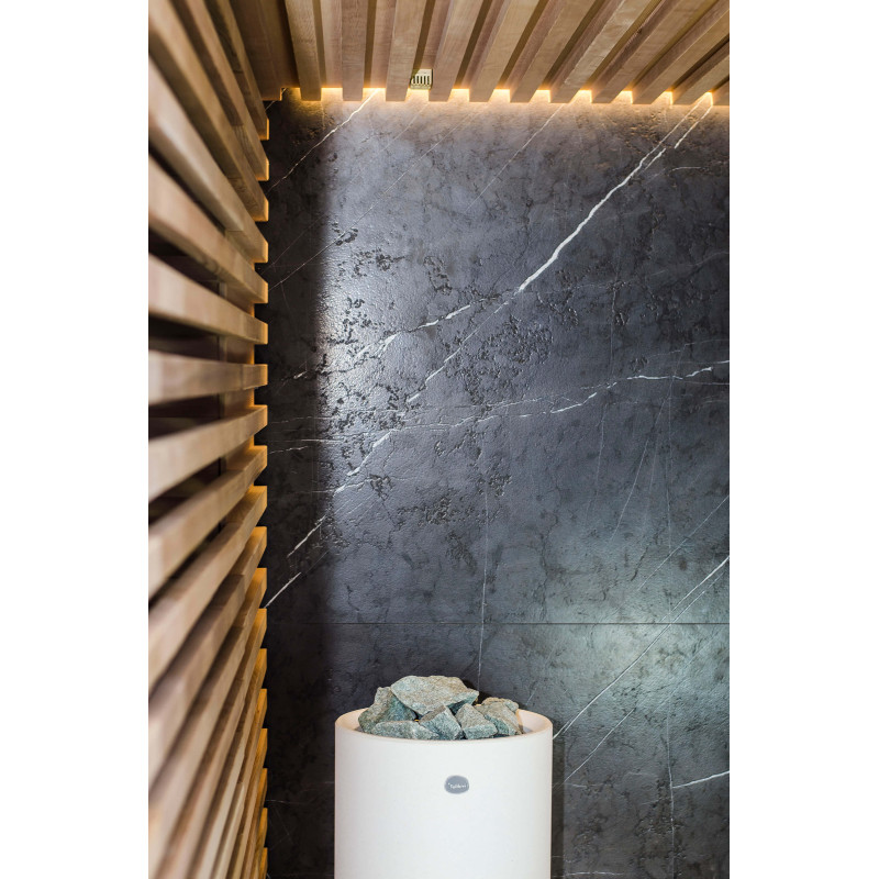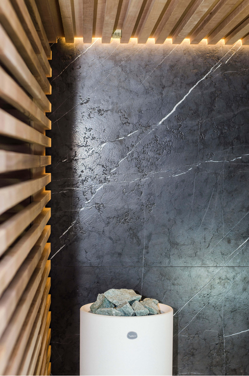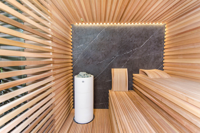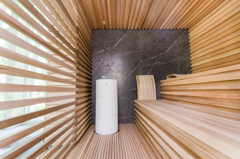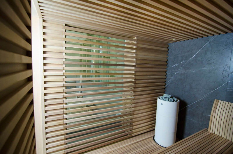 Dekorace zadní stěny sauny je z exkluzivního designového italského mramoru, jehož krásu podtrhuje LED osvětlení instalované kolem. Ozdobou boční stěny sauny je prosklená vitrína, která je kryta odnímatelnou prolamovanou mříží. Sauna má výhled na lázeňskou část, velký bazén. Osvětlení stěn a stropu sauny je teplým bílým hermetickým LED páskem. Bezrámové skleněné dveře.