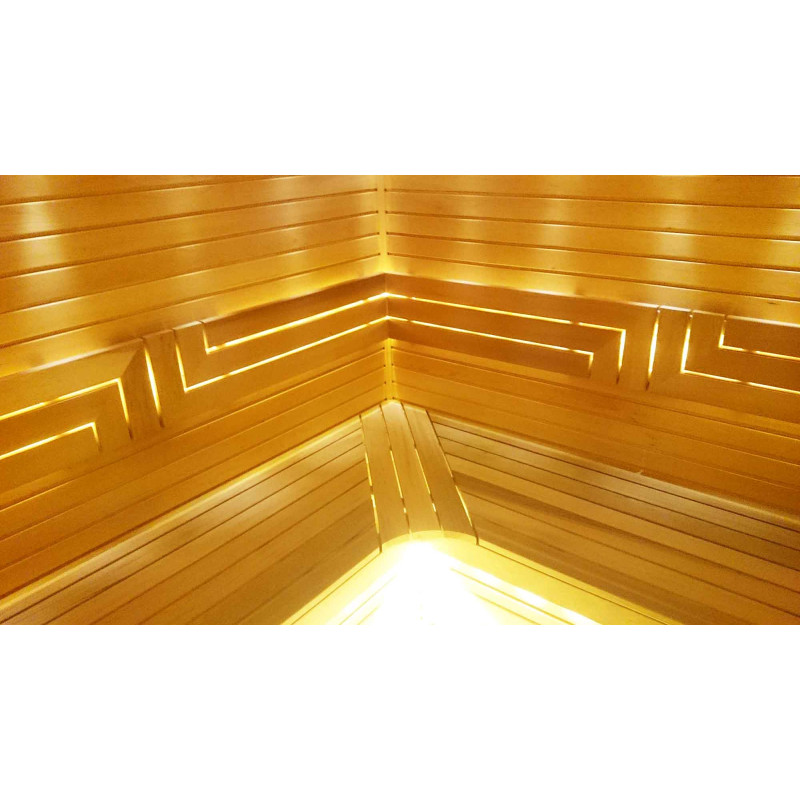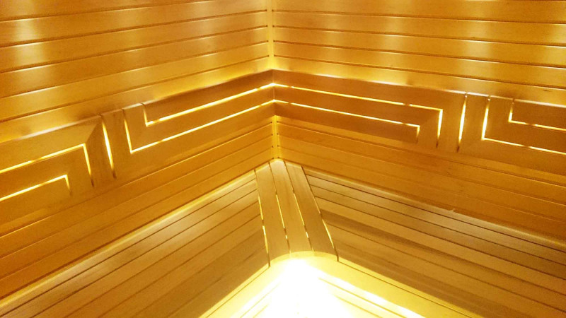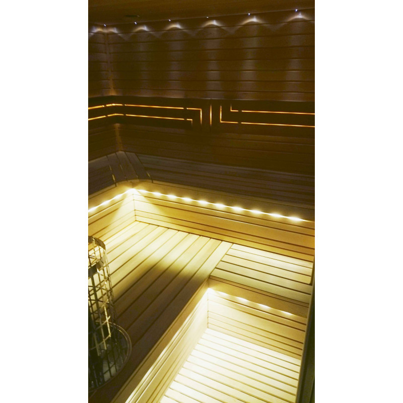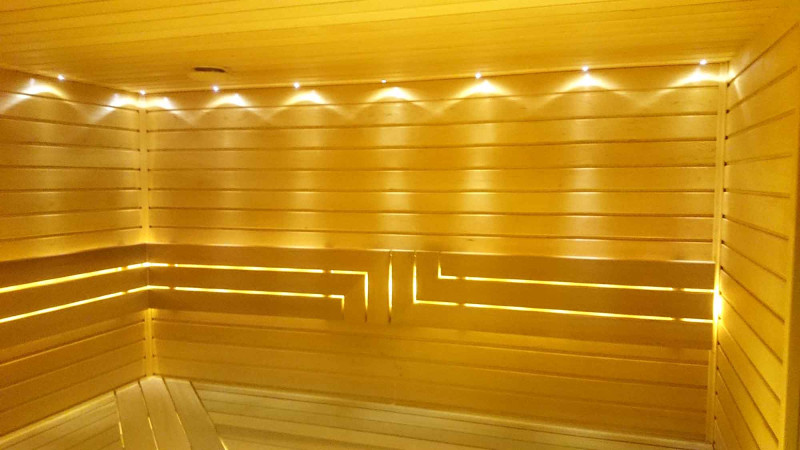 Strop je vybaven exkluzivním LED osvětlením "Slunce", pod lavicemi a opěradly jsou instalovány LED osvětlovací pásy, barva teplá bílá. Díky osvětlení je zajištěna část relaxačního účinku sauny.