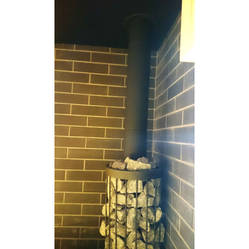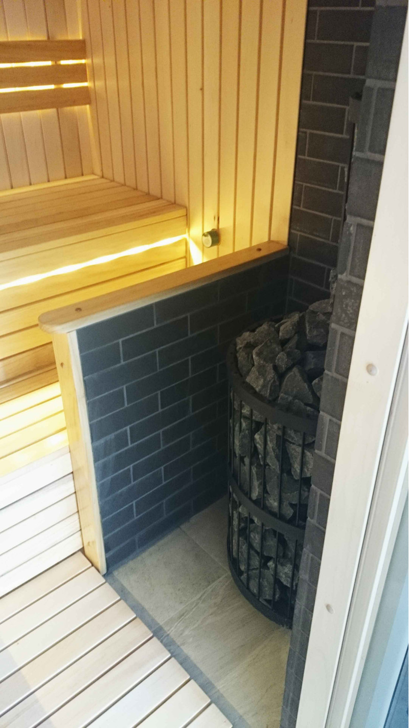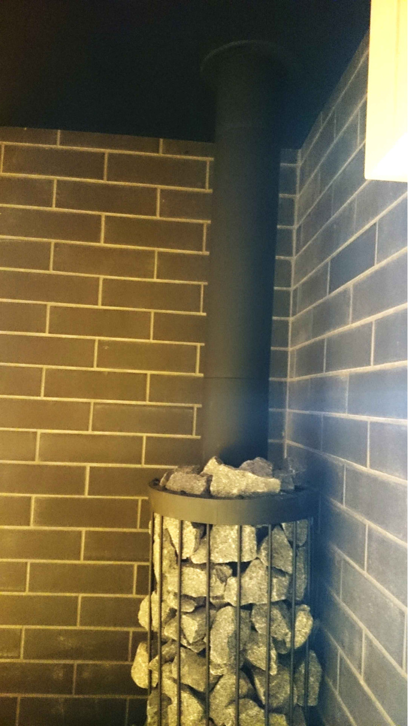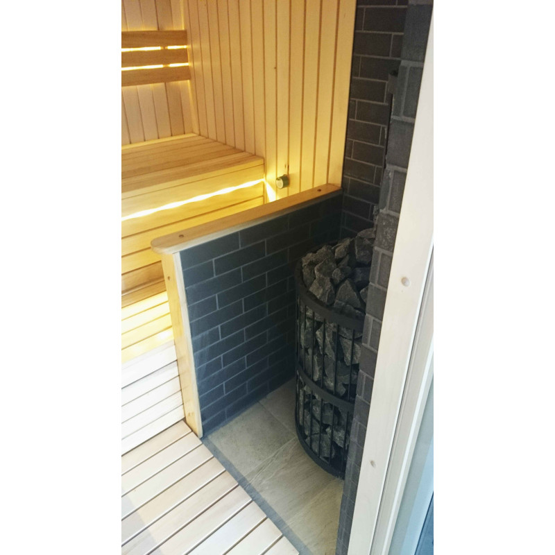Tento projekt sauny s ochrannou stěnou pro topidlo. Stěna je vyrobena z tepelně odolné desky Minerit na kovovém rámu.