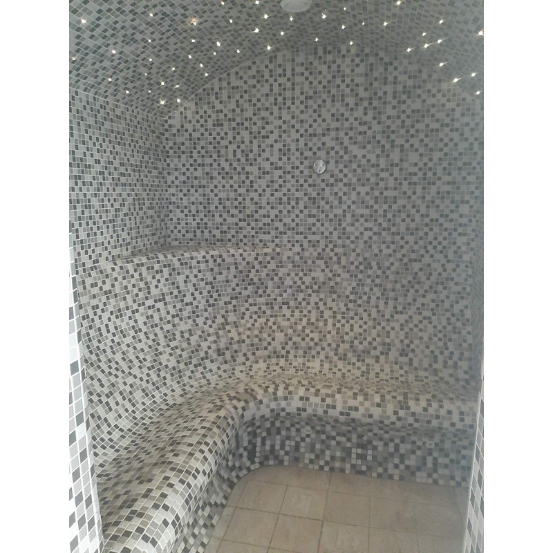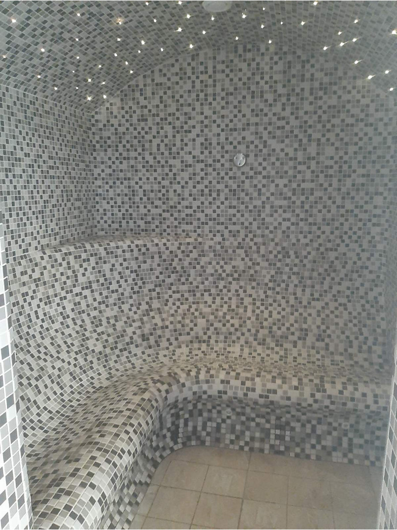 - Parní sauna - použité materiály, které odolávají extrémně vysokým teplotám a velmi vysoké vlhkosti. Strop je obloukového typu, takže kondenzát páry nekape na lidi, kteří si saunu užívají. Pro dekoraci byly vybrány dlaždice a stropní osvětlení z optických vláken, které vytváří efekt hvězdné oblohy. Lavice jsou ve zvláště pohodlném tvaru.