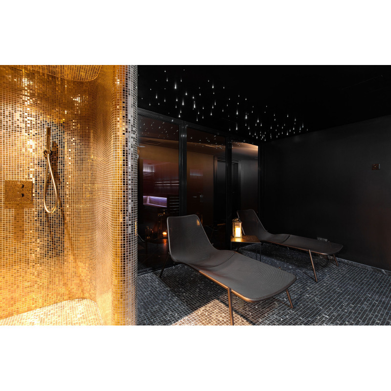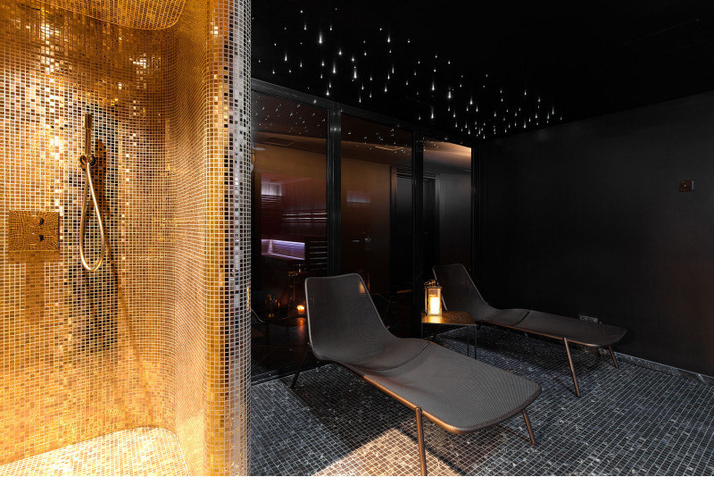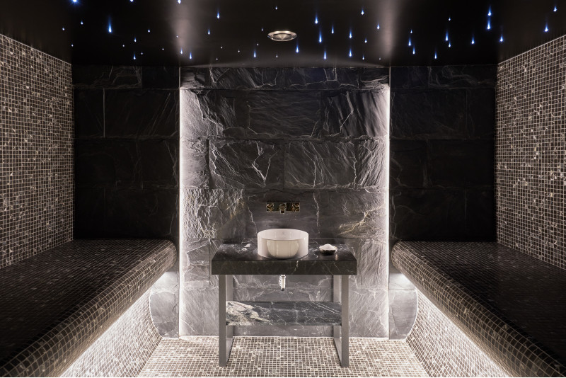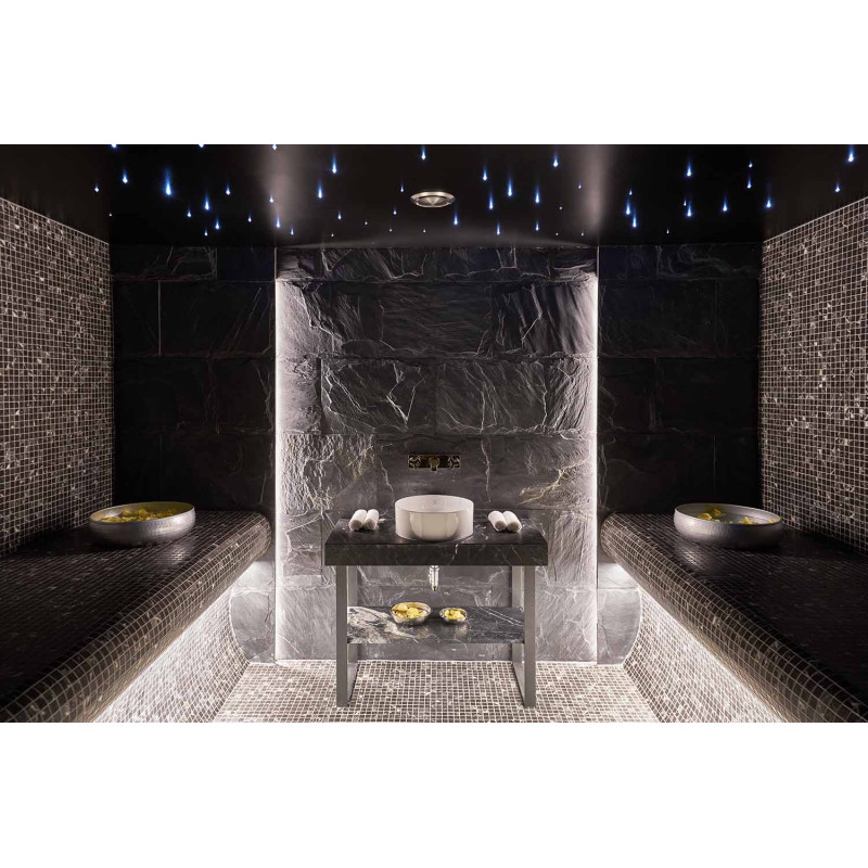 Prosklená vitrína byla také vybrána pro místnost s hammamem, což vytváří bezproblémový styl. Vnitřní plochy jsou tvořeny dle individuálního projektu z pěnového polystyrenu s použitím kontinuálního řezání EPS styrenu. Stěny, podlahy a lavice v místnosti jsou vyhřívané. Systém osvětlení využívá LED RGB IP 67, 9m pásy a optický systém "Starry Sky". Lepené mozaikové obklady, přizpůsobené zakřivení a vyplněné šedou hydroizolací Schonox.