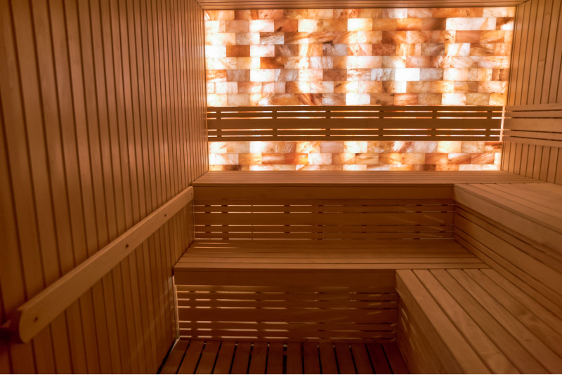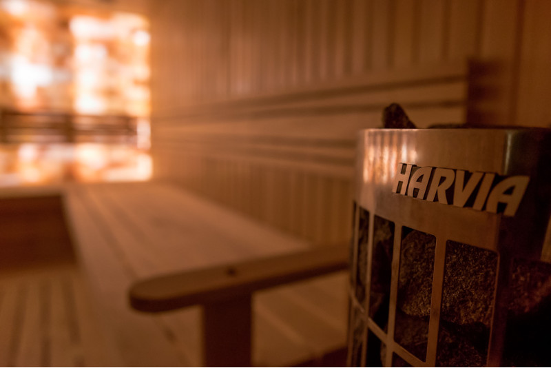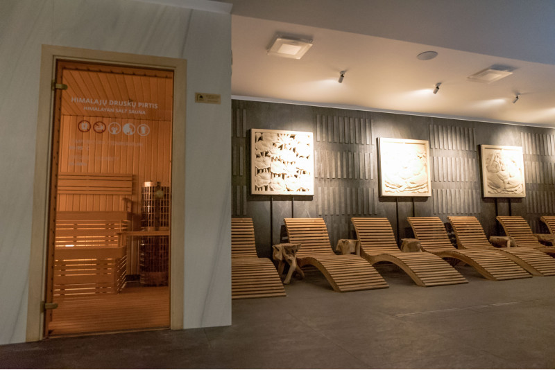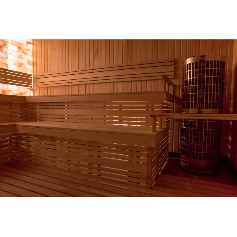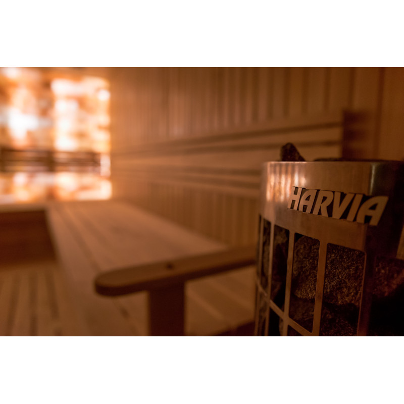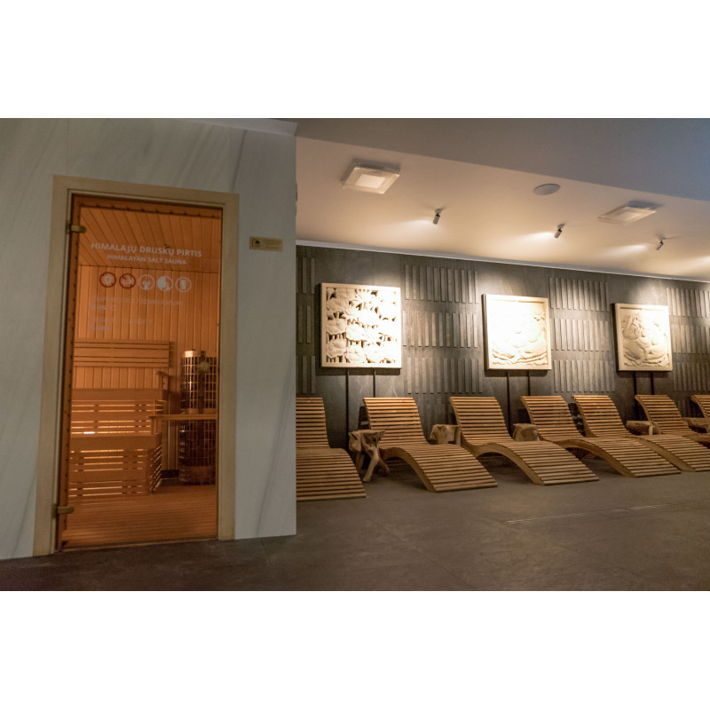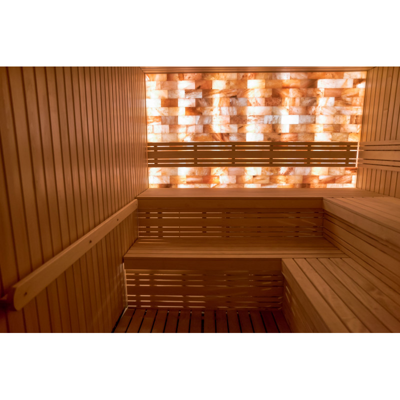 Hlavním vrcholem sauny je působivá a moderně vyhlížející stěna z himalájských solných cihel. Tato stěna potěší nejen svým vzhledem, dodá sauně útulnou atmosféru, ale je také známo, že himalájská sůl má mnoho pozitivních vlastností pro lidské zdraví. Himalájská sůl příznivě působí na lidi s alergiemi, průduškovým astmatem, nemocemi nervového systému, posiluje imunitní systém, zvyšuje náladu a dodává energii. Himalájská sůl neutralizuje elektromagnetické záření, snižuje statickou elektřinu ve vzduchu. Himalájskou solnou stěnu jen dále zvýrazňuje a zkrášluje zabudované LED osvětlení pod cihlami.