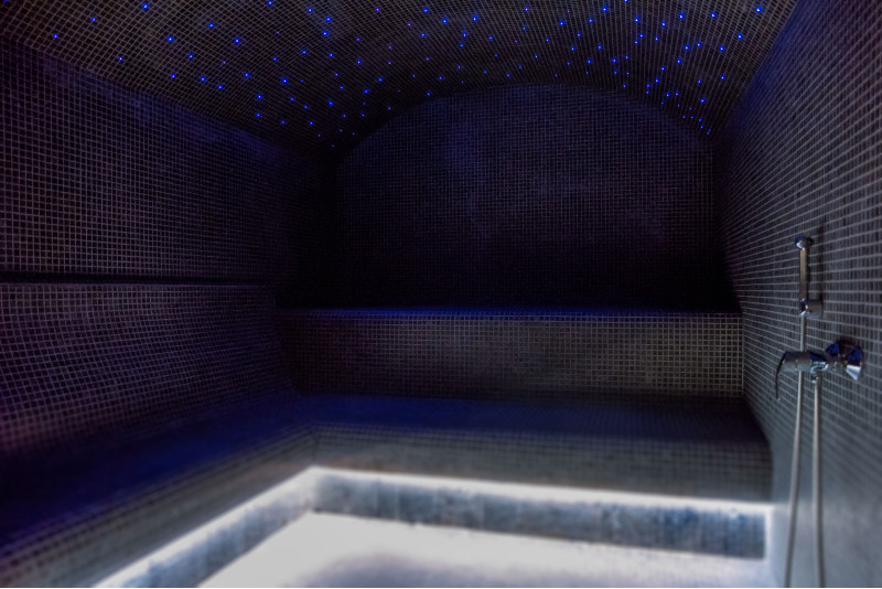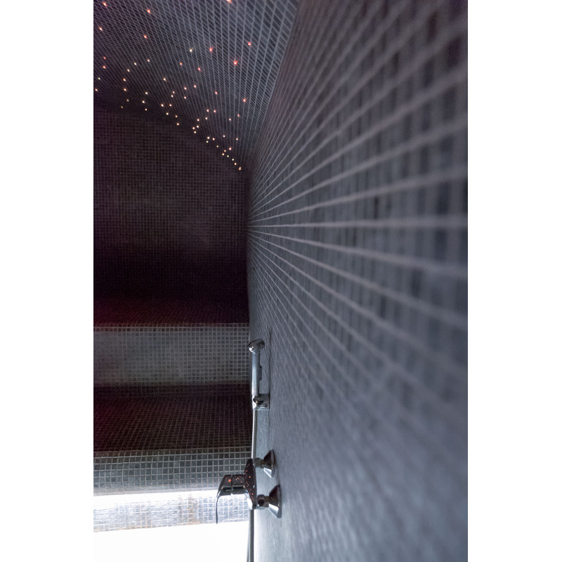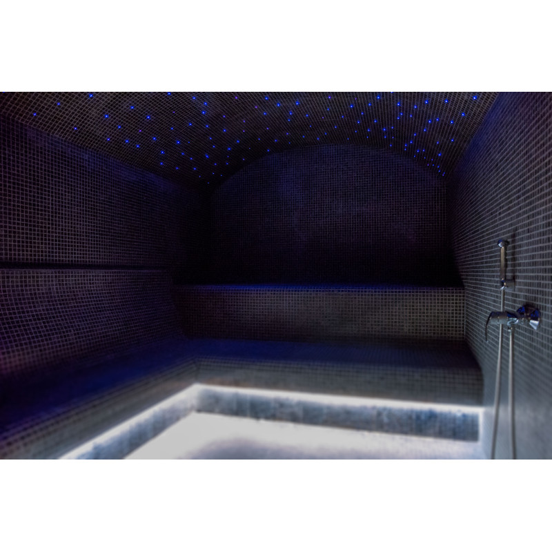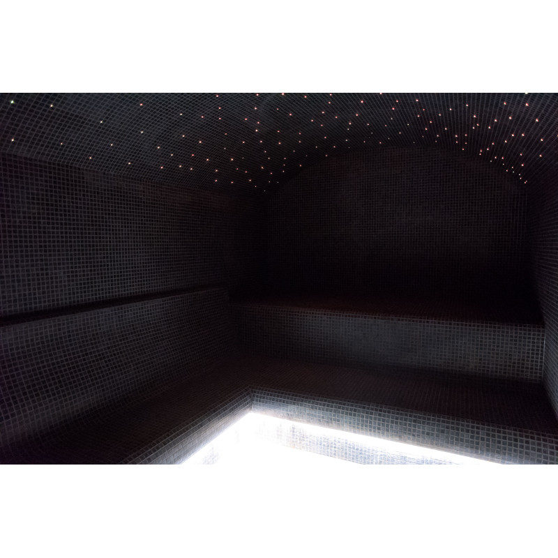 V parní sauně jsou povrchy z pěnového polystyrenu, stropní oblouky a lavice vyrobeny dle individuálního projektu. Saunu si můžete užít vleže i vsedě, na jedné straně sauny je totiž zádová opěrka.