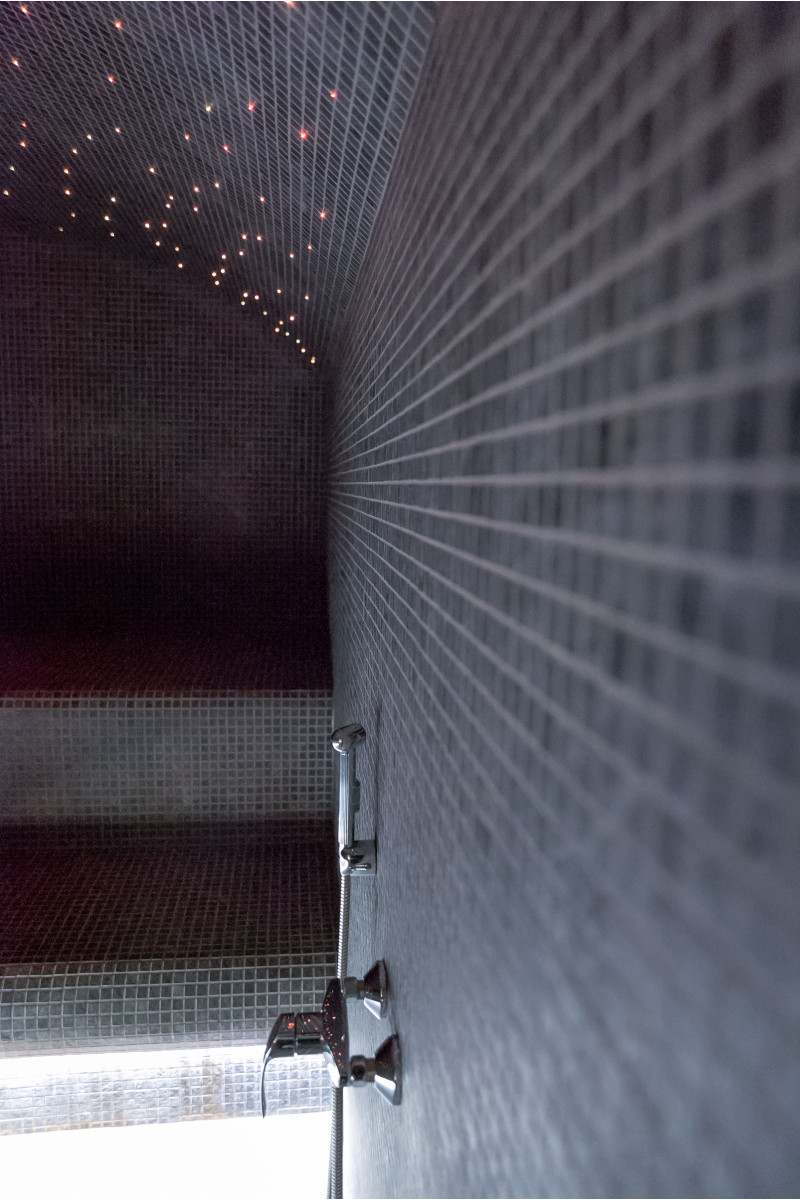 Celá saunová místnost je zdobena malými mozaikovými dlaždicemi a dva hudební reproduktory vytvářejí klidnou a útulnou atmosféru.