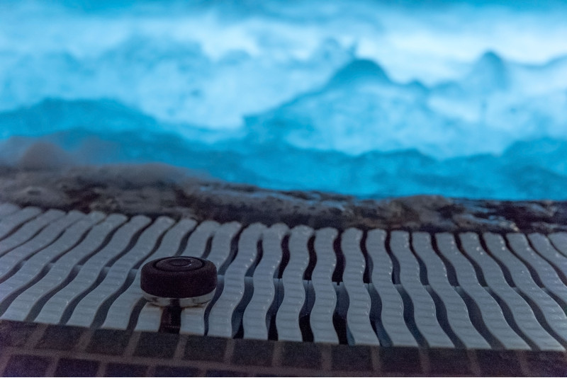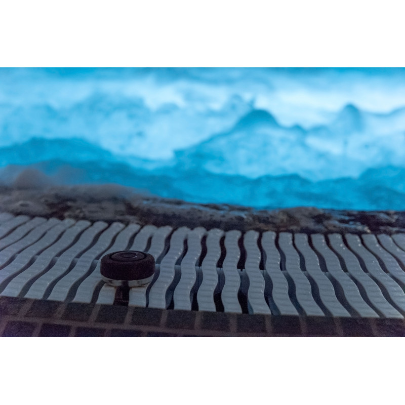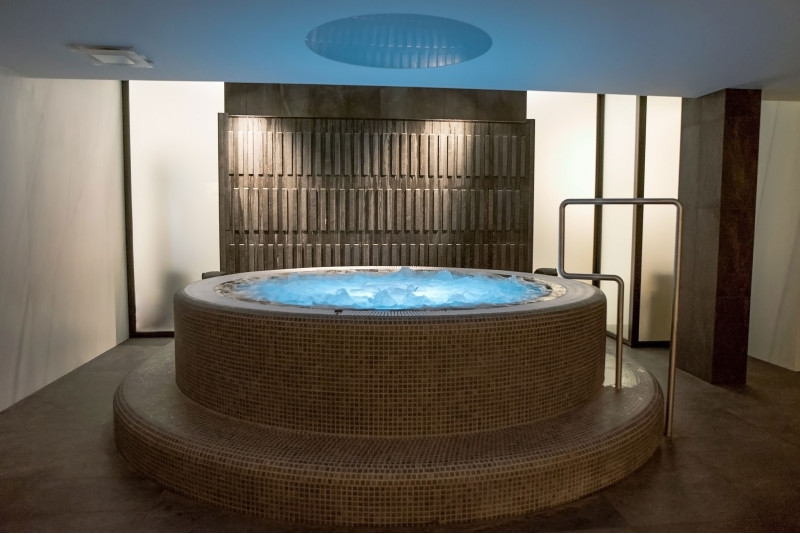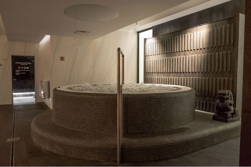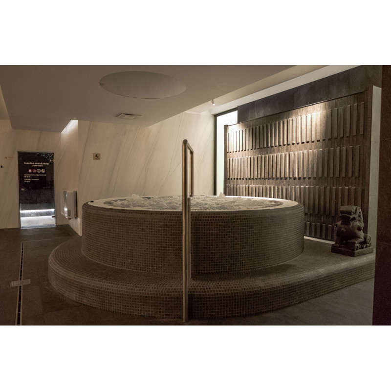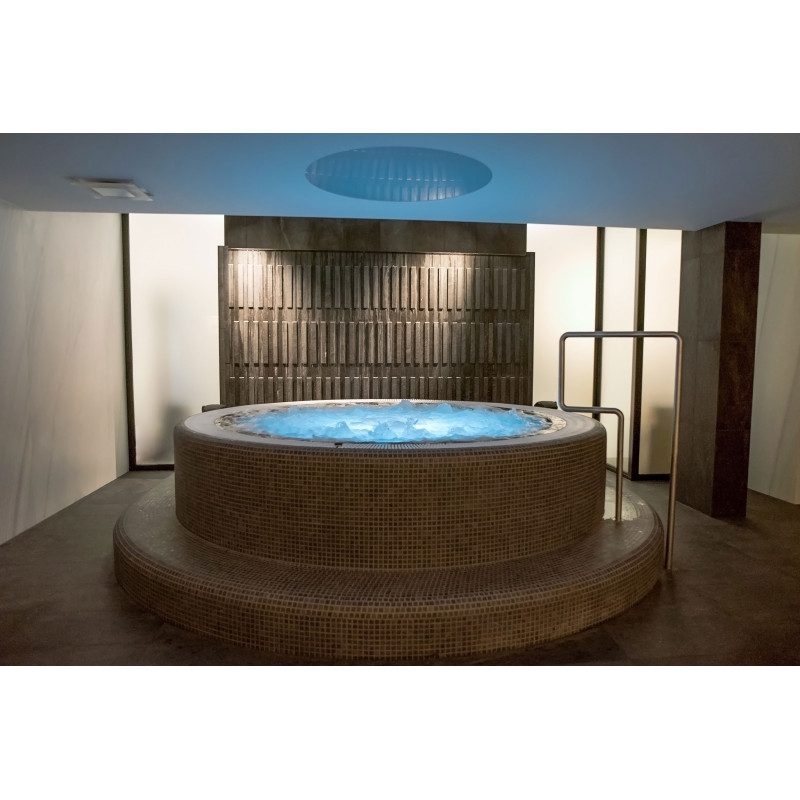 K dispozici je prostorný hydromasážní bazén, jehož formy jsou vyrobeny z pěnového polystyrenu na individuální objednávku. Bazén je pokryt malými mozaikovými dlaždicemi, které ladí s interiérem v neutrálních barvách. Kolem bazénu je schůdek, nerezové madlo pro snadný a bezpečný vstup do bazénu.