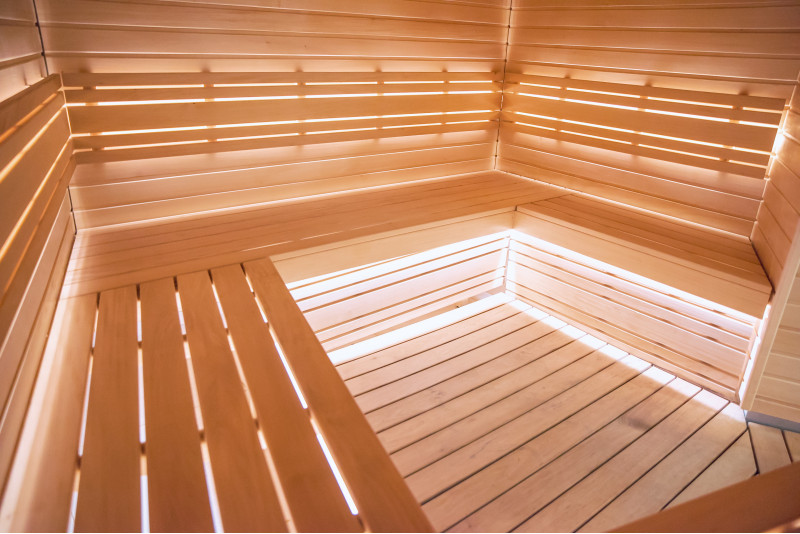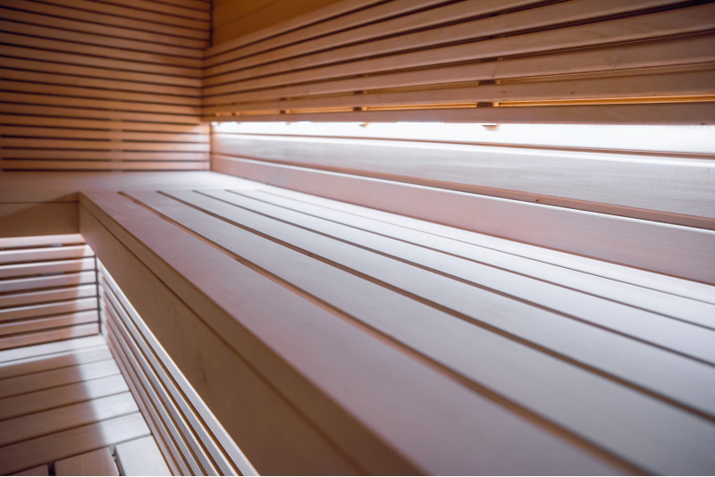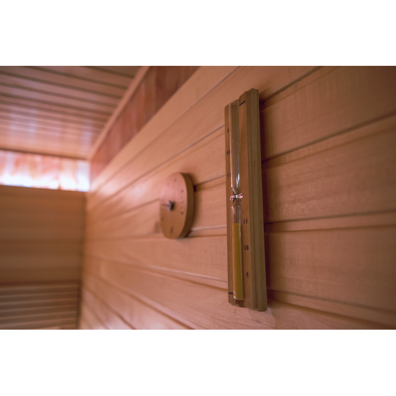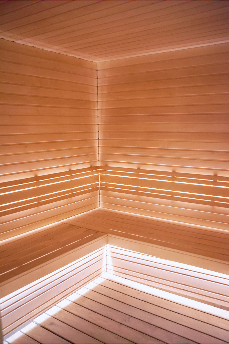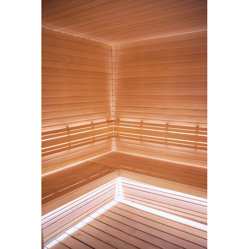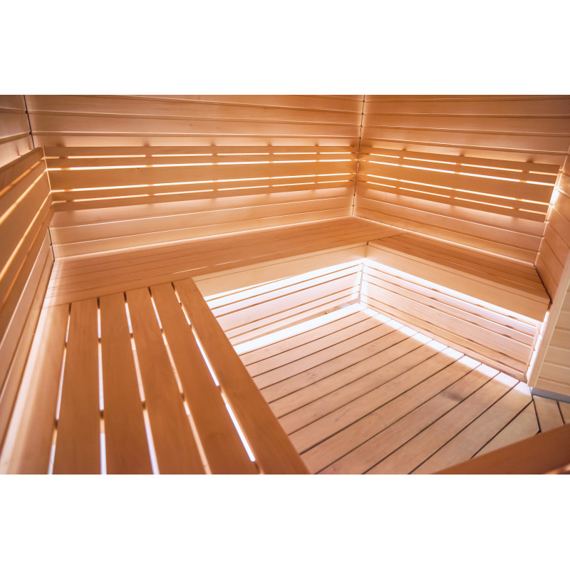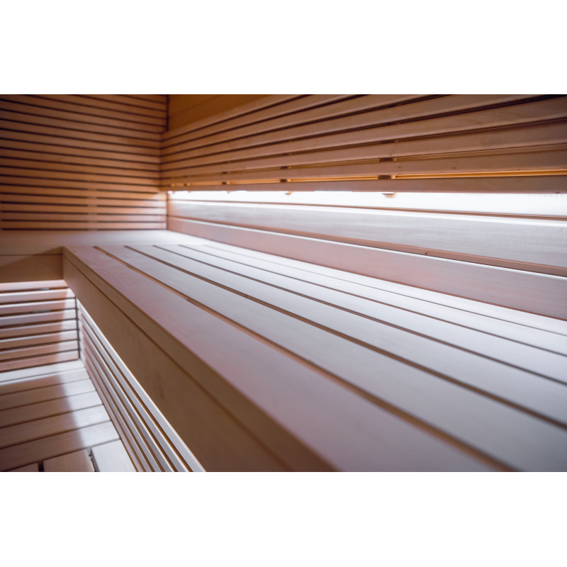 Pro saunová lůžka, opěrky zad, strop sauny a stěnové panely bylo použito lipové dřevo typu A. Podlahový rošt je vyroben ze dřeva černé olše.