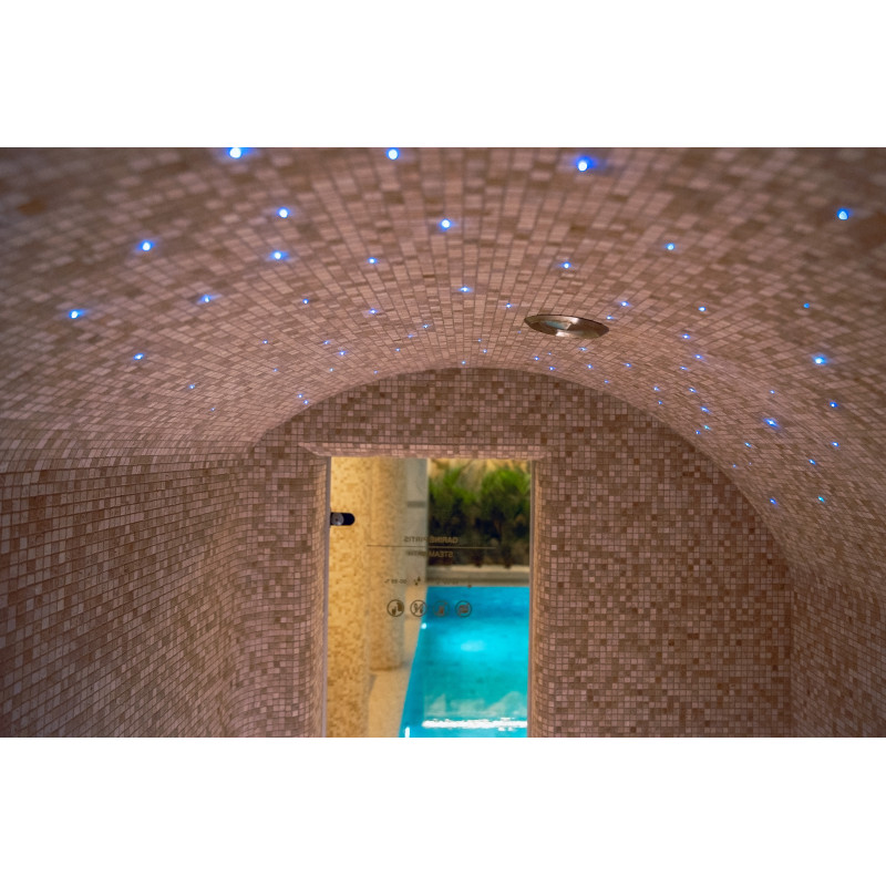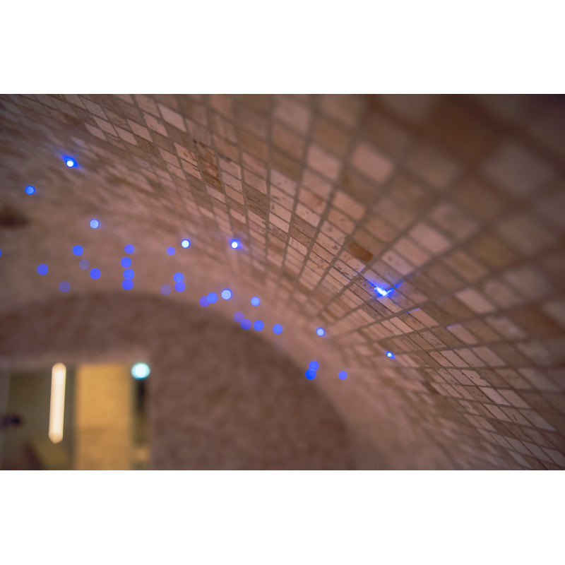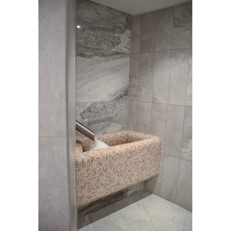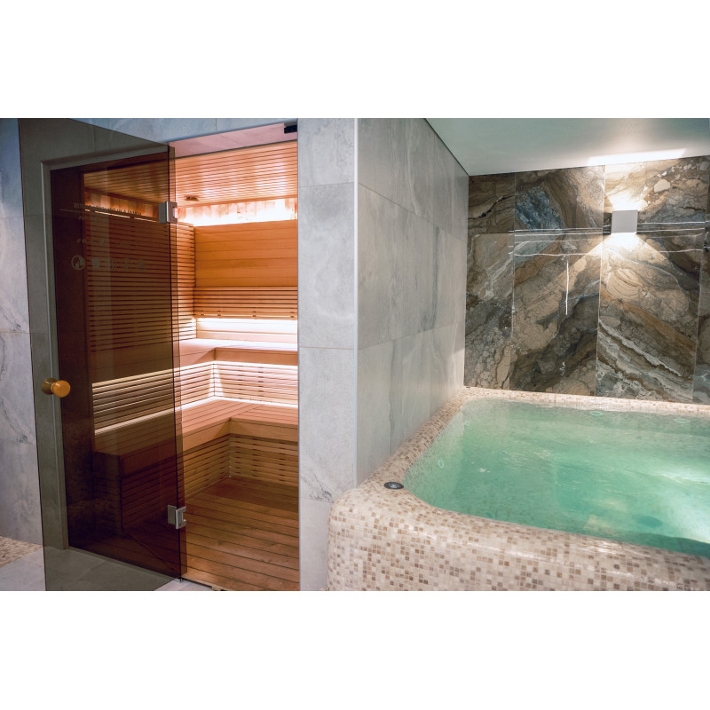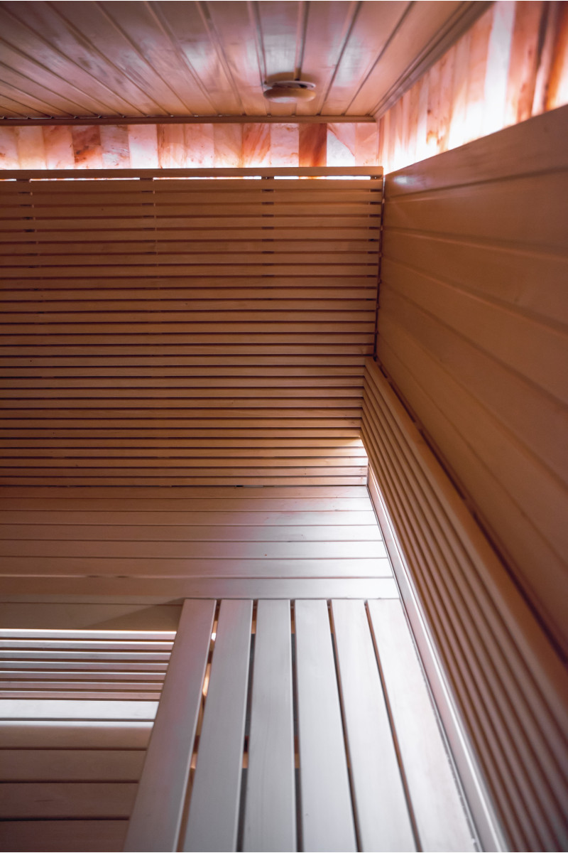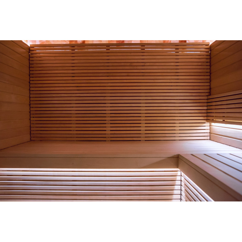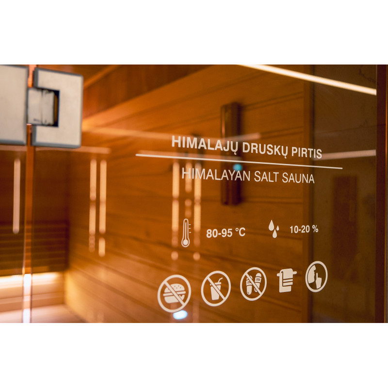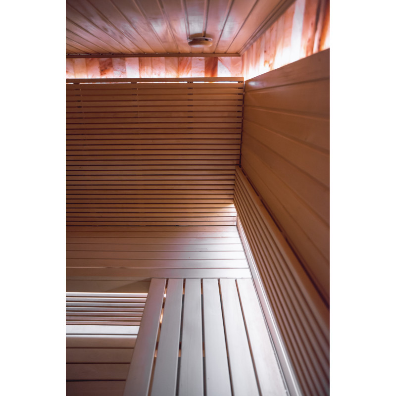 Obkladová stěna z himalájské soli v moderní sauně je vynikajícím řešením jak z hlediska estetiky, tak i zlepšení zdraví. Na stěně těsně u stropu se po celém obvodu sauny vytvoří pruh himalájské soli ve výšce 20 cm. Za solnými dlaždicemi je instalováno LED osvětlení.