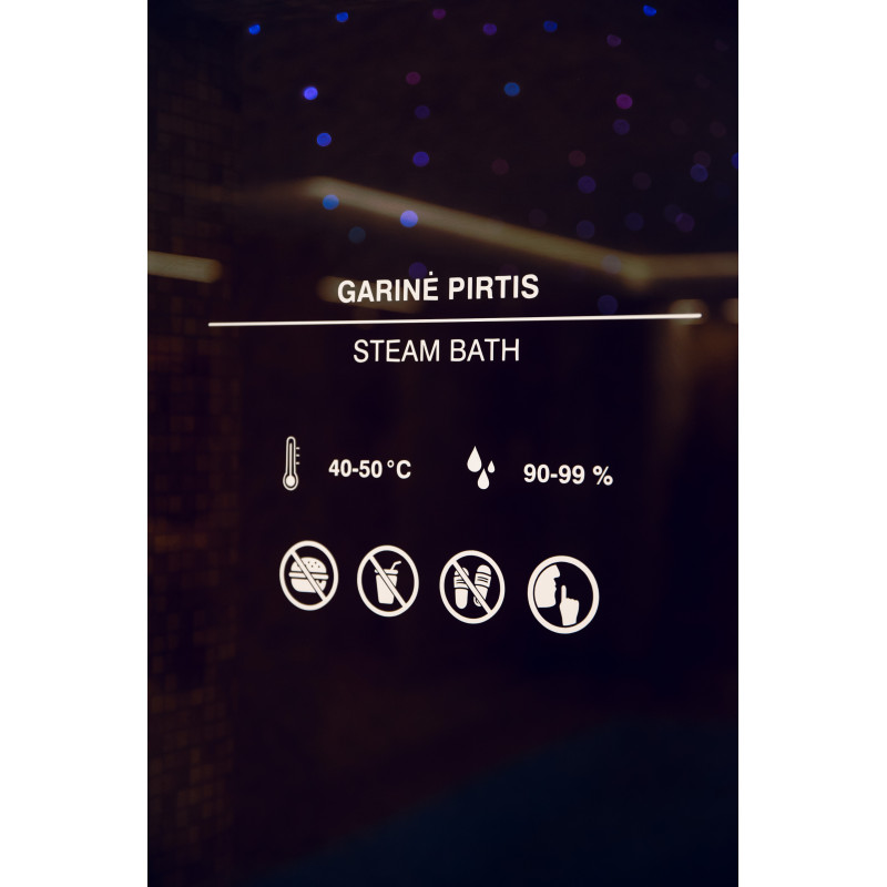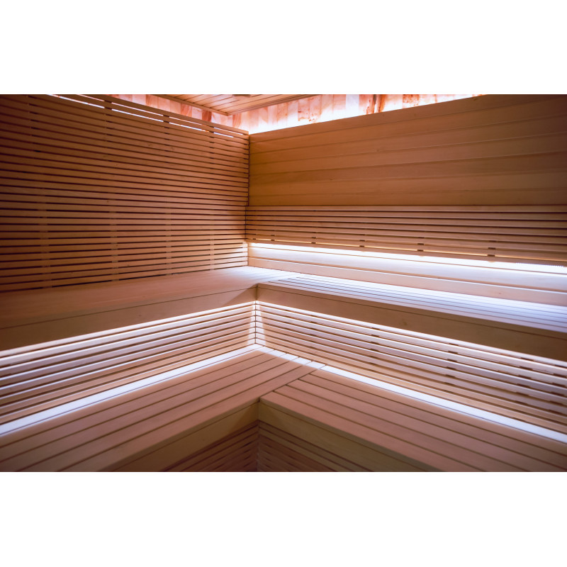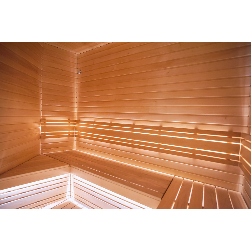 Sauna je vybavena ventilačním zařízením, LED osvětlením pod horními lůžky a v zádových opěrkách.