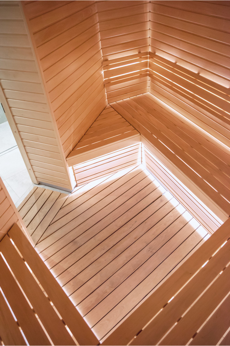 Dřevěné detaily interiéru sauny jsou vyrobeny z lipového dřeva.