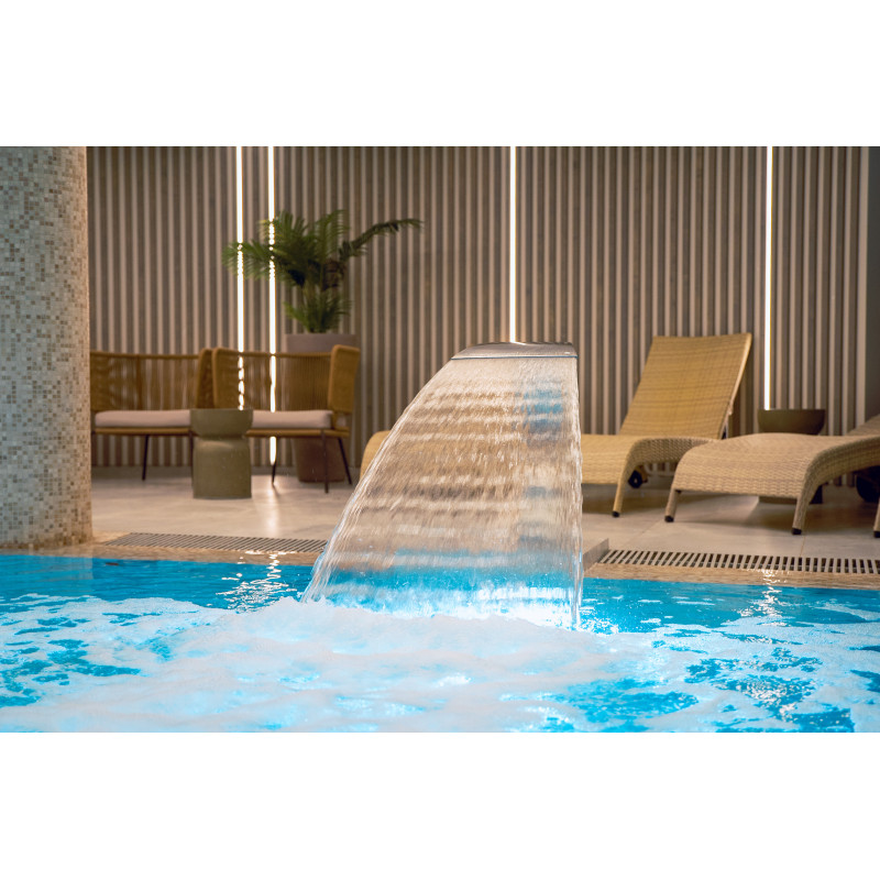 filtry, oběhové čerpadlo, masážní čerpadlo, automatická dávkovací stanice chemikálií, ohřívač vody, UV sterilizátor, LED podvodní reflektor, dvojité trysky voda-vzduch, vzduchové masážní trysky, přepadový rošt, kryt bazénu atd.