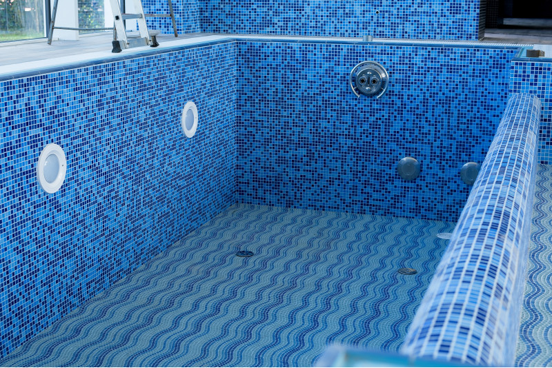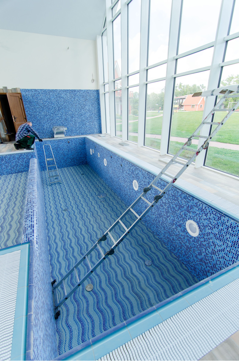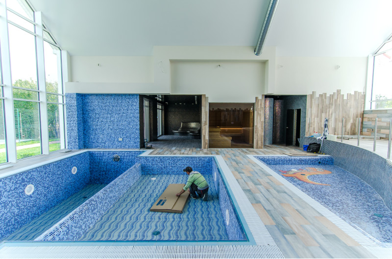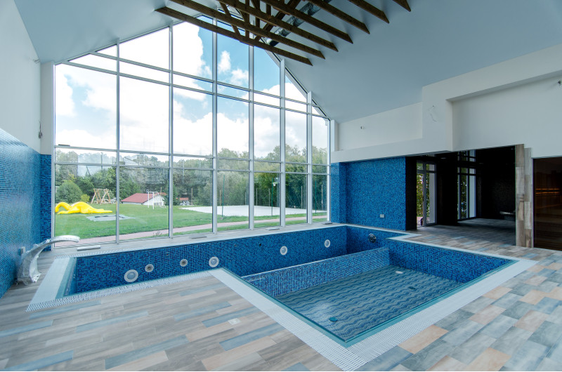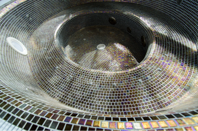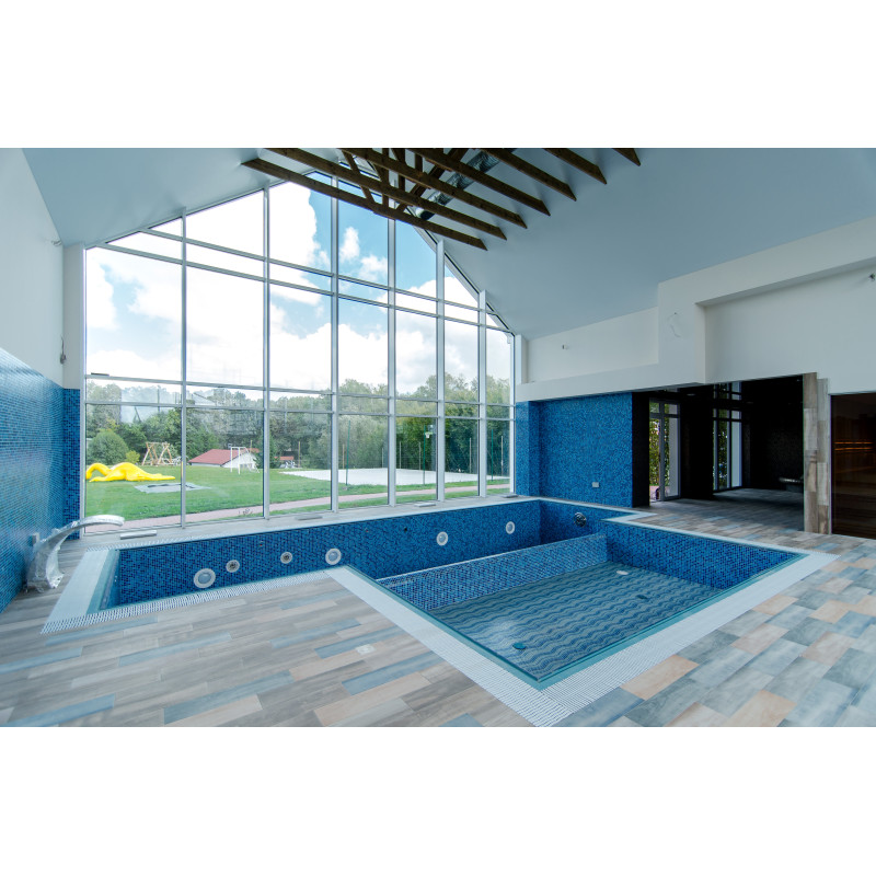 Hydromasážní bazén - 8 míst. Vybaveno betonem. Interiér je pokryt mozaikovými obklady. Podvodní LED svítidlo, masážní trysky, filtrační zařízení, automatické zařízení pro dávkování chemikálií.