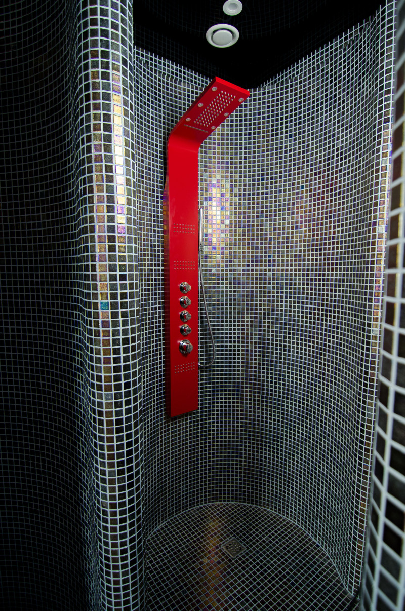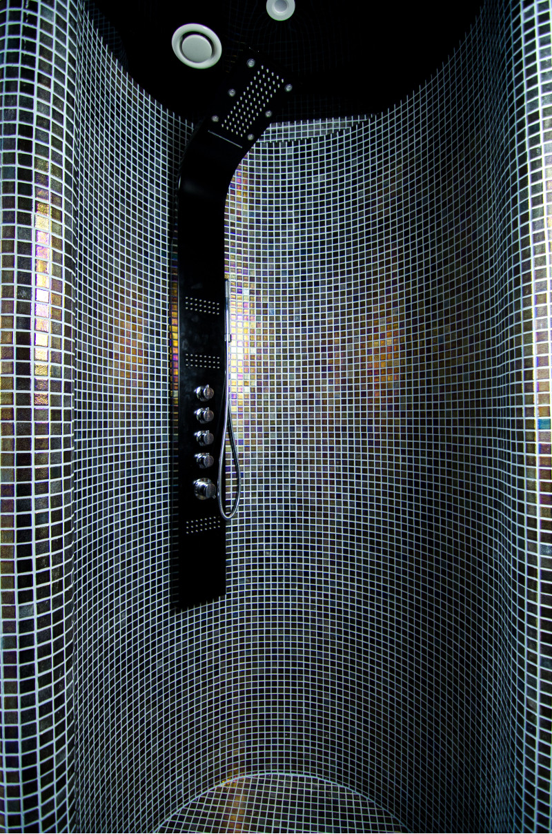 3 zakřivené sprchy. Vybaveno kulatými sprchovými kouty s výztuží a hydroizolací. Jedna ze sprch má dubové vědro s plastovou vložkou.