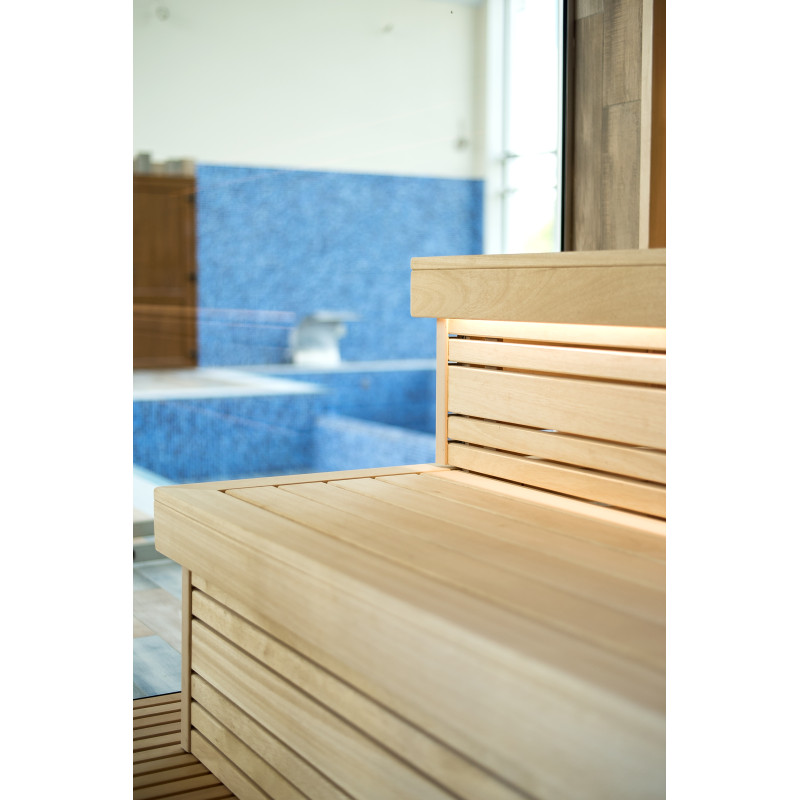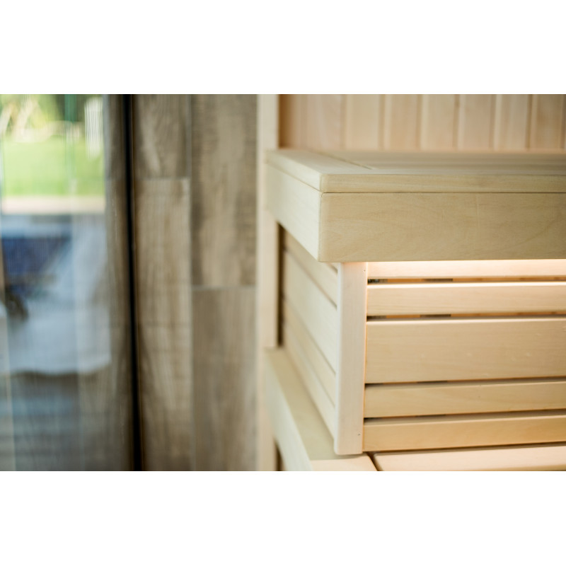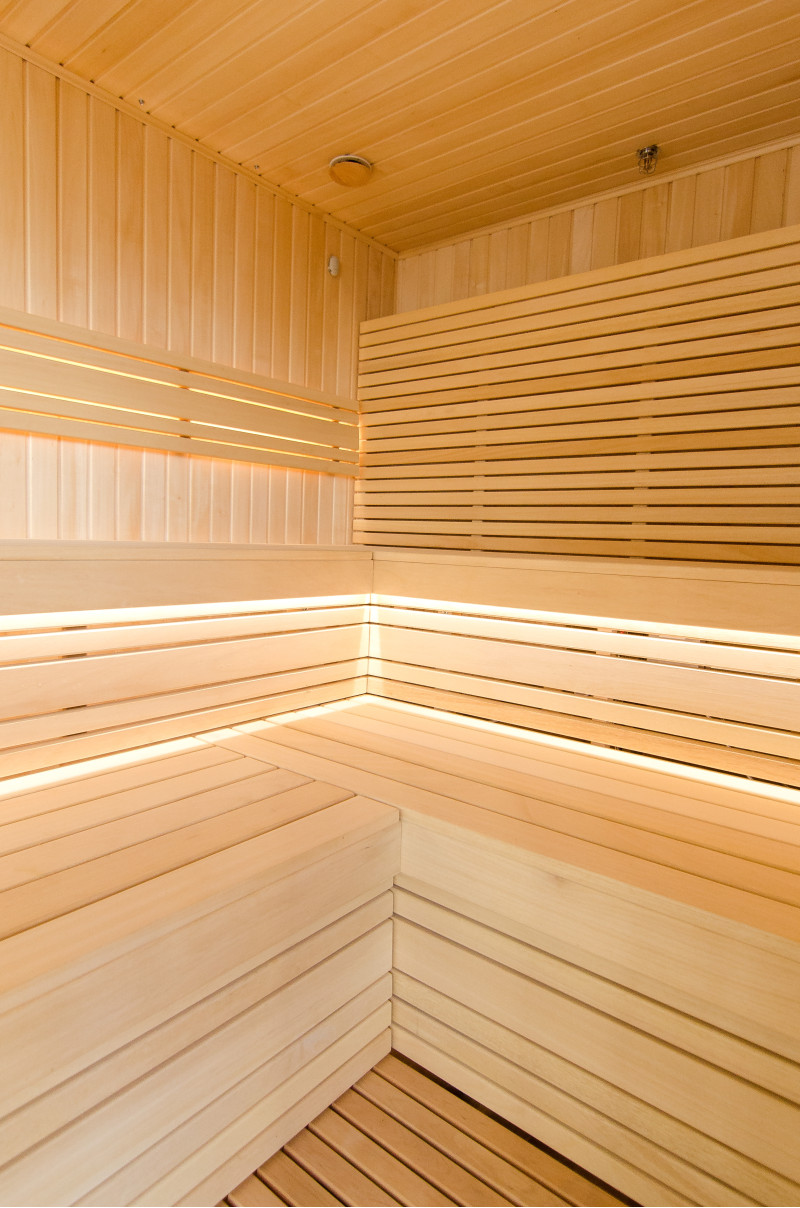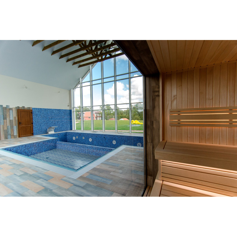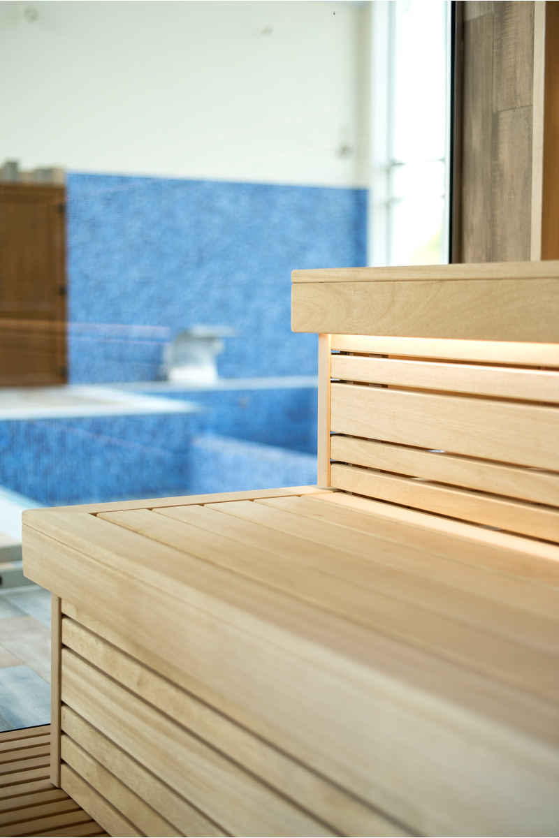 Sauna. Interiérové dřevěné detaily sauny jsou vyrobeny ze dřeva abachi, strop a stěny jsou z červencového dřeva. Funkce: