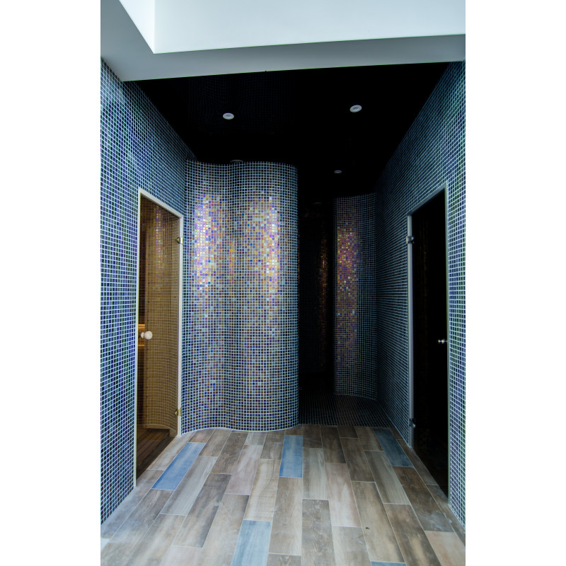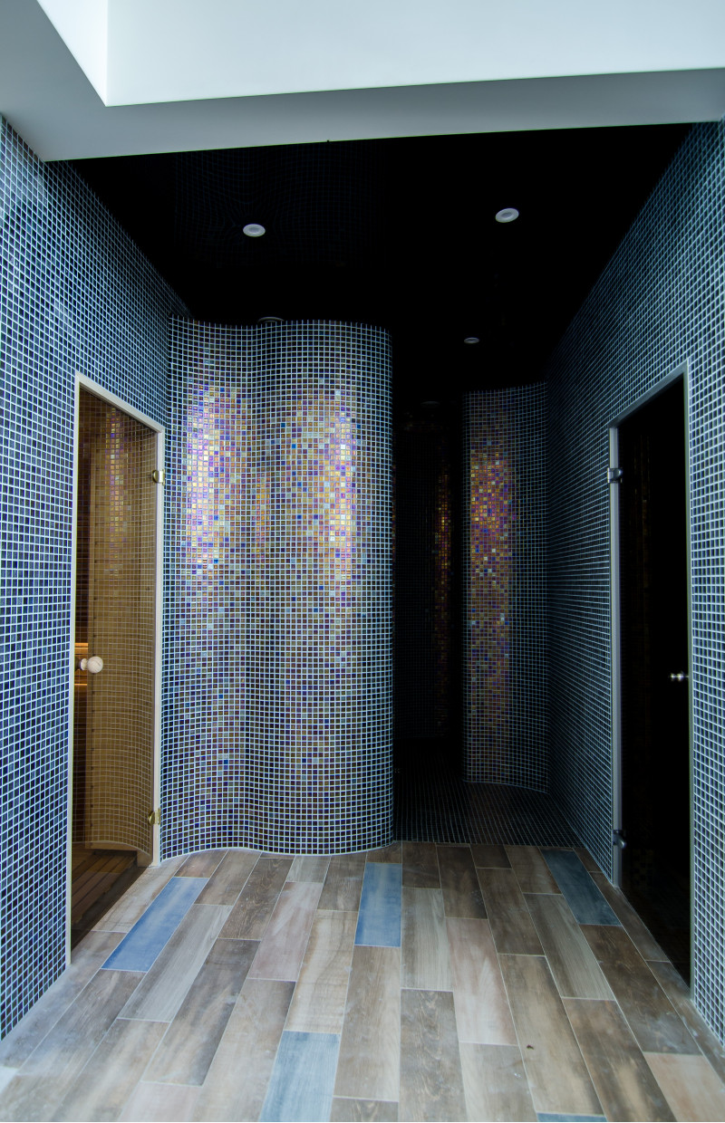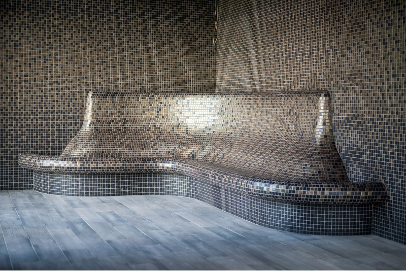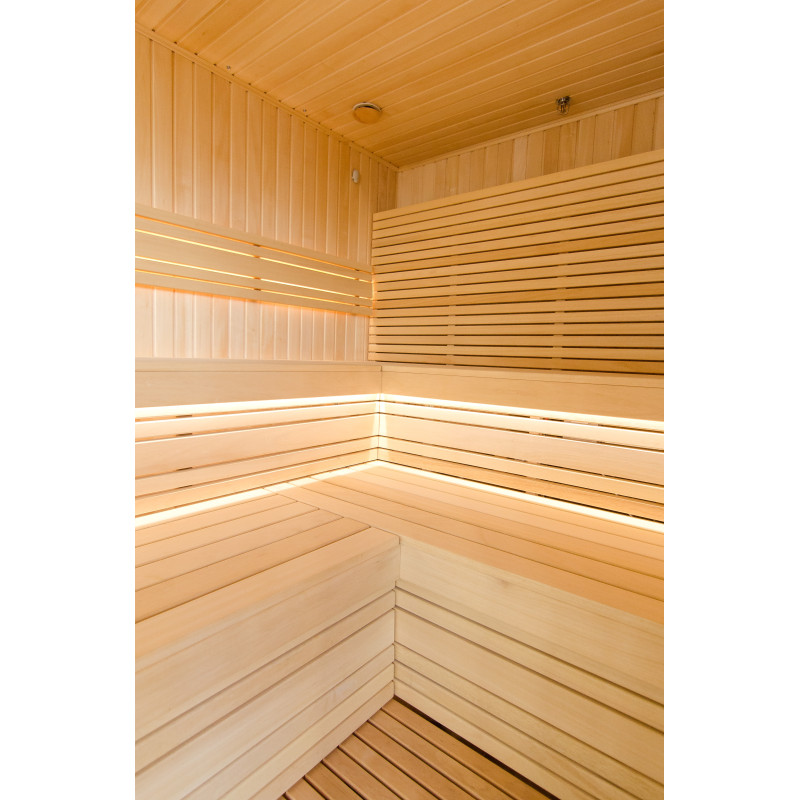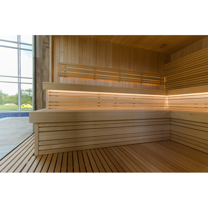 Sauna. Interiérové dřevěné detaily sauny jsou vyrobeny ze dřeva abachi, strop a stěny jsou z červencového dřeva. Funkce: